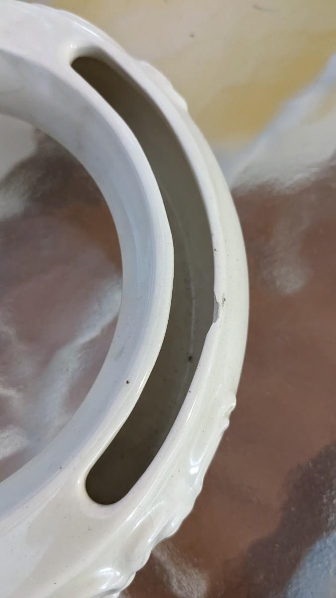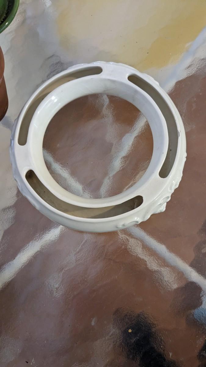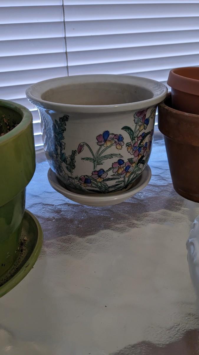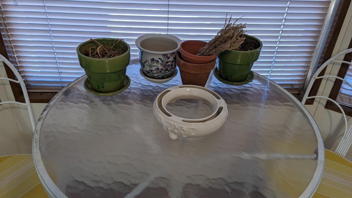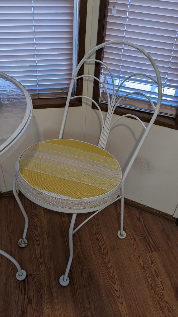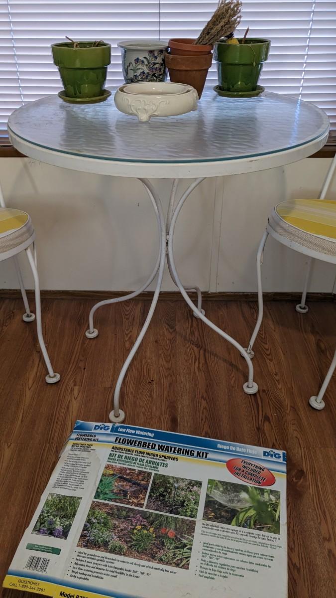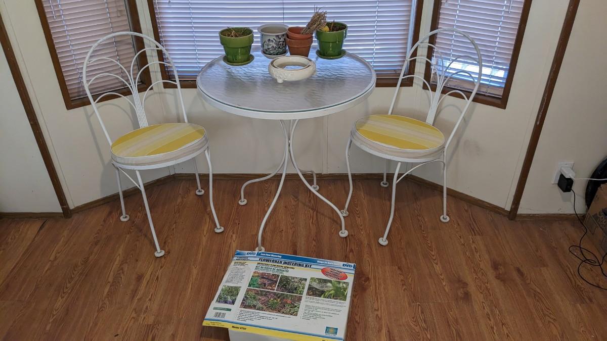 27.75"x29.5" glass top patio table with mated 16"x 16"x 33" chairs, seat sits 19.5" from ground. Small pots, and antique West German bouquet holder also included. No shipping. winning bidder responsible for removal of all items. kitchen
