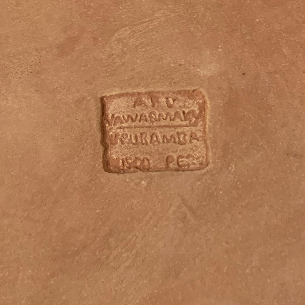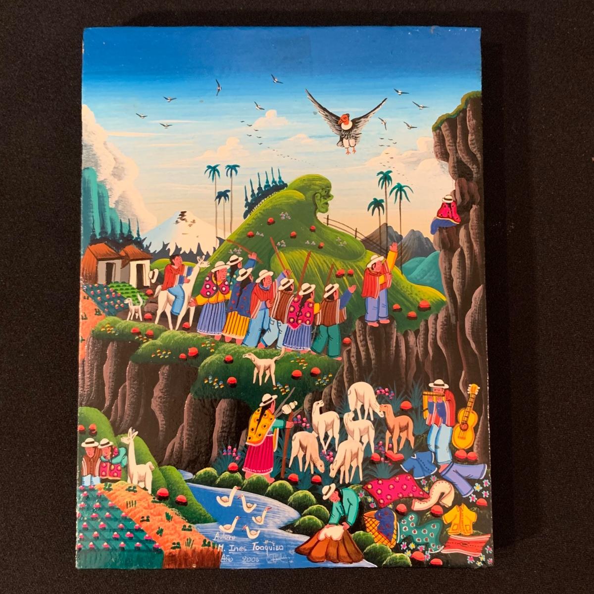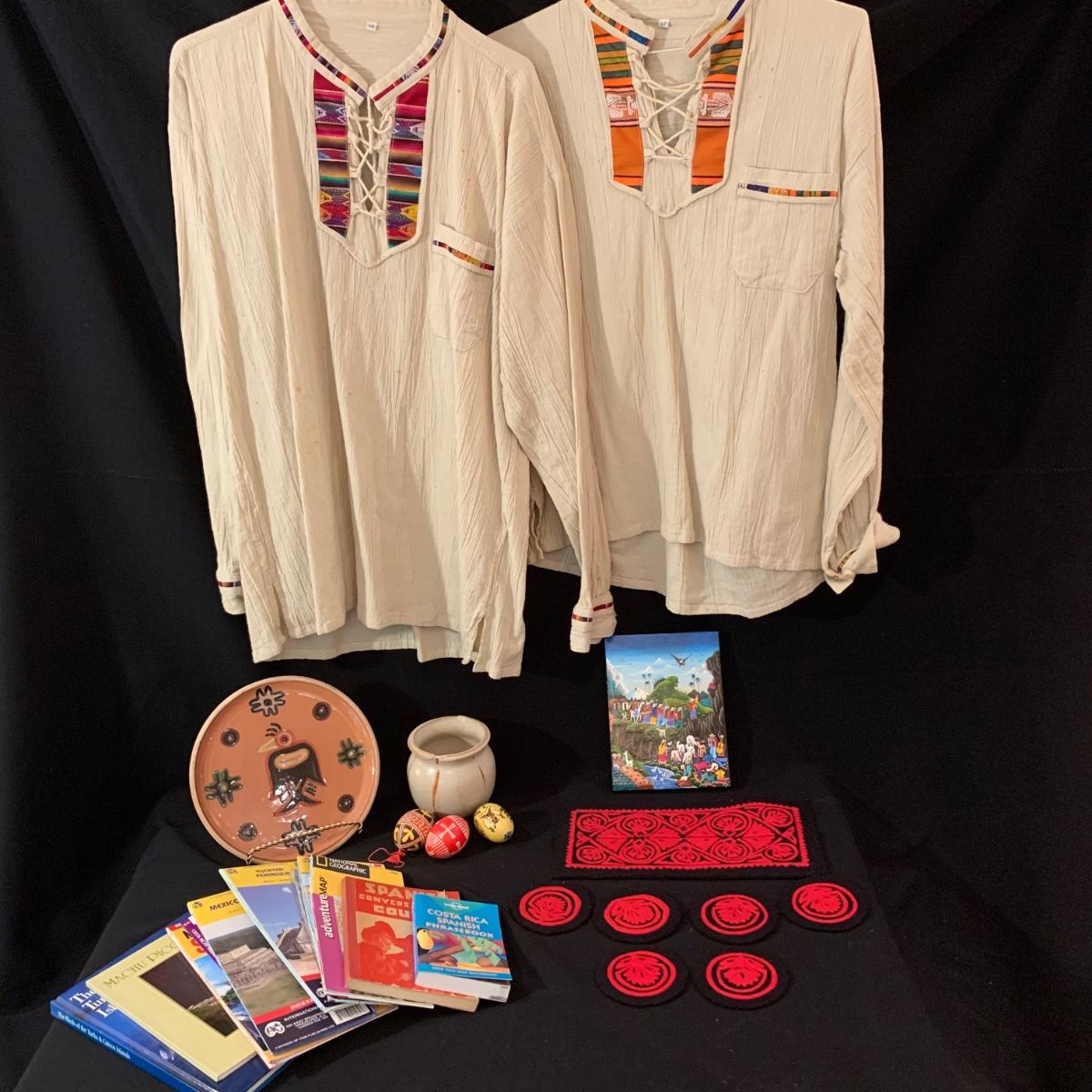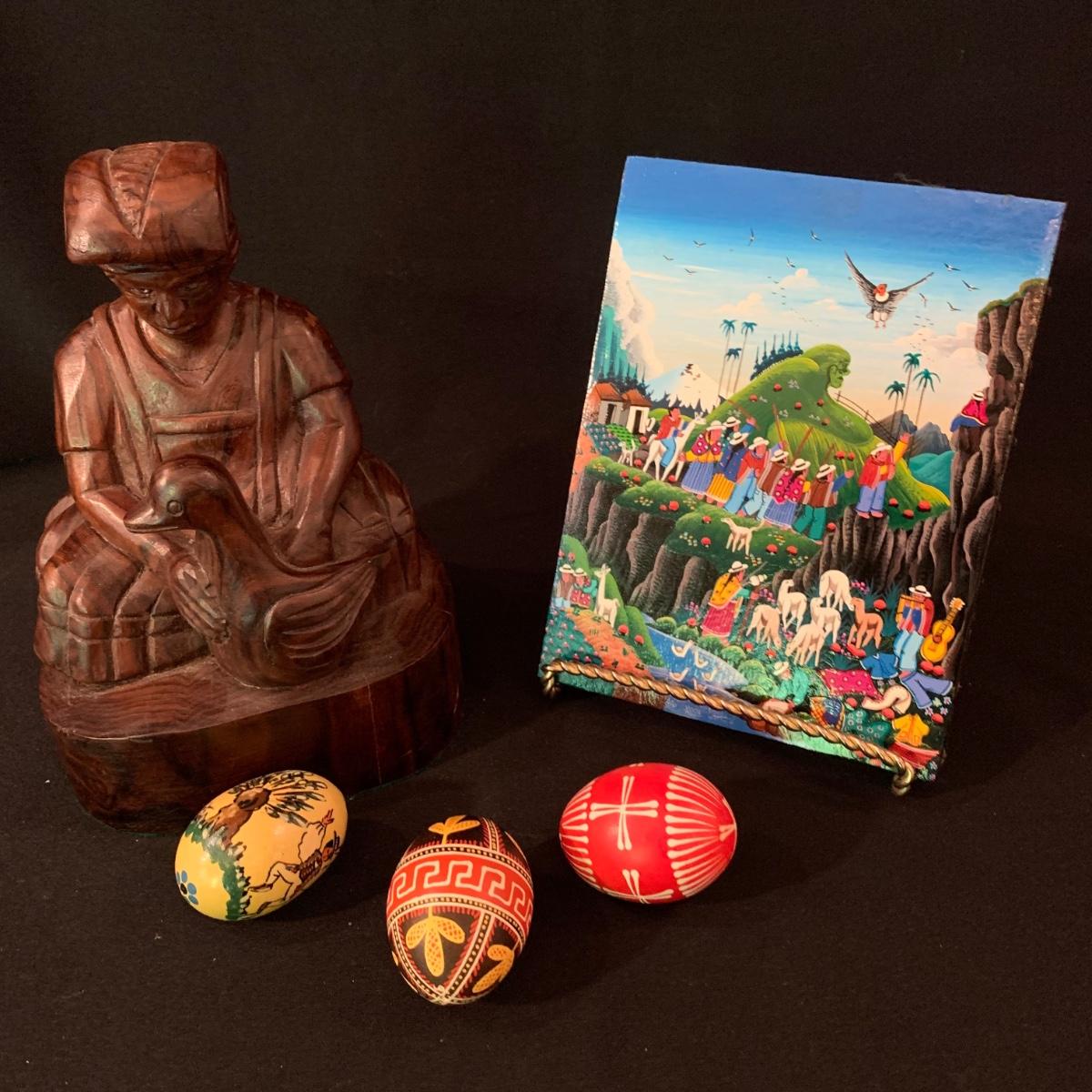 Lot of Peruvian-style collectibles includes three hand painted wood eggs, two Peruvian blouses, a variety of maps, and books, small hand painted picture, wood carved lady with duck, felt coasters, and small handmade plate. Lot also includes small potted vase, signed by Tommy Williams.