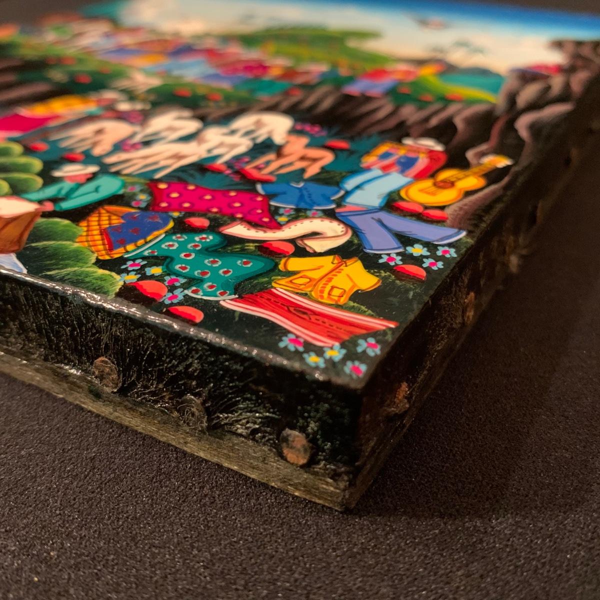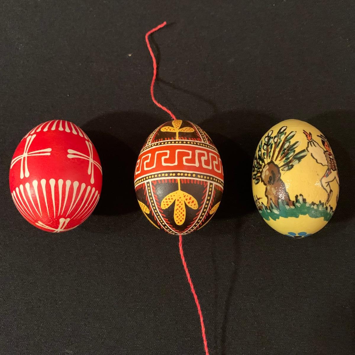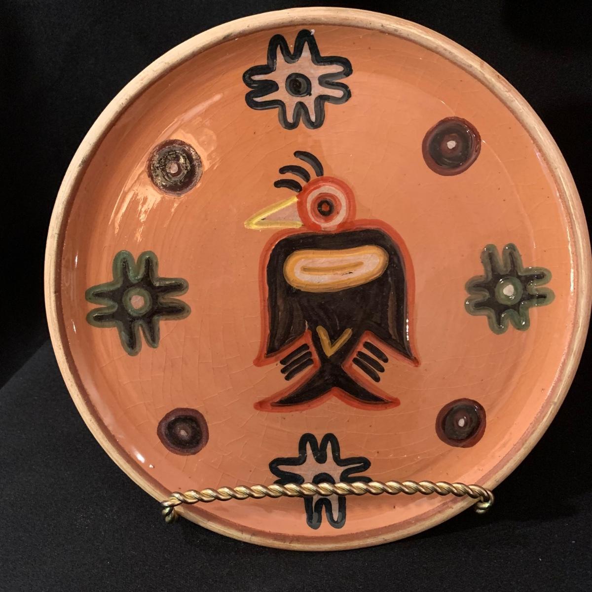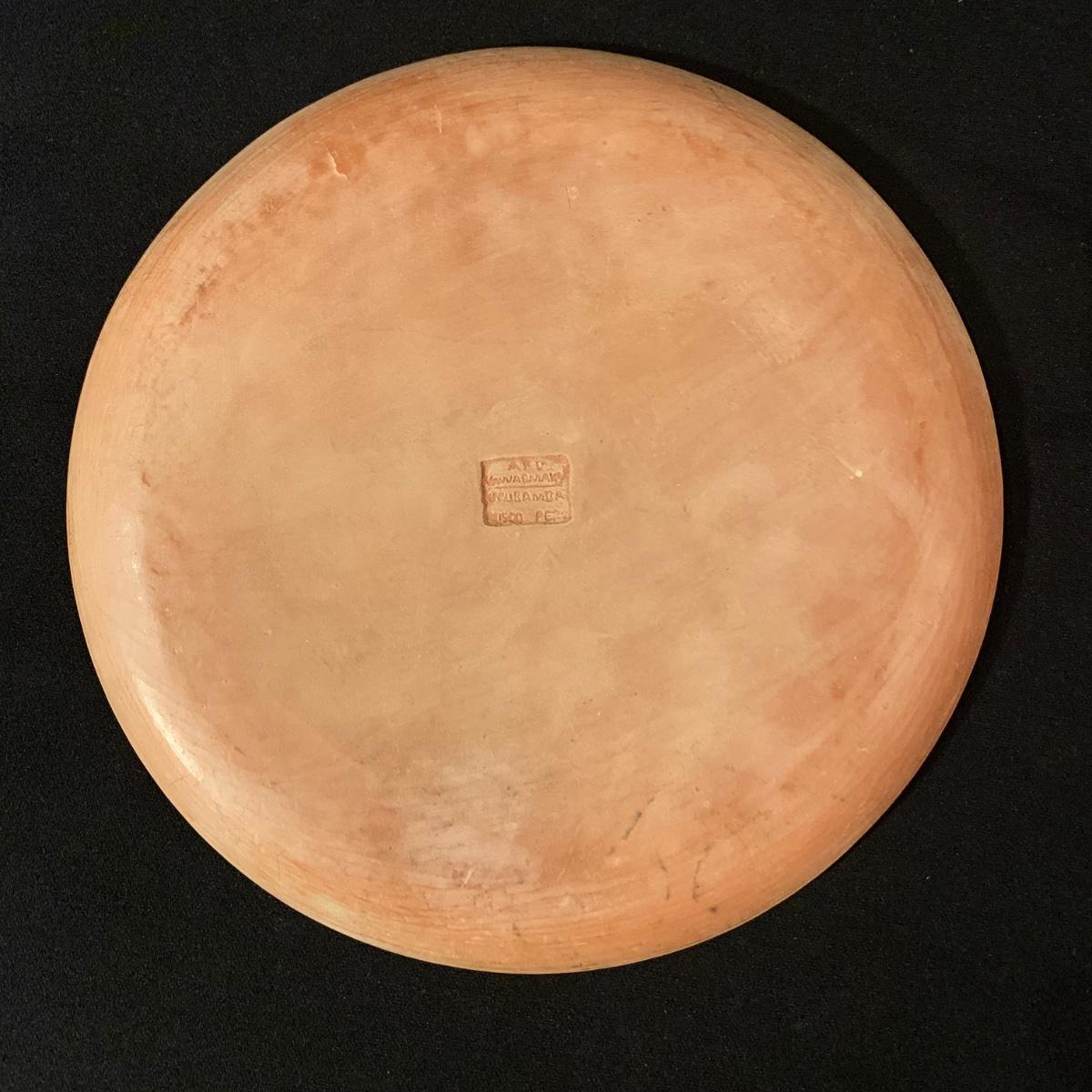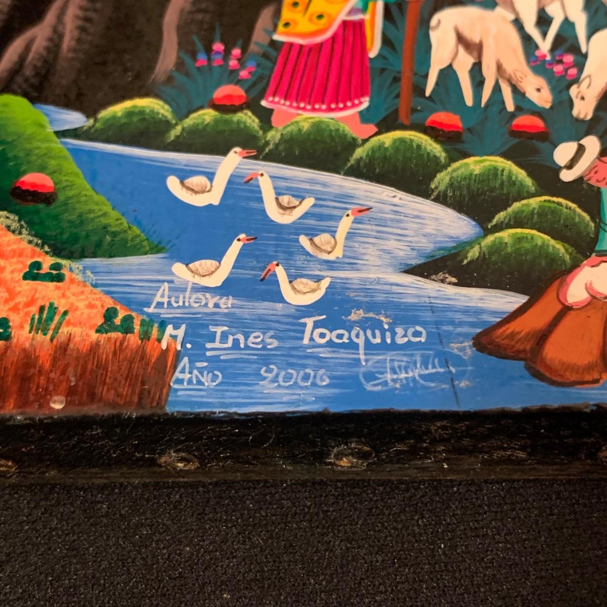 Lot of Peruvian-style collectibles includes three hand painted wood eggs, two Peruvian blouses, a variety of maps, and books, small hand painted picture, wood carved lady with duck, felt coasters, and small handmade plate. Lot also includes small potted vase, signed by Tommy Williams.