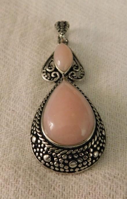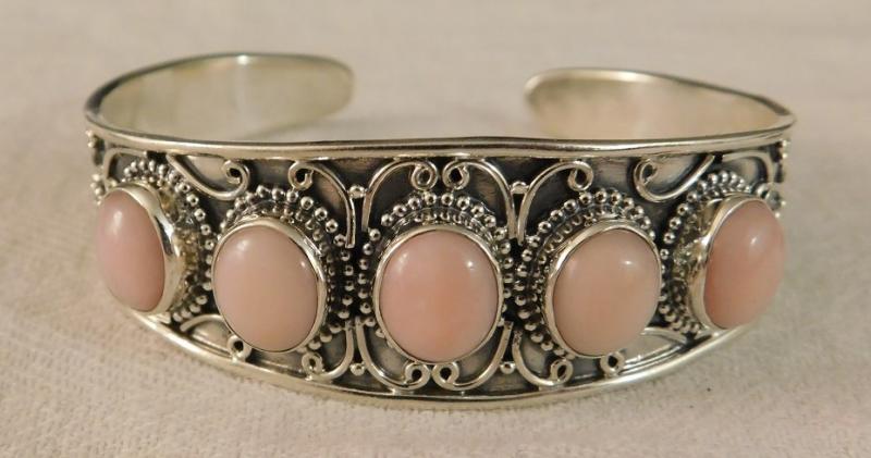 Peruvian Pink Opal Artisan Crafted Cuff, Earring, and Pendant Set. Cuff 6"-8", 2" pendant and 1 1/2" earrings with lever back. Sterling Silver