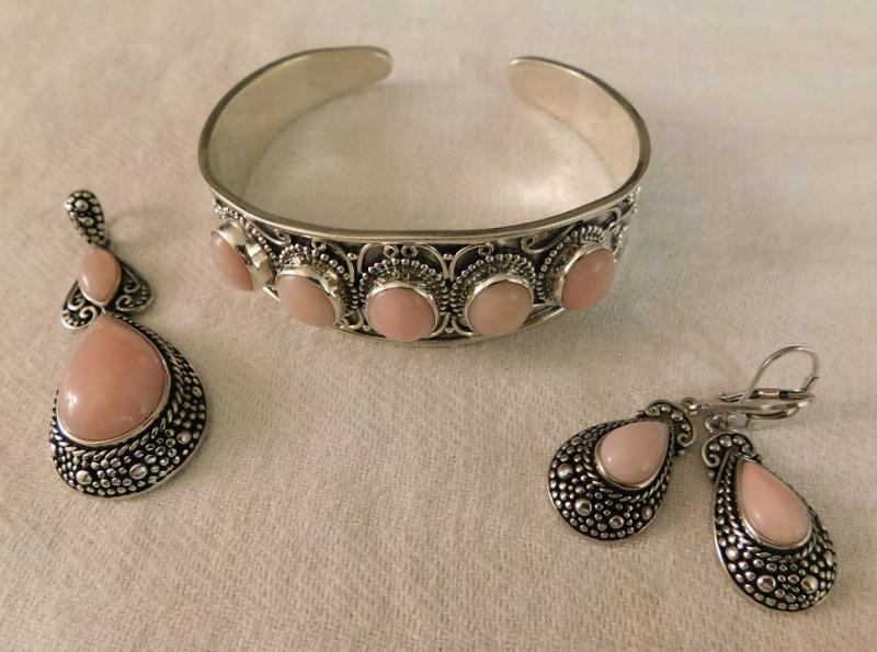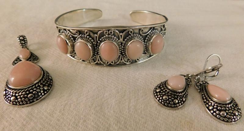 Peruvian Pink Opal Artisan Crafted Cuff, Earring, and Pendant Set