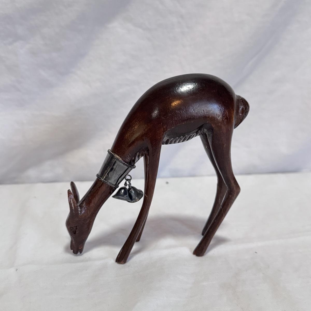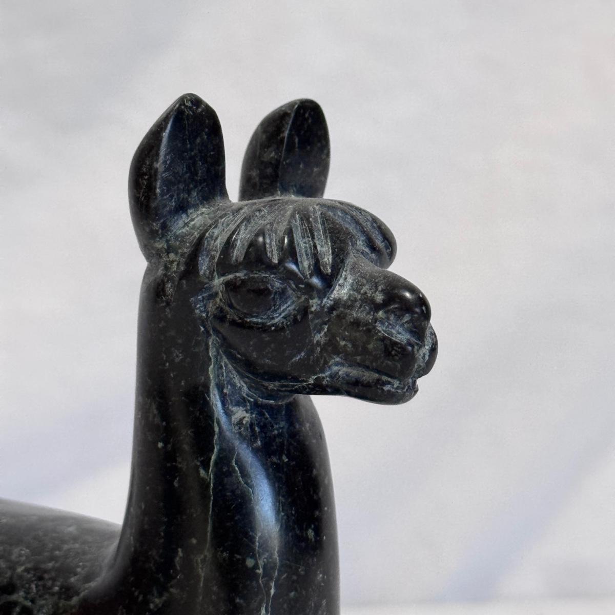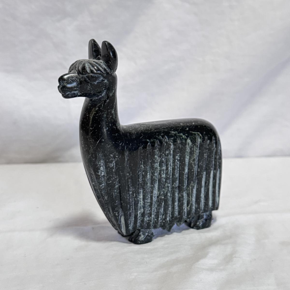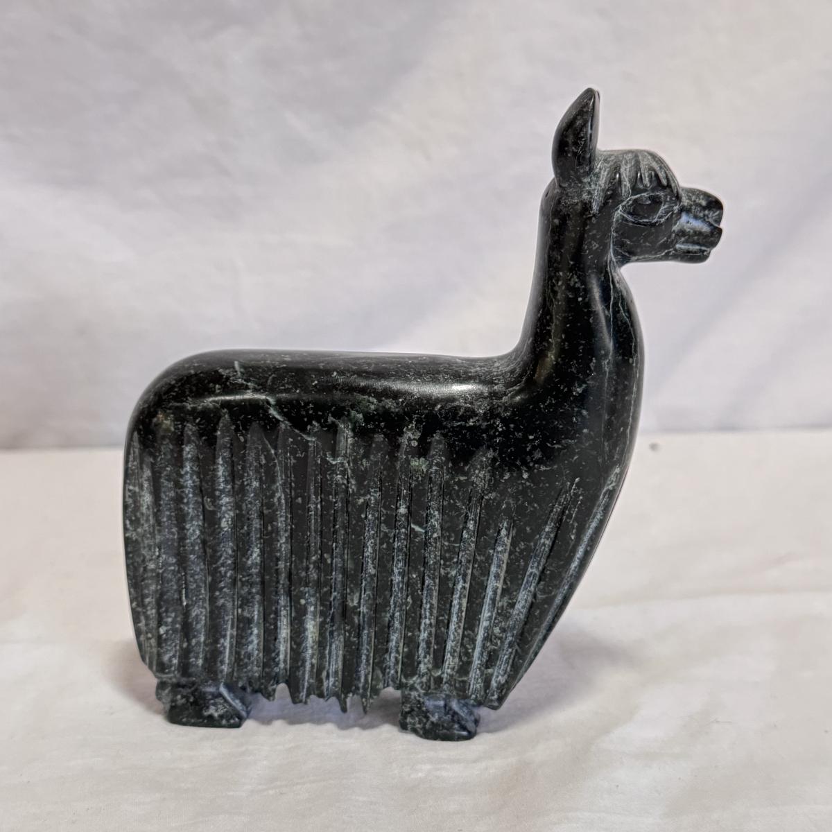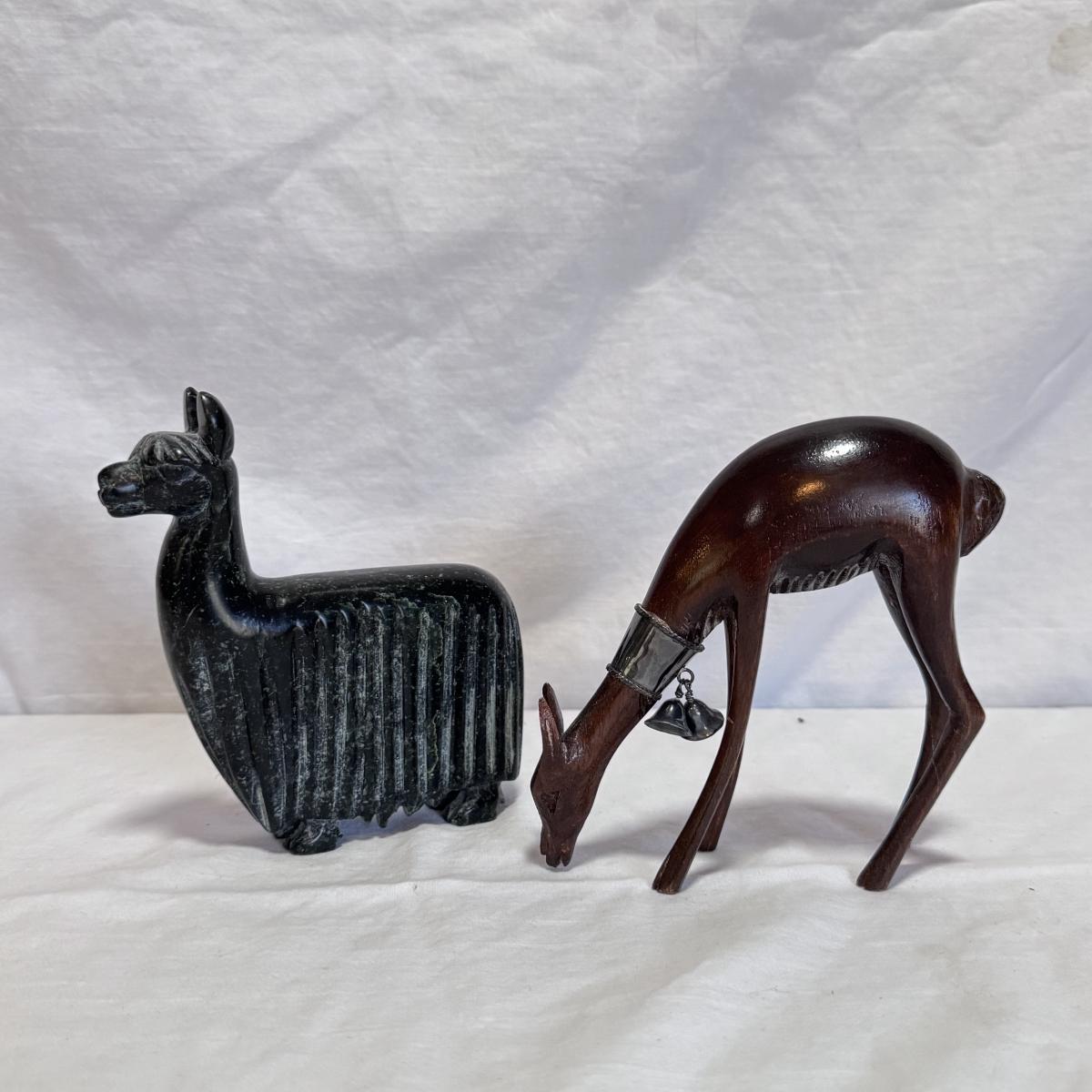 This lot includes one wooden, hand-carved deer figurine with a silver metal collar and a stone llama, maybe marble. Both were purchased in Peru per the homeowner. The llama measures 5” x 1” x 5”H. Shipping available.