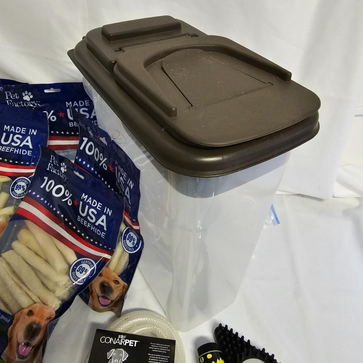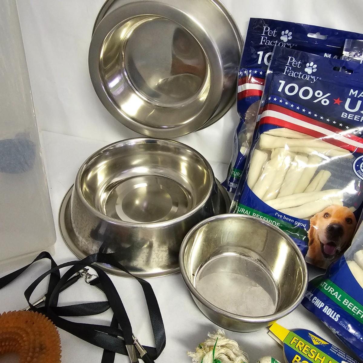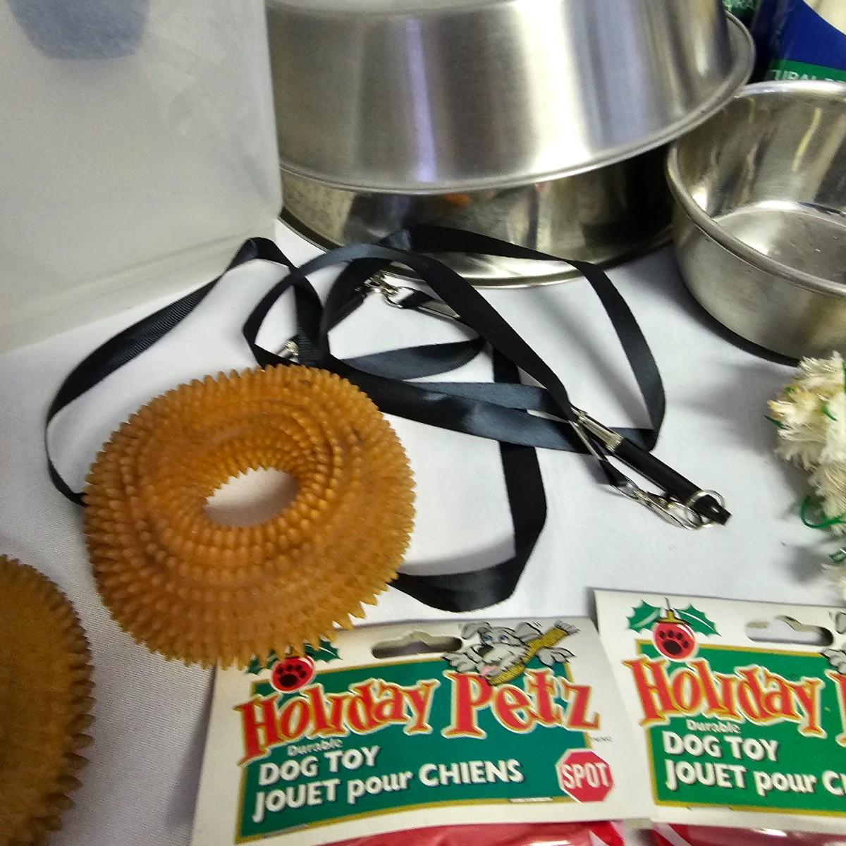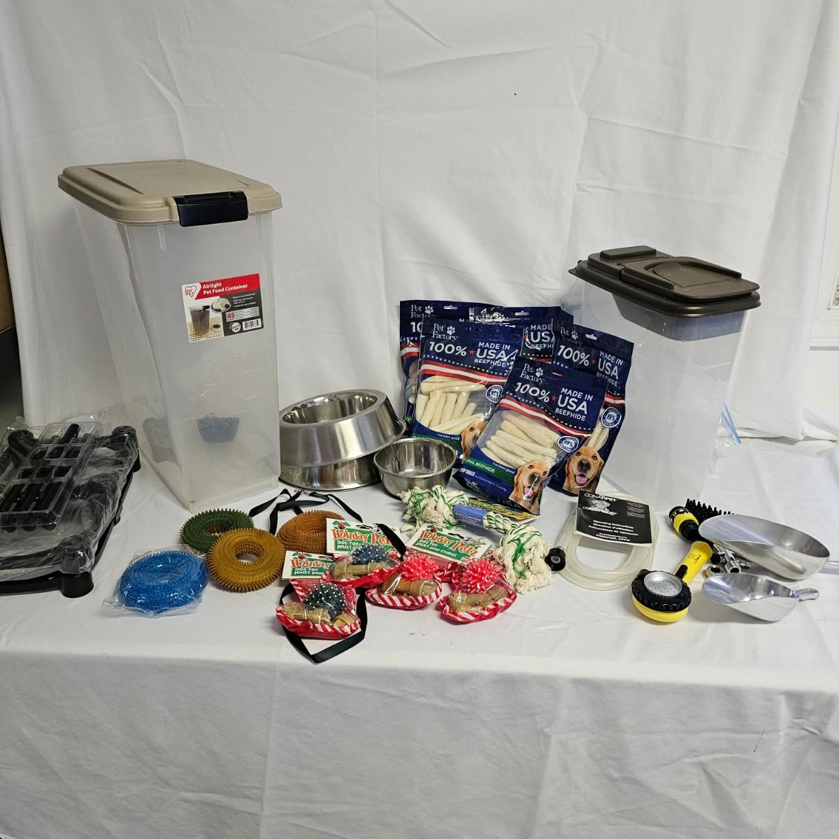 Multiple items for rover! Rawhide chews, rope chew, stainless steel food and water bowls, 11"D is the largest. Squeaky round toys, food scoops and storage containers; the largest is 45 qt. Conair Pet shower unit with hose and shower head. Two food/water bowl elevated stands. See photos for details. Local pickup only.