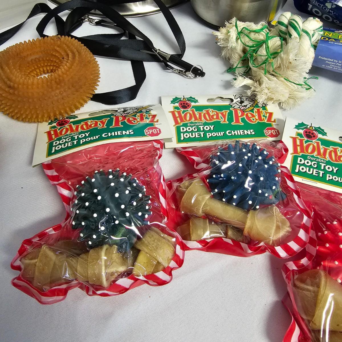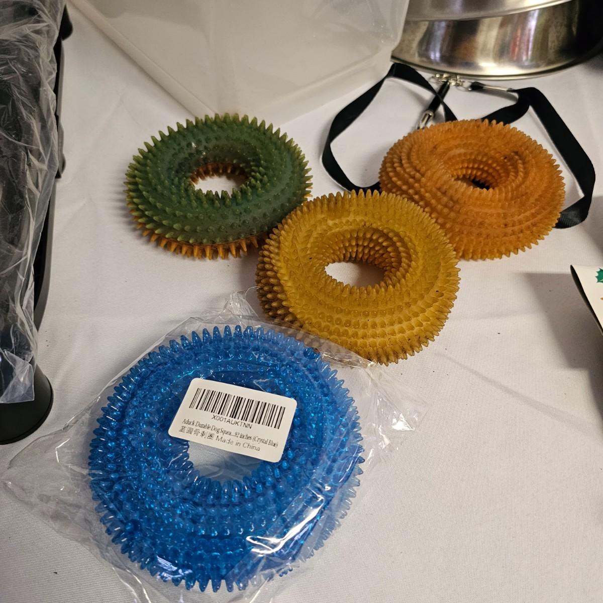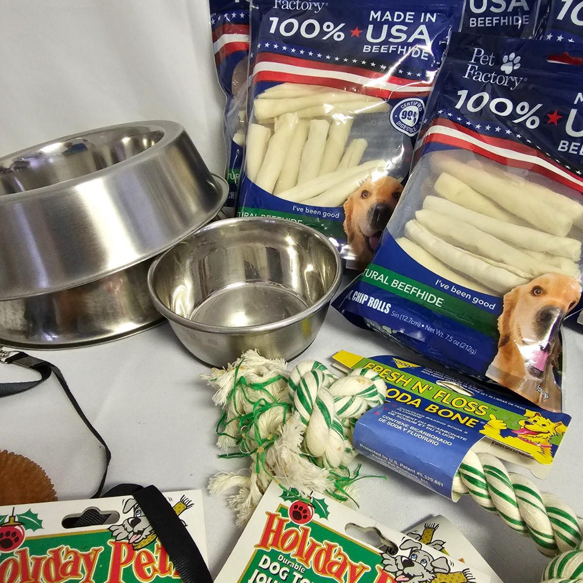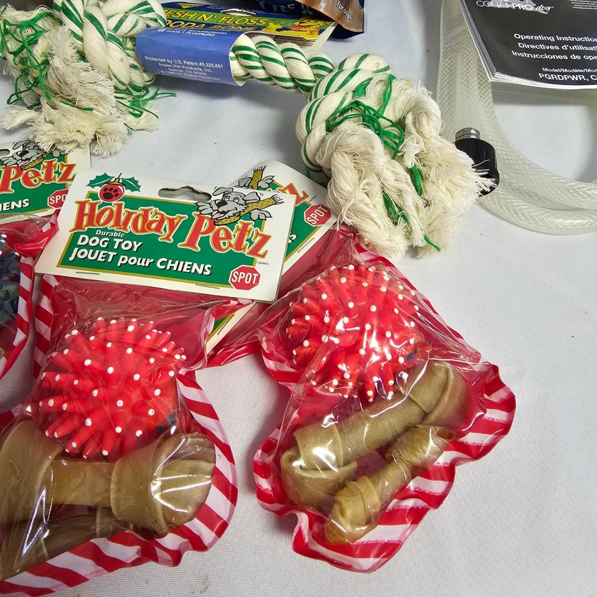 Multiple items for rover! Rawhide chews, rope chew, stainless steel food and water bowls, 11"D is the largest. Squeaky round toys, food scoops and storage containers; the largest is 45 qt. Conair Pet shower unit with hose and shower head. Two food/water bowl elevated stands. See photos for details. Local pickup only.