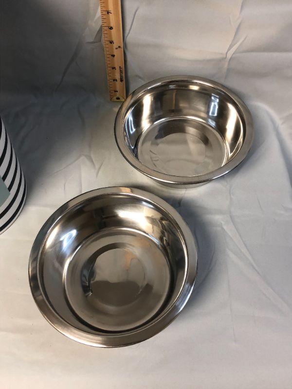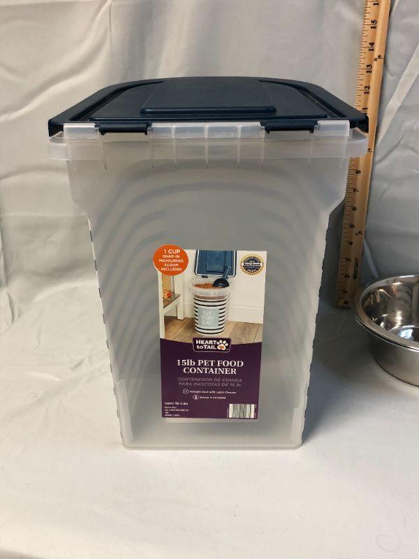 This container is very clean, it appears to have not been used, but I'm not 100%. It holds a 15 lb bag of pet food and includes a scoop that attaches to the lid. The two aluminum bowls also appear to have never been used.