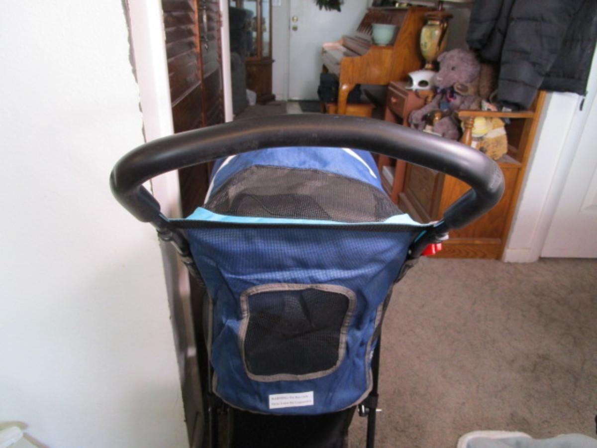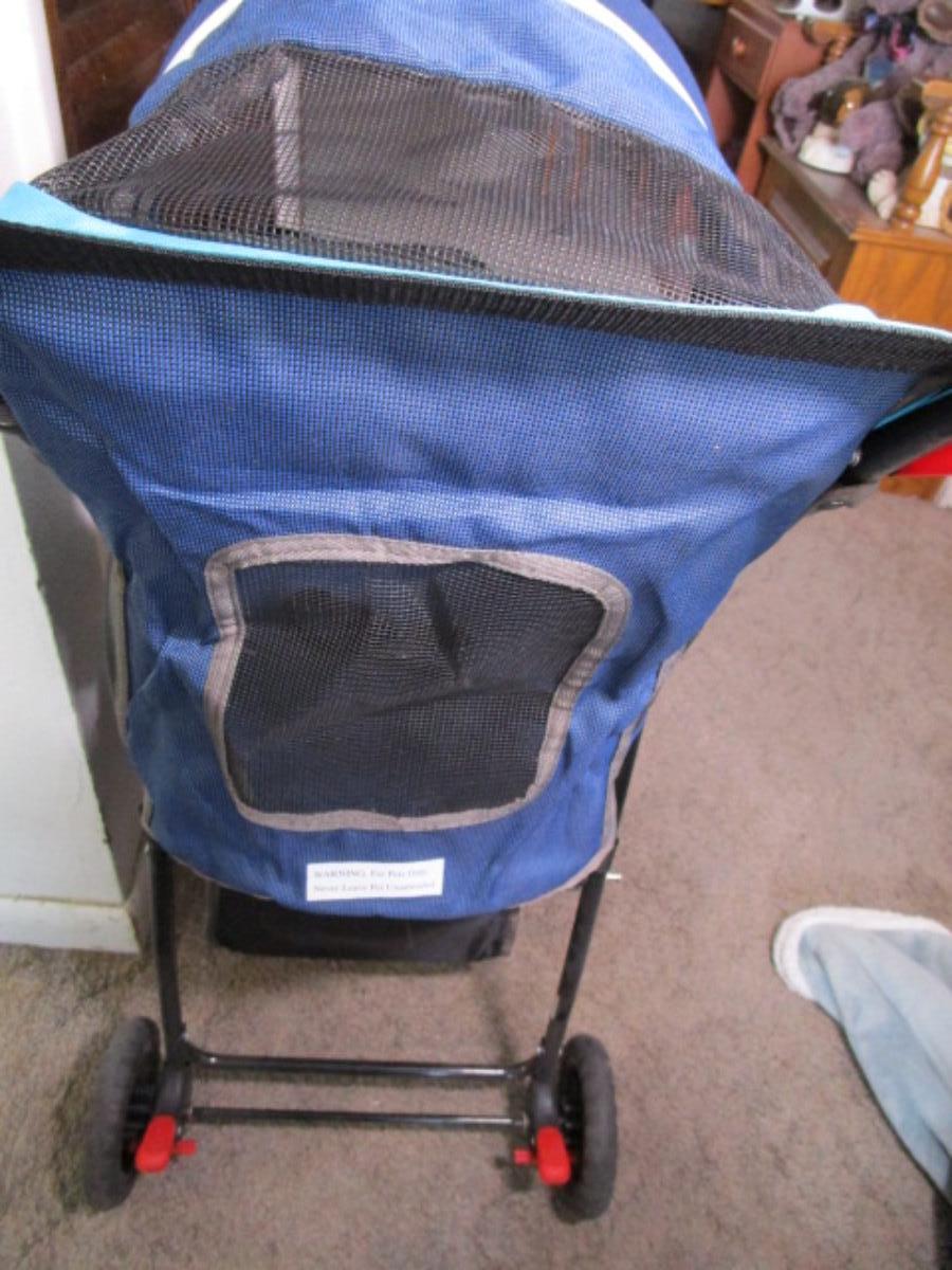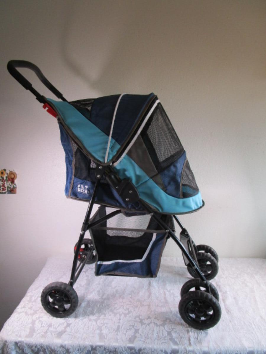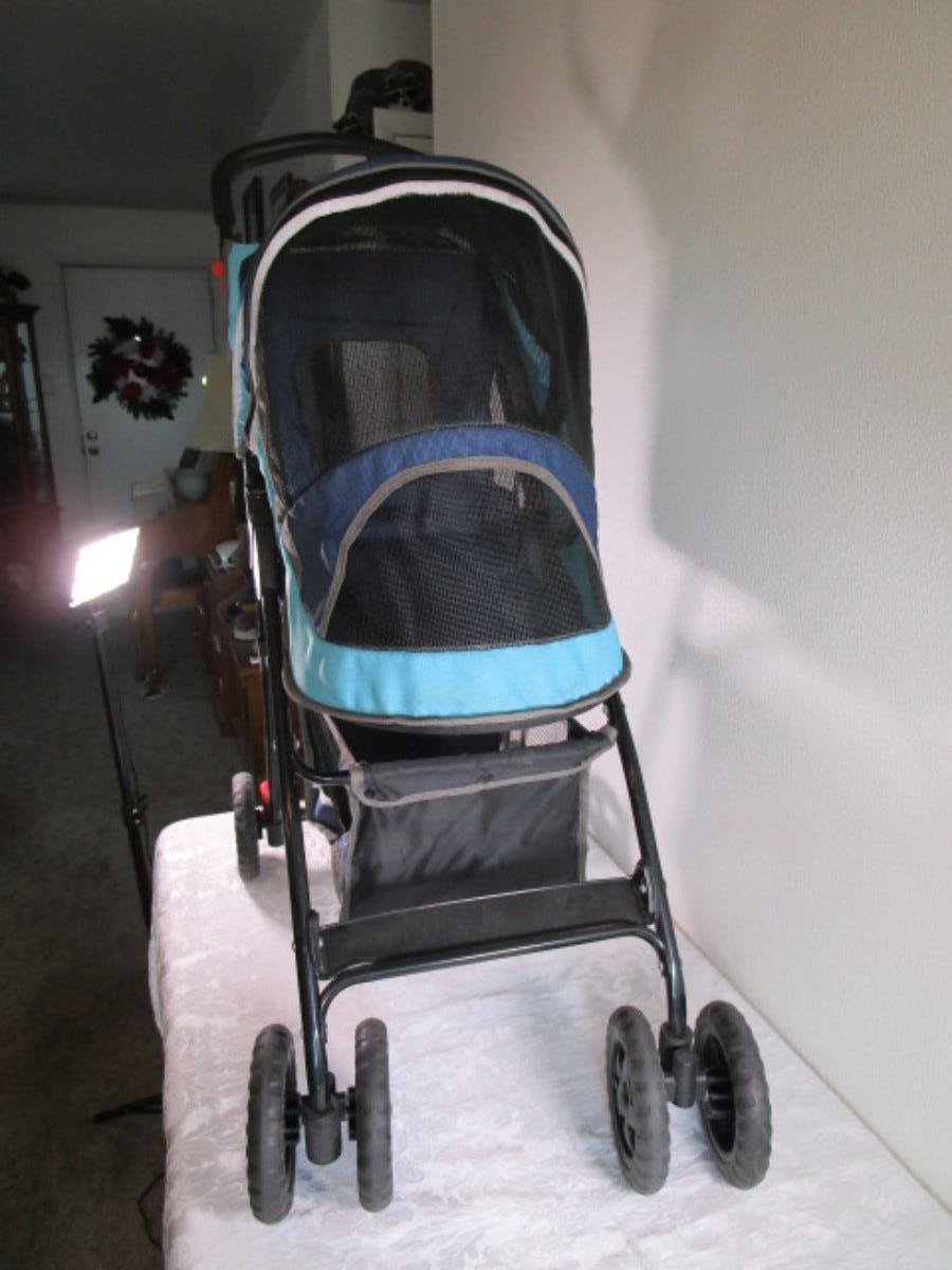 New condition, has sun shade, locking back wheels, storage bin underneath, strap & clip to attach to collar, folds down, light weight.