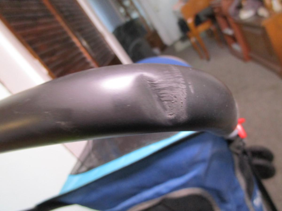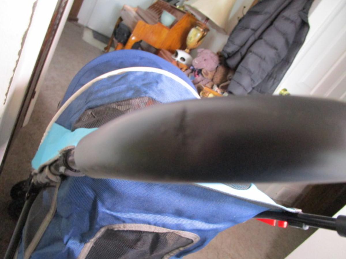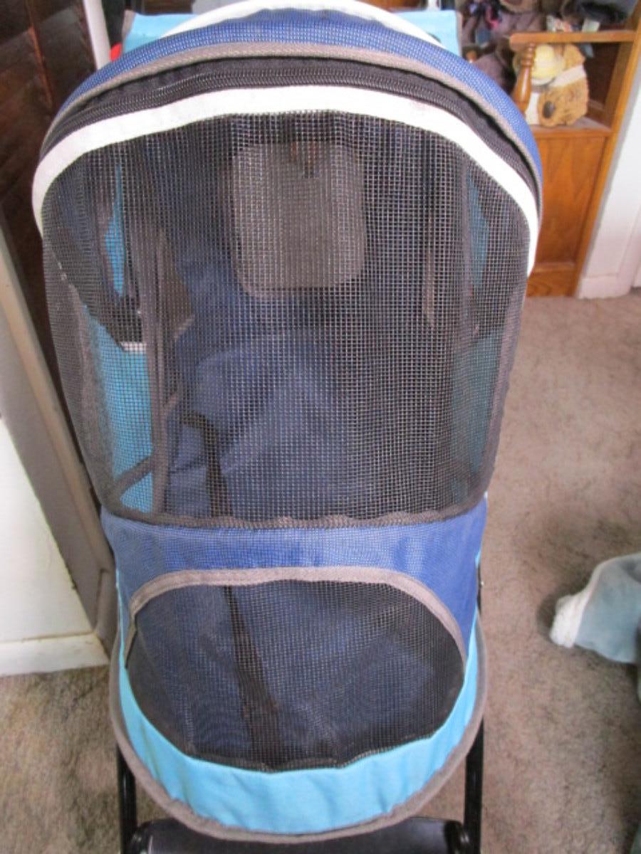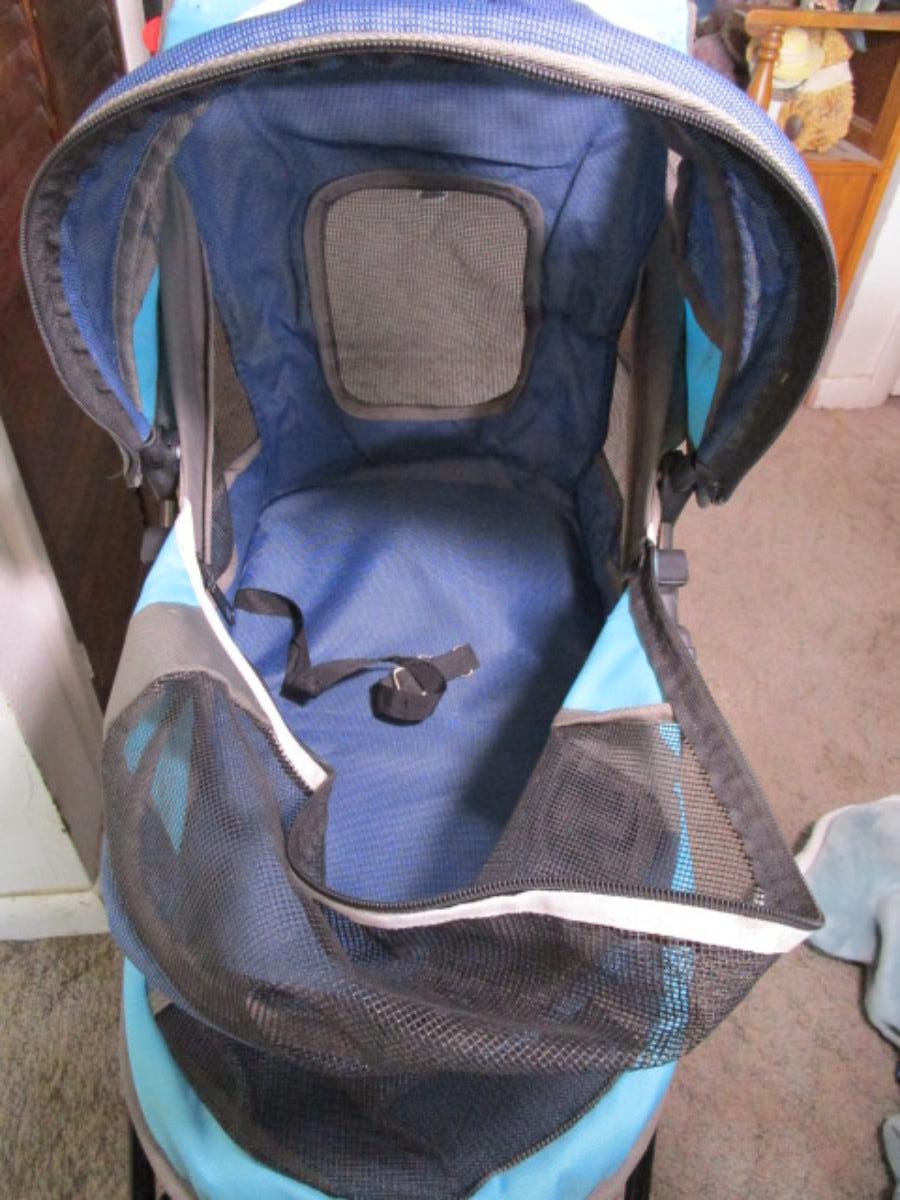 New condition, has sun shade, locking back wheels, storage bin underneath, strap & clip to attach to collar, folds down, light weight.
