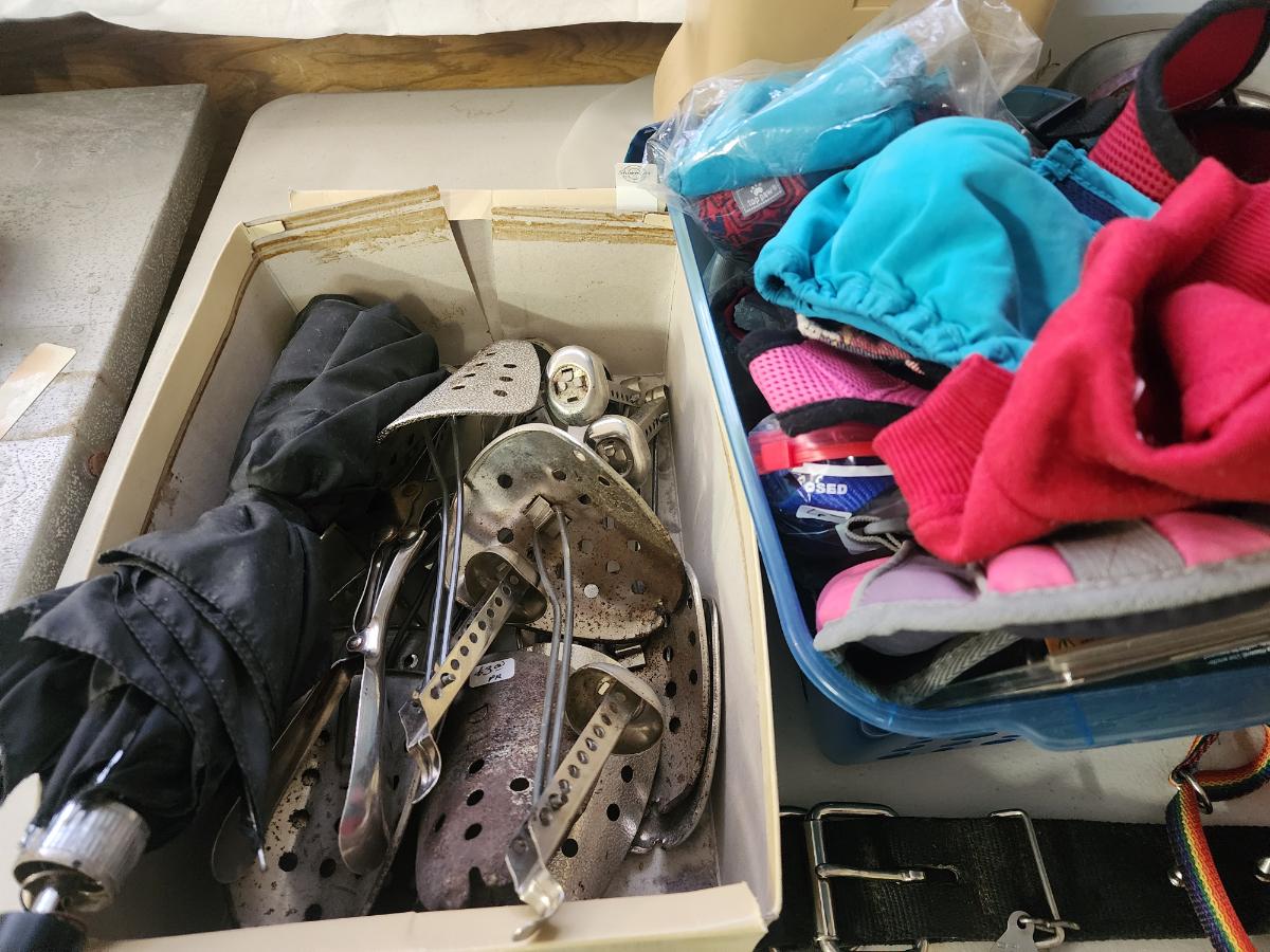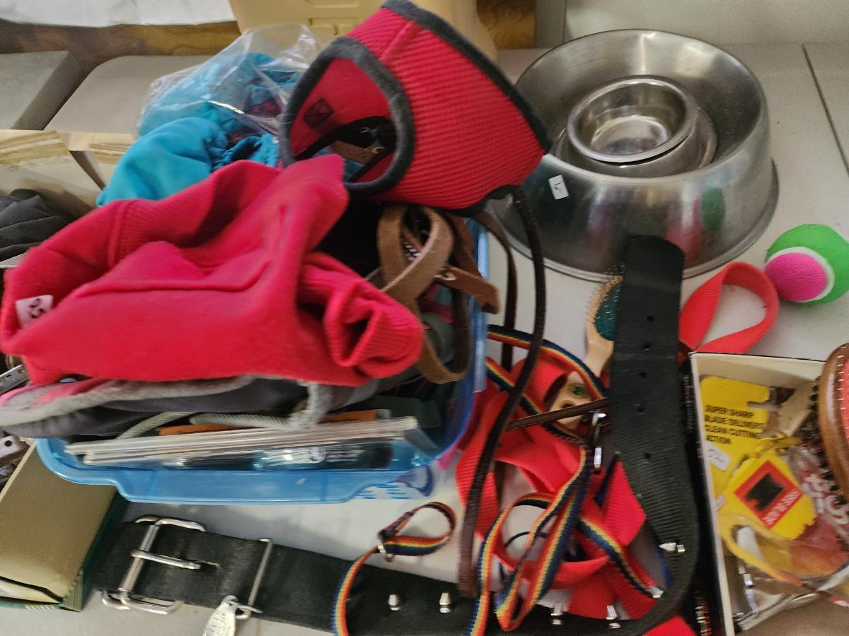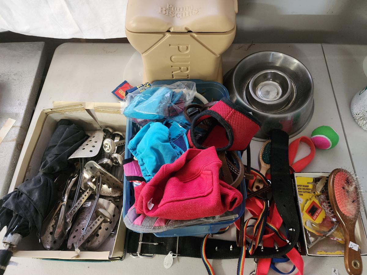 Lot of mostly pet items including leashes, dog treat storage, dog bowls, toys, and metal shoe stretchers