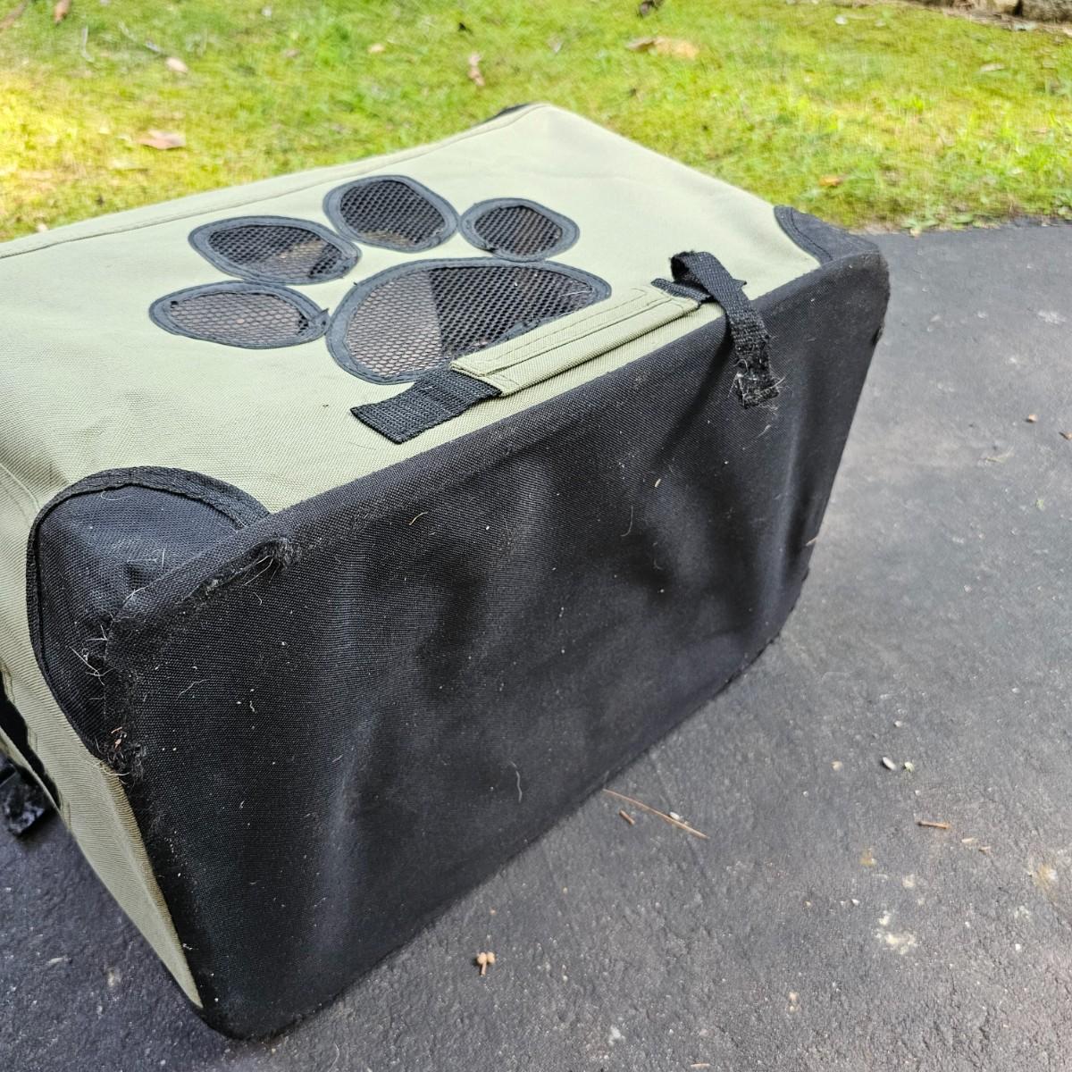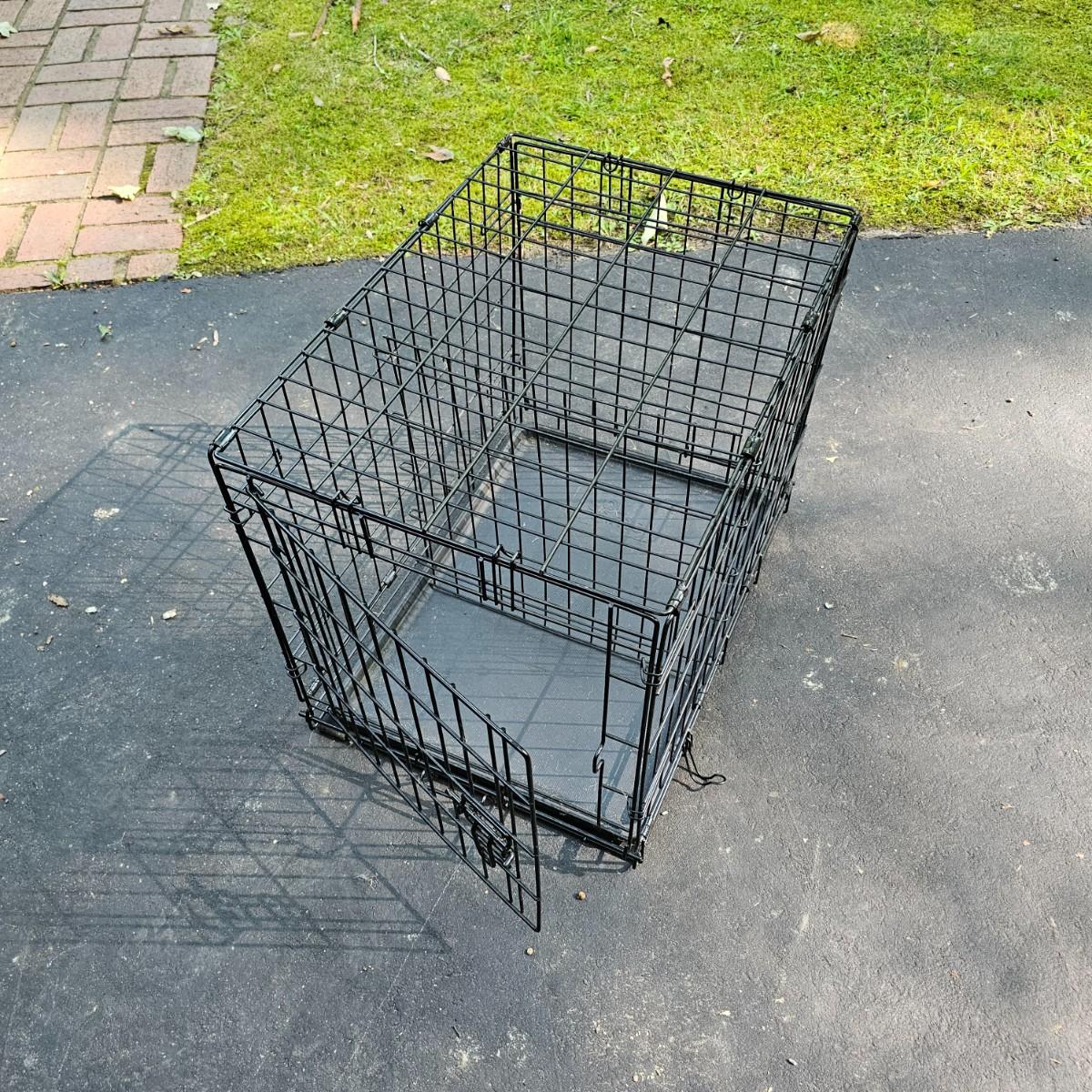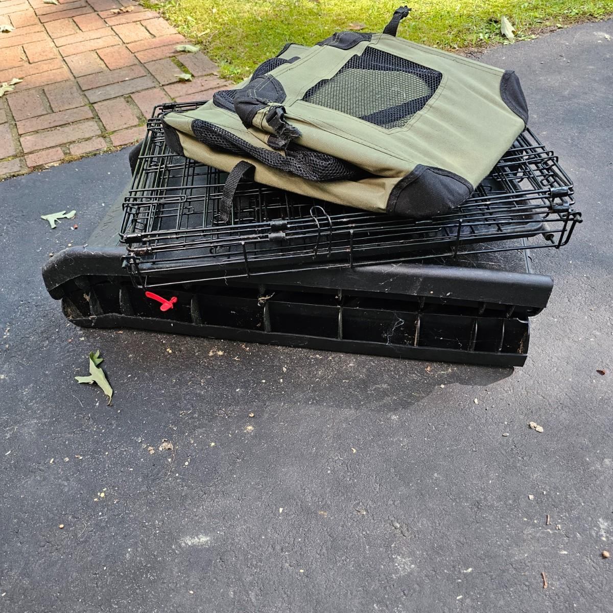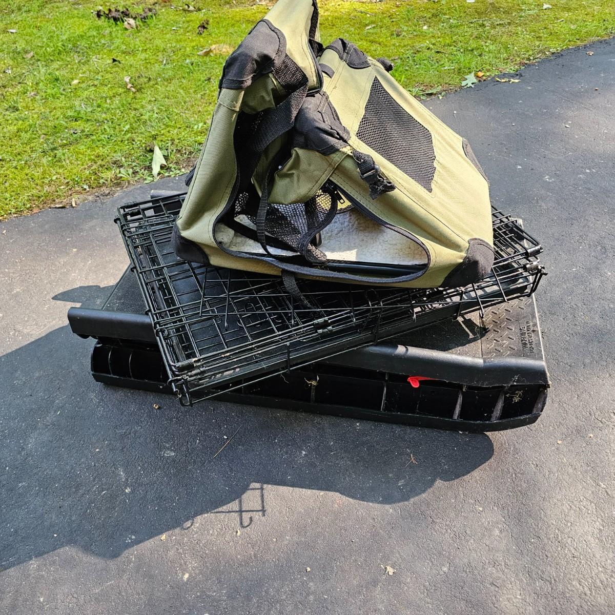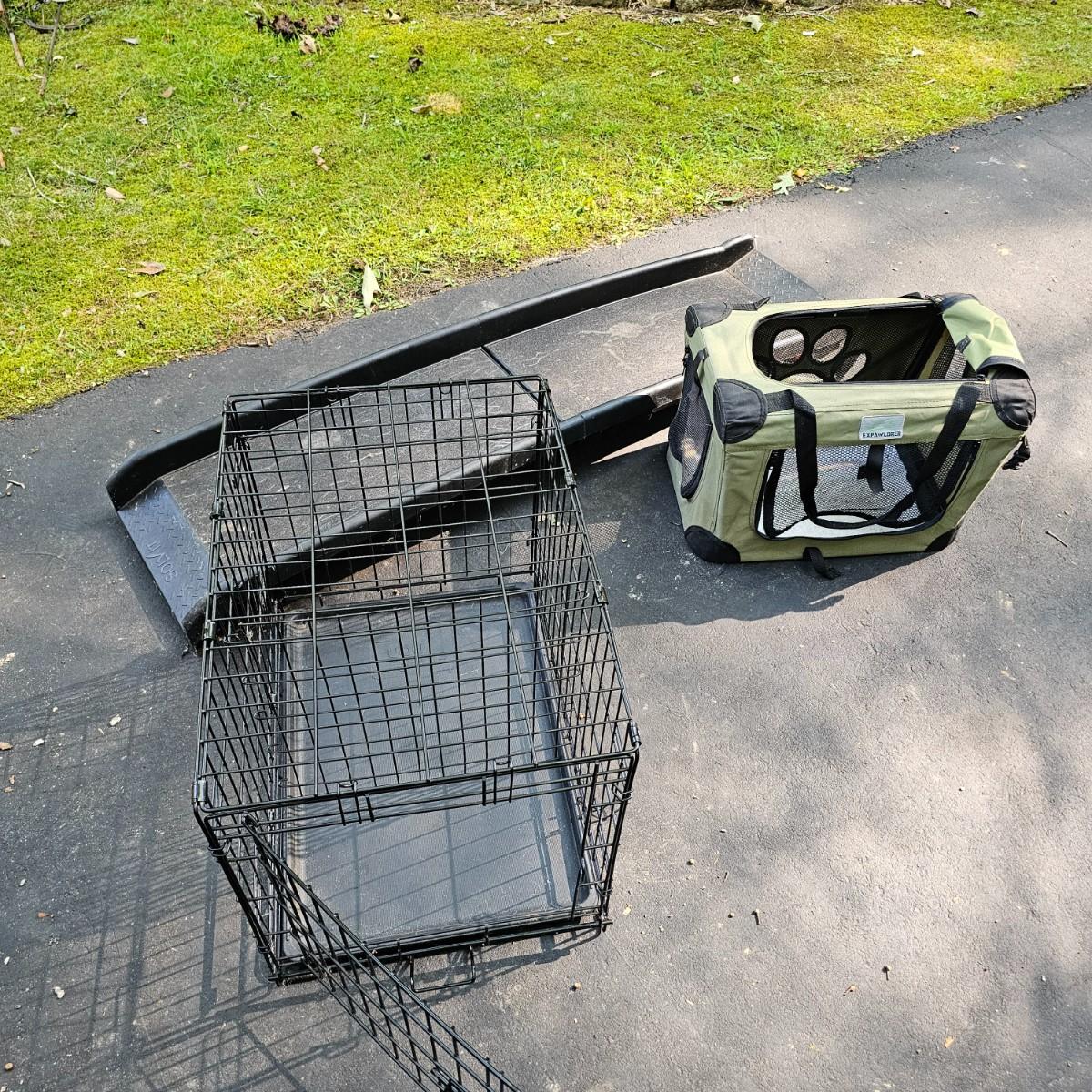 Plastic Folding pet accessories ramp by Solvit measures 61" x 16" x 4"H open, 30.5" x 16" x 8"H closed. Small size wire cage folds flat for storage, has divider piece, and bottom removable tray. It measures 17" x 24" x 19"H. Pet carrier is by Expawlorer, has multiple openings and ventilation. Measures 18" x 14" x 15"H open, 16" x 19" x 5"H folded flat. Securing strap to hold closed has been compromised. See photos for details. Local pickup only.