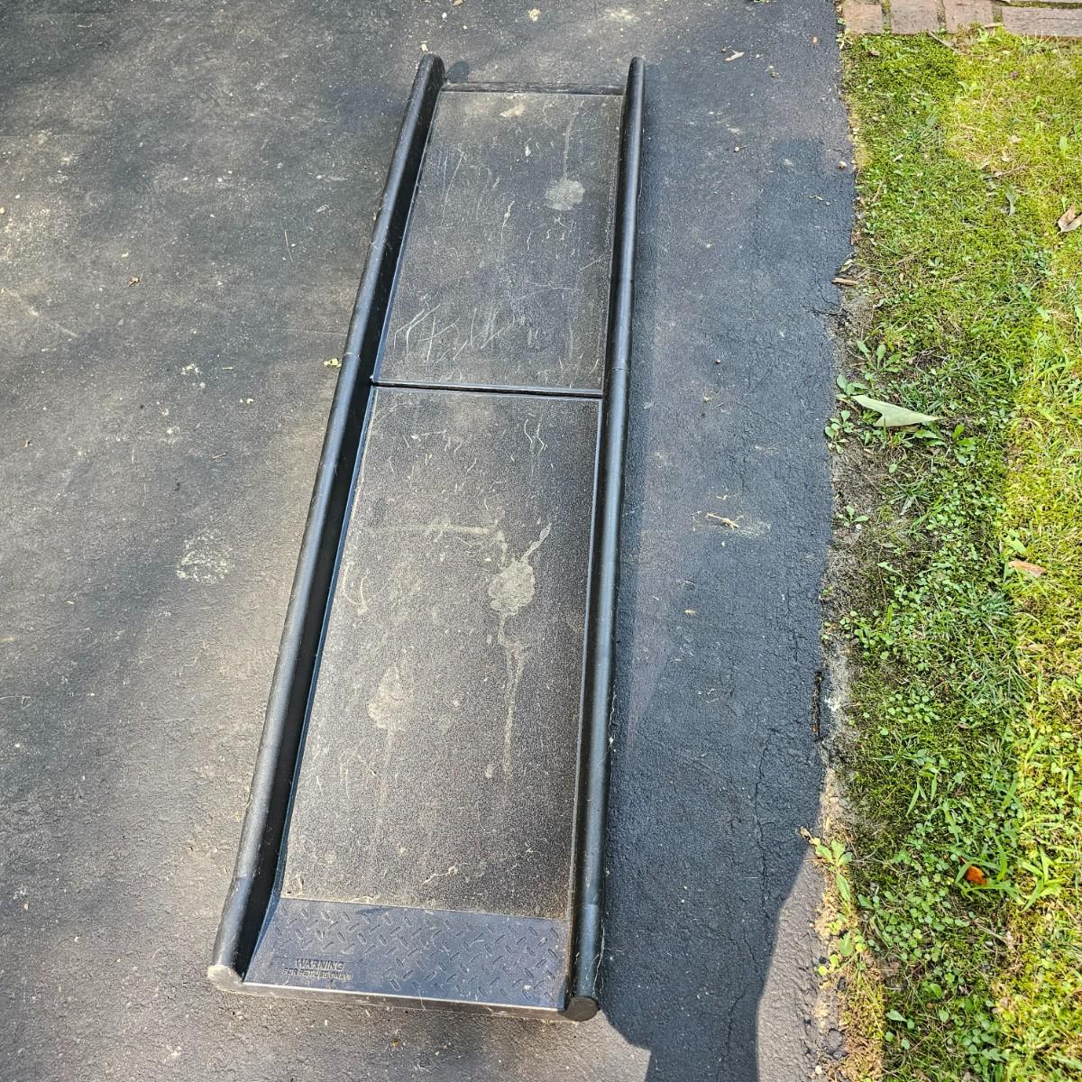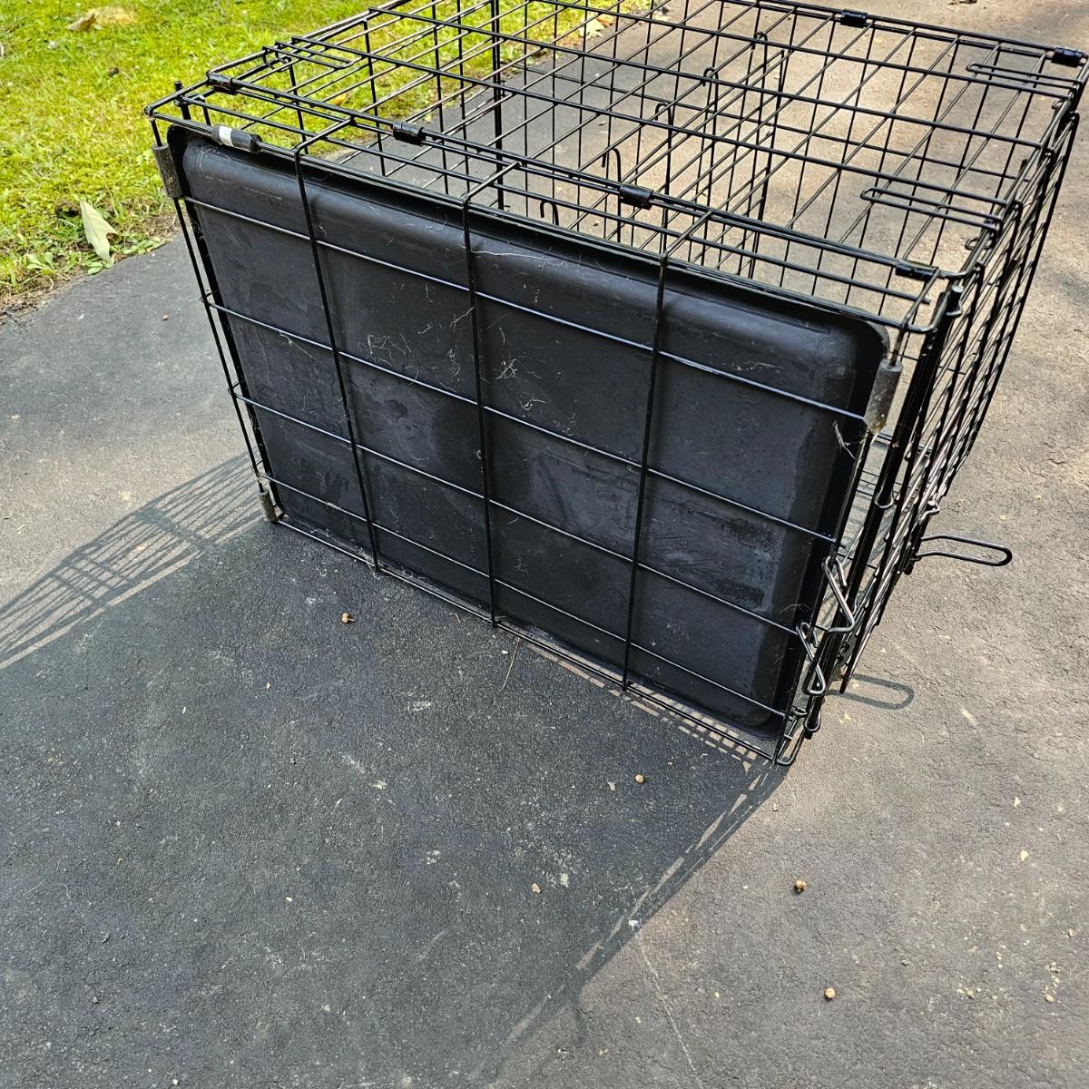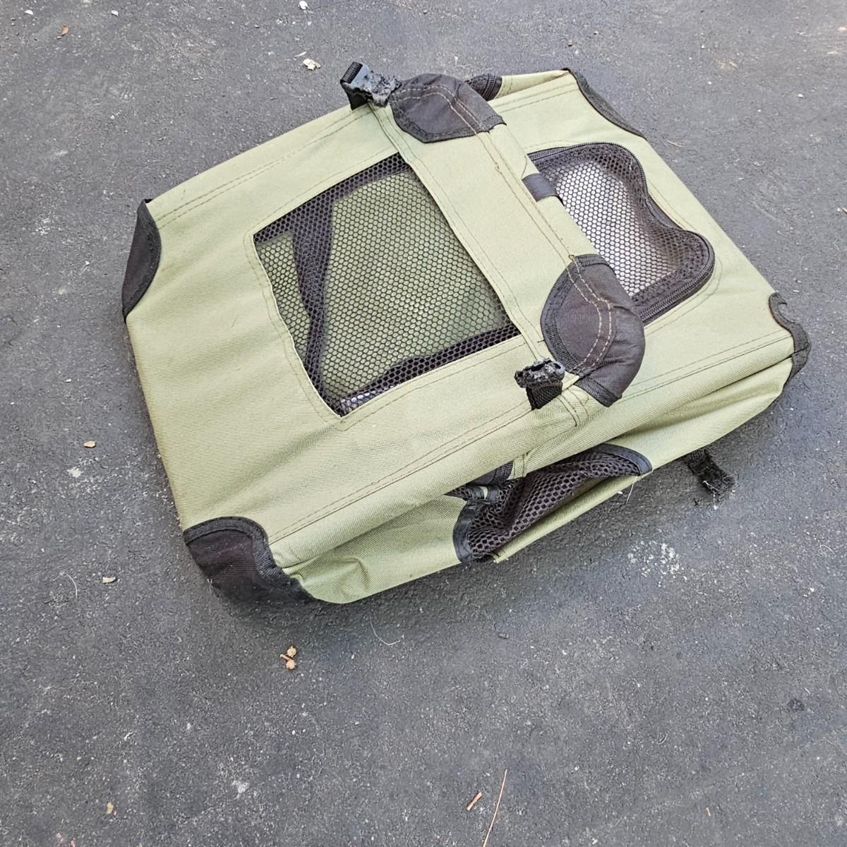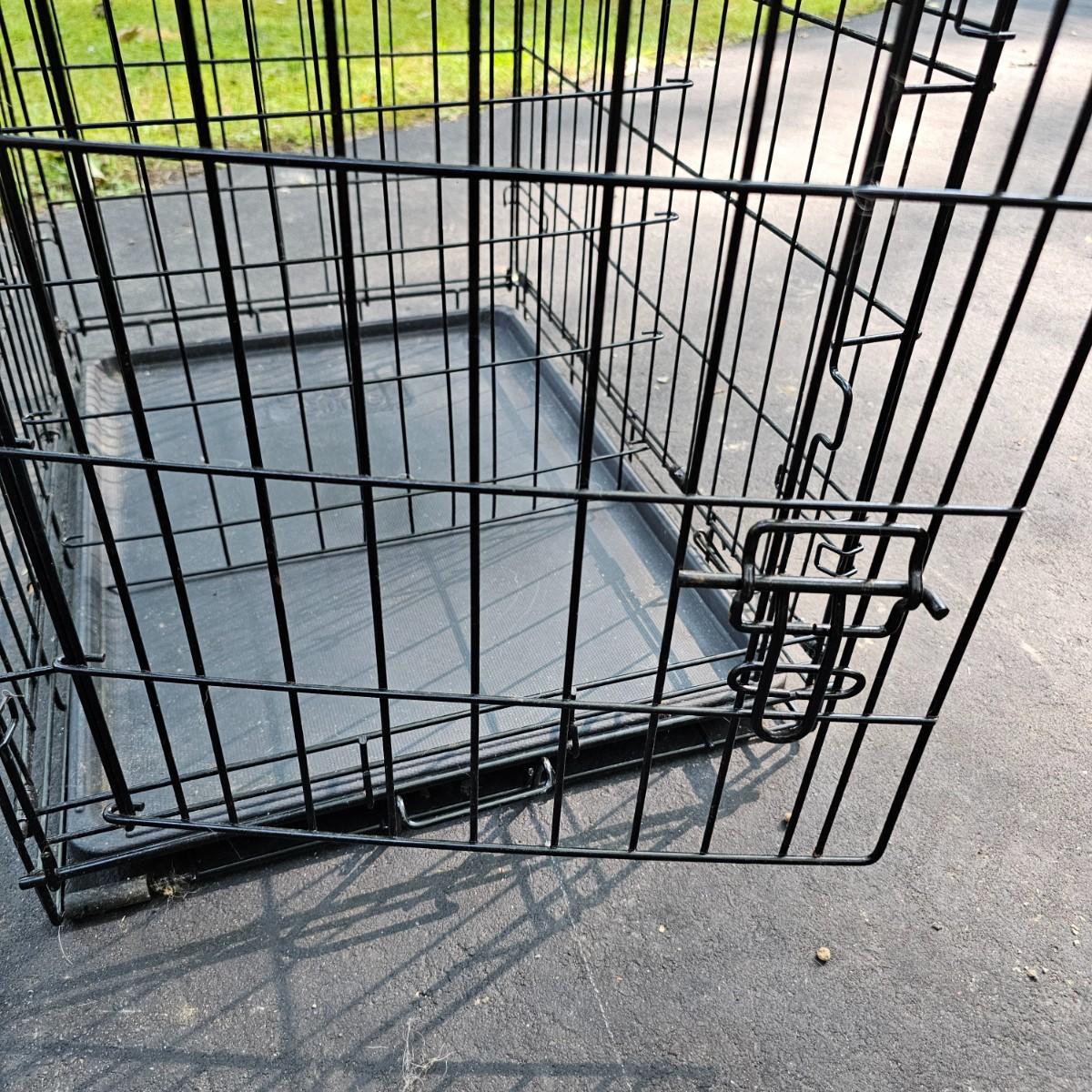 Plastic Folding pet accessories ramp by Solvit measures 61" x 16" x 4"H open, 30.5" x 16" x 8"H closed. Small size wire cage folds flat for storage, has divider piece, and bottom removable tray. It measures 17" x 24" x 19"H. Pet carrier is by Expawlorer, has multiple openings and ventilation. Measures 18" x 14" x 15"H open, 16" x 19" x 5"H folded flat. Securing strap to hold closed has been compromised. See photos for details. Local pickup only.