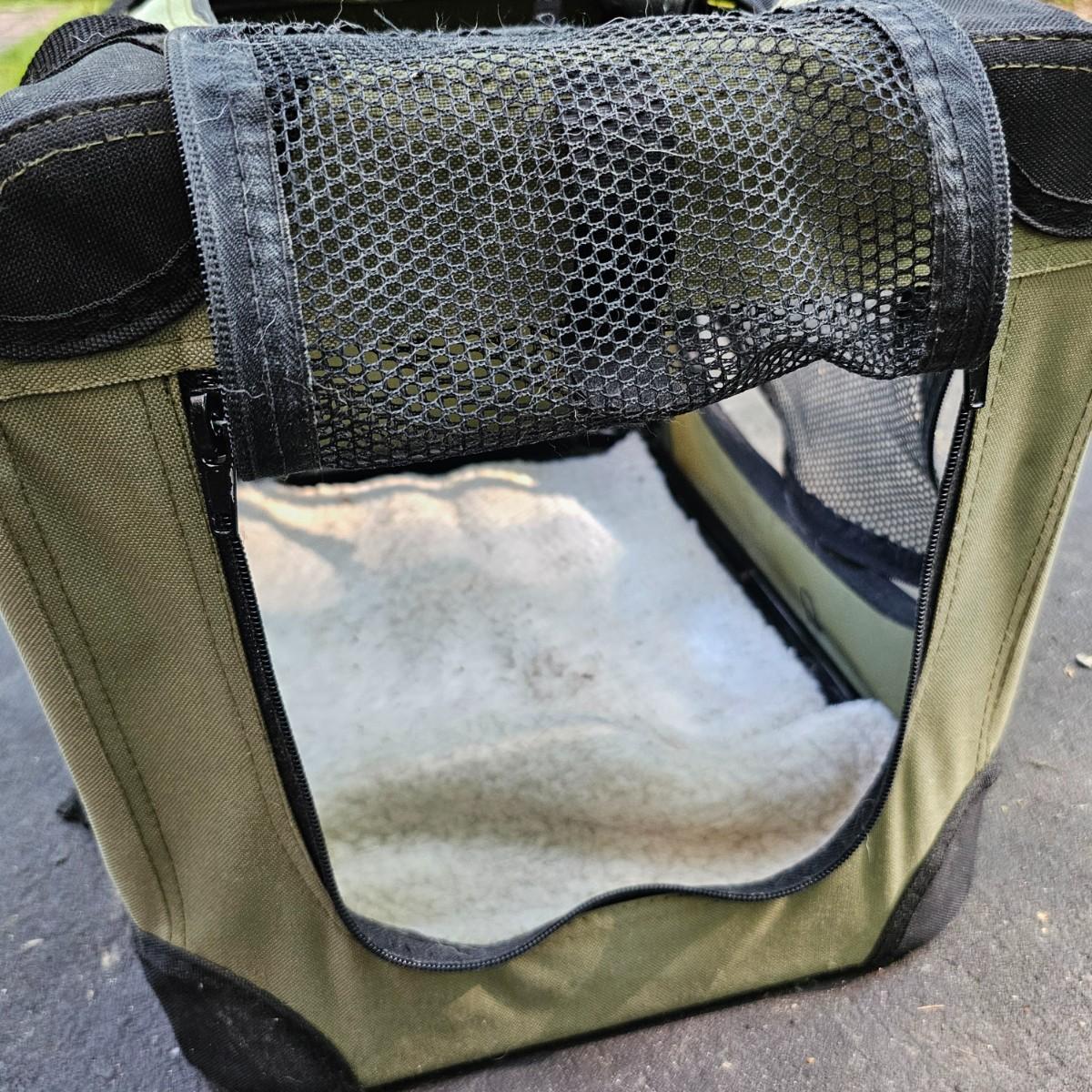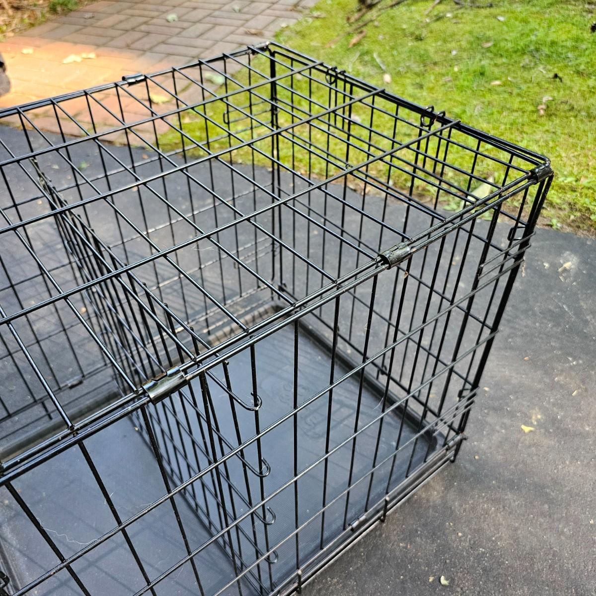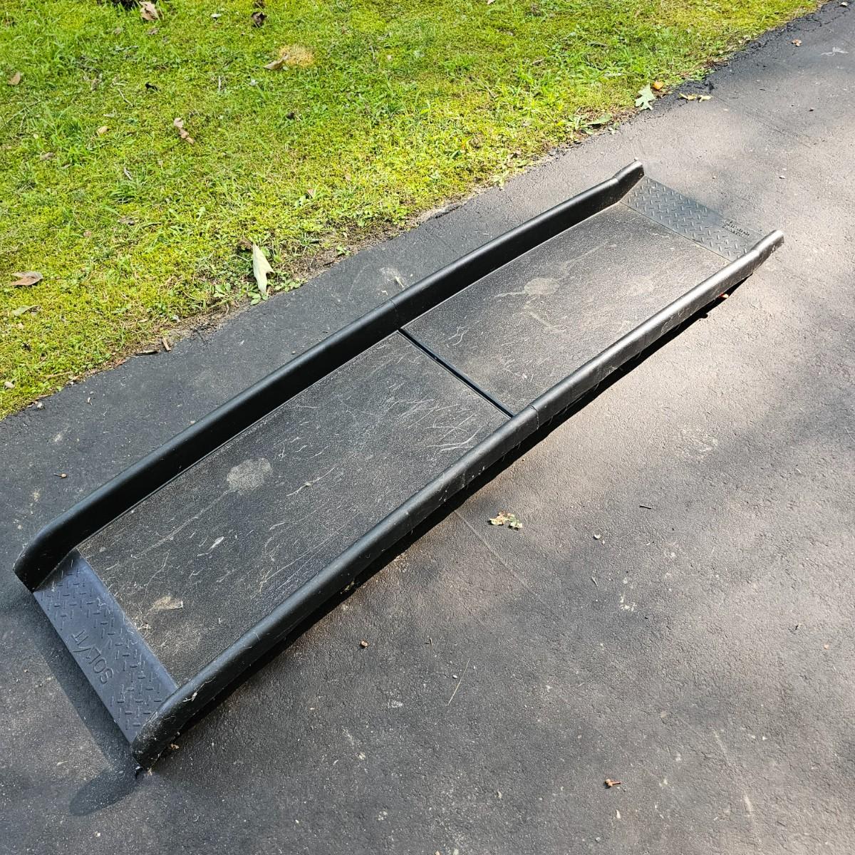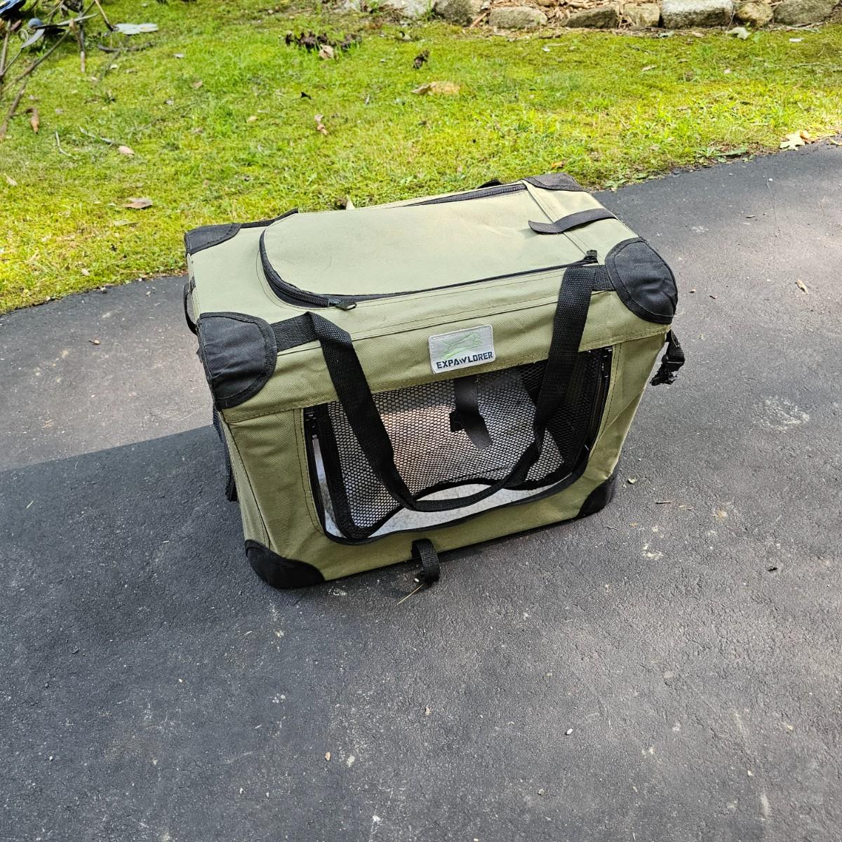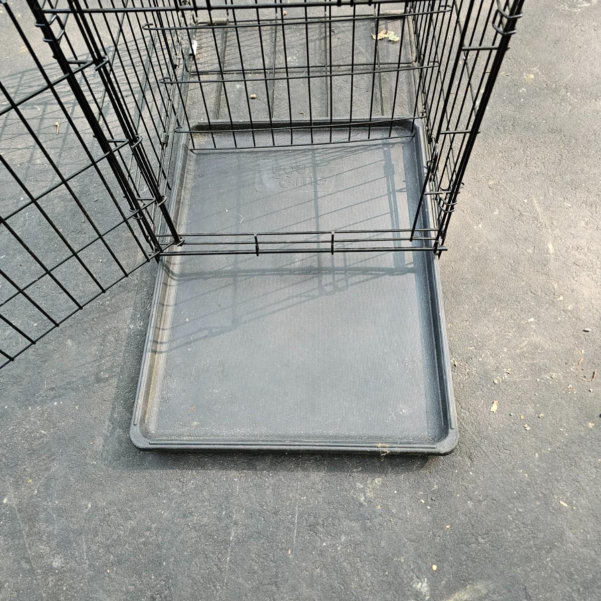 Plastic Folding pet accessories ramp by Solvit measures 61" x 16" x 4"H open, 30.5" x 16" x 8"H closed. Small size wire cage folds flat for storage, has divider piece, and bottom removable tray. It measures 17" x 24" x 19"H. Pet carrier is by Expawlorer, has multiple openings and ventilation. Measures 18" x 14" x 15"H open, 16" x 19" x 5"H folded flat. Securing strap to hold closed has been compromised. See photos for details. Local pickup only.