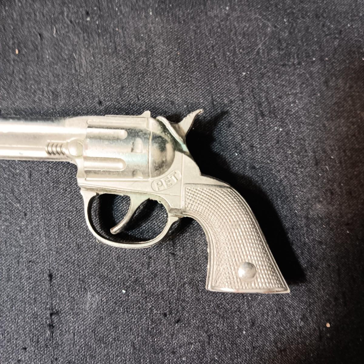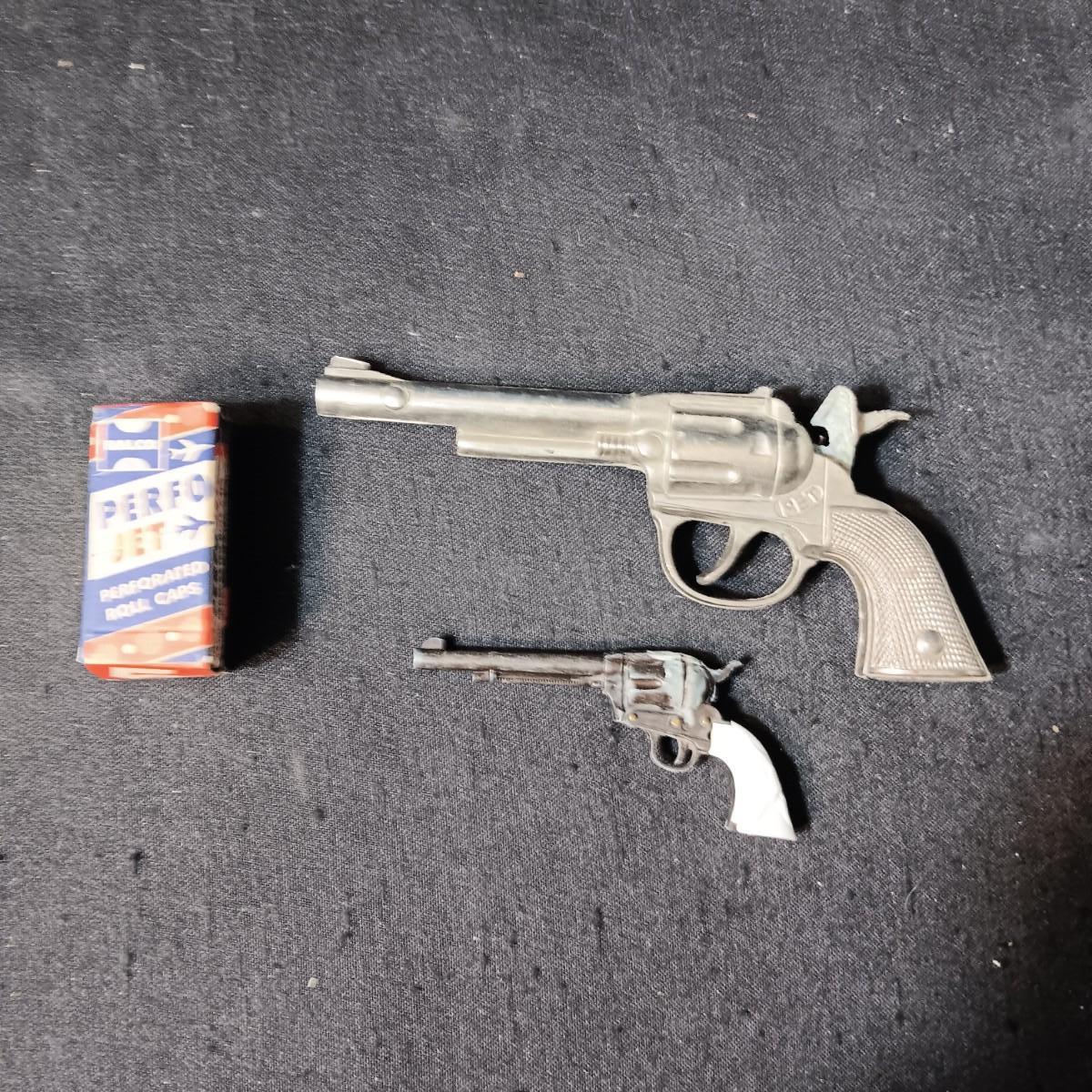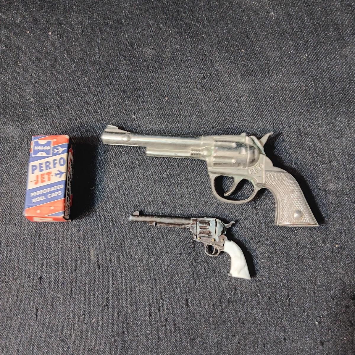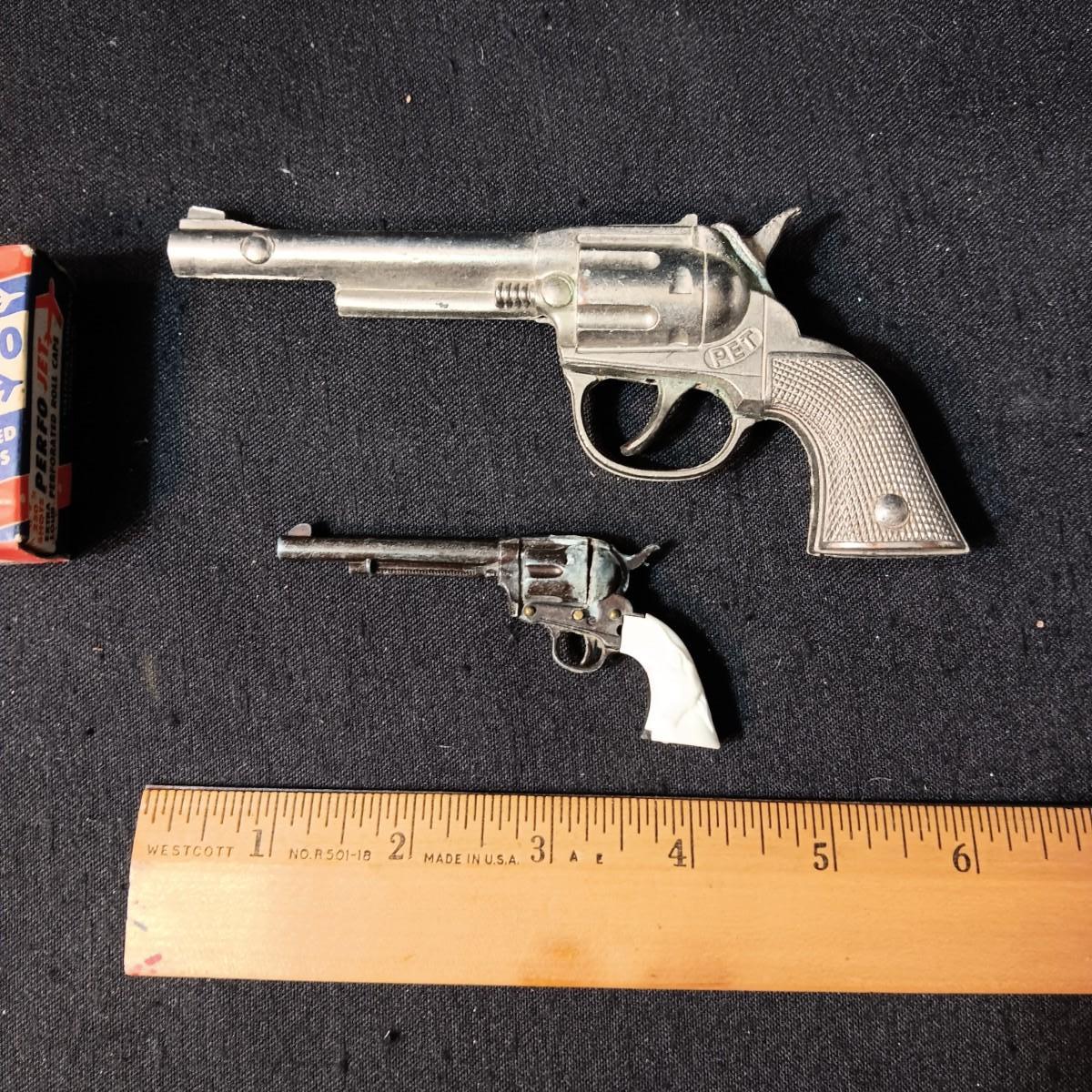 PET TOY CAP GUN WITH A BOX OF ROLLED CAPS AND A SMALLER METAL TOY GUN