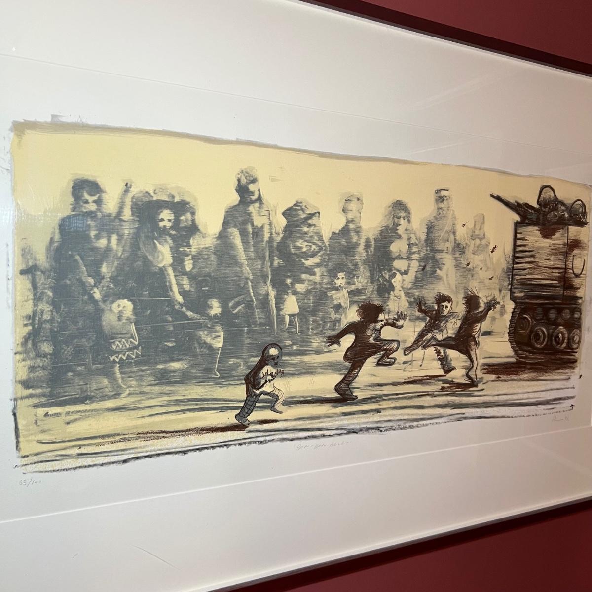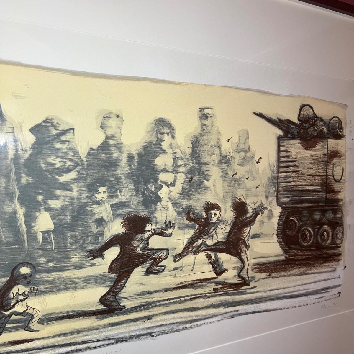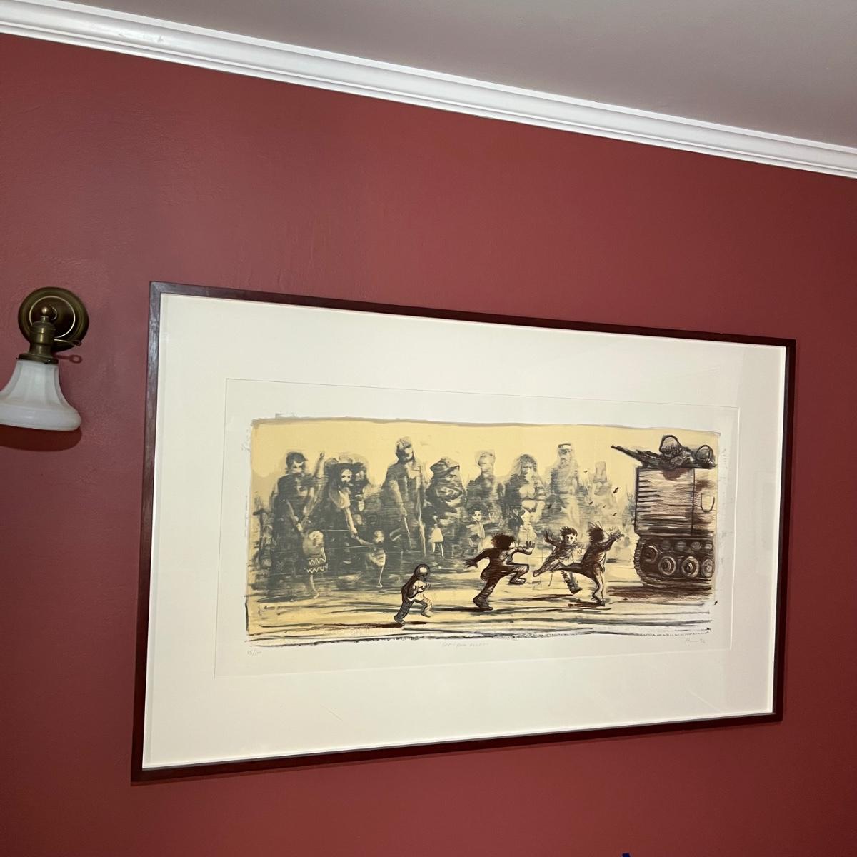 This large print is by Peter Howson (numerous lots in this sale by this artist). It is titled “Bon Bon Alley”, number 65/100 and is pencil signed. Matted and mounted in a wood frame with plexiglass; note there is a scratch in the lower left section, see images.