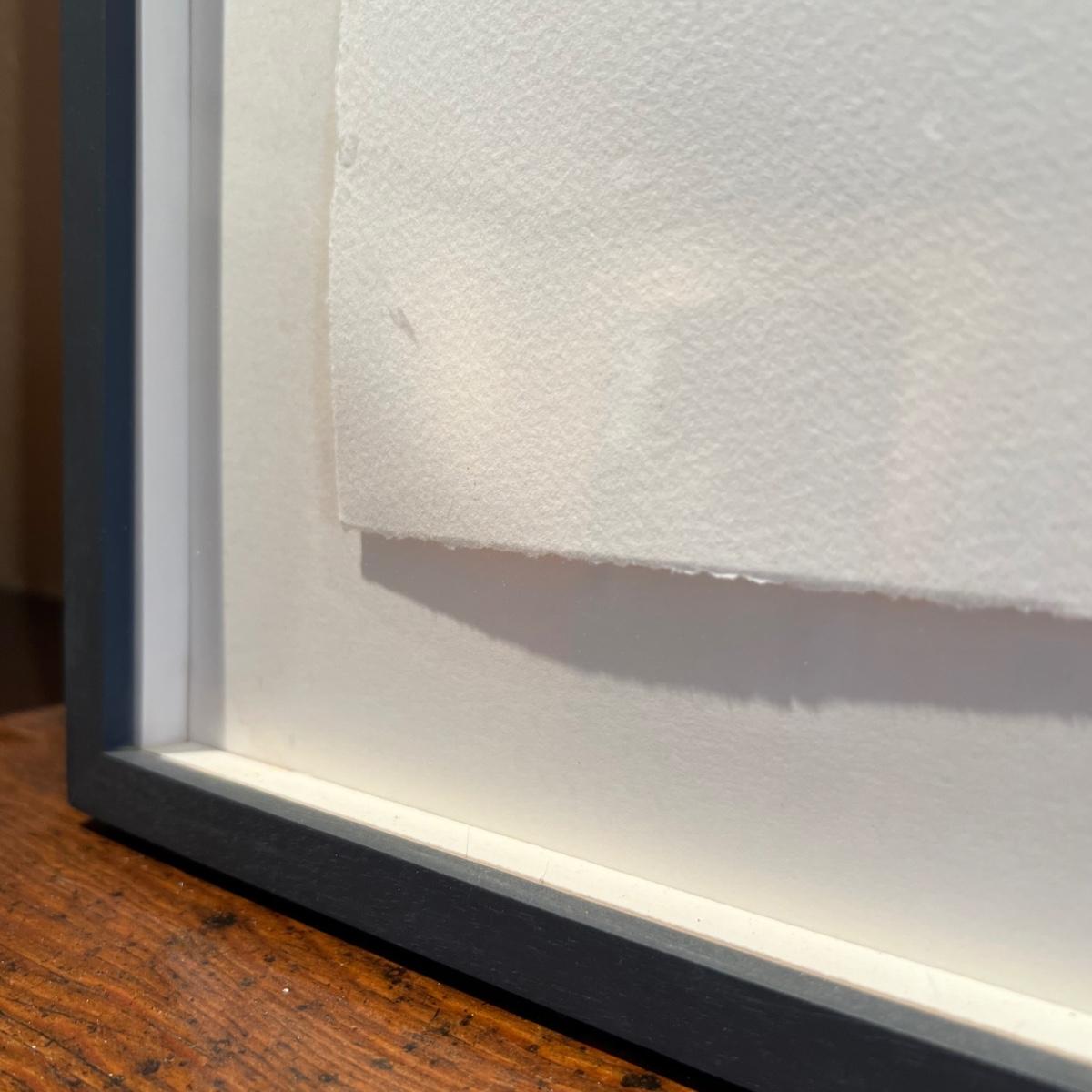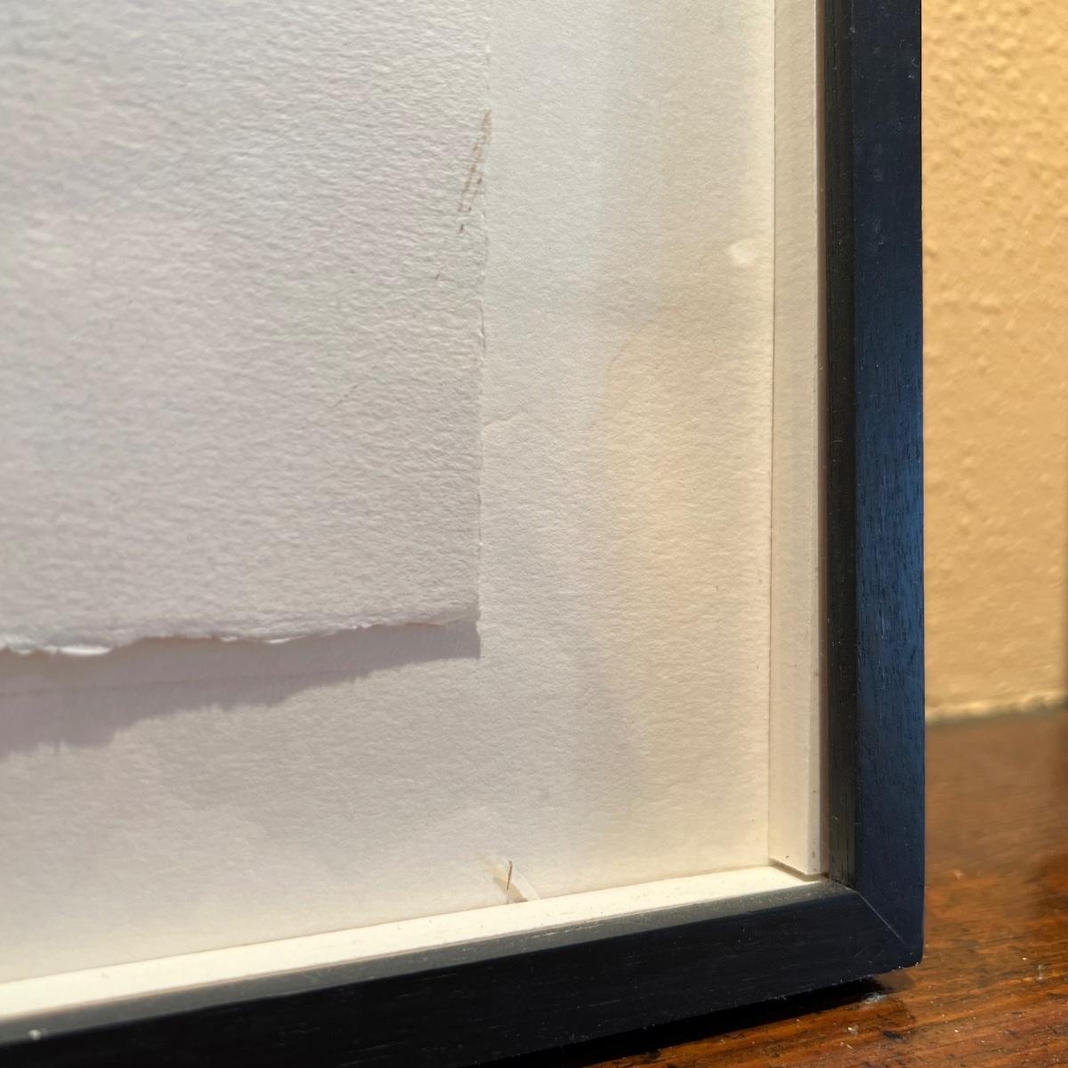 Print is on an off white paper that has been mounted under glass with no matte. The frame is wood, painted black that is a shadow box style.