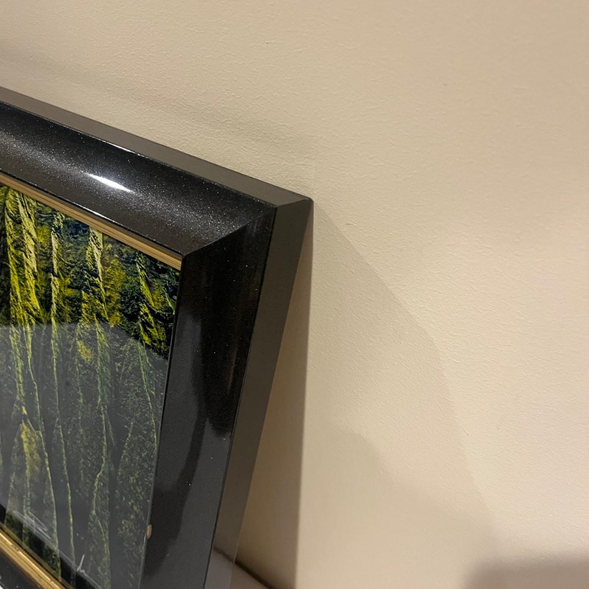 Stunning forest scene photograph by renowned landscape photographer Peter Lik. Another piece by Lik is available in this auction. It is signed and housed in a wooden frame under glass that measures 13” x 13”. Frame has places along the edge where paint is missing and wood is dented, see pictures.
