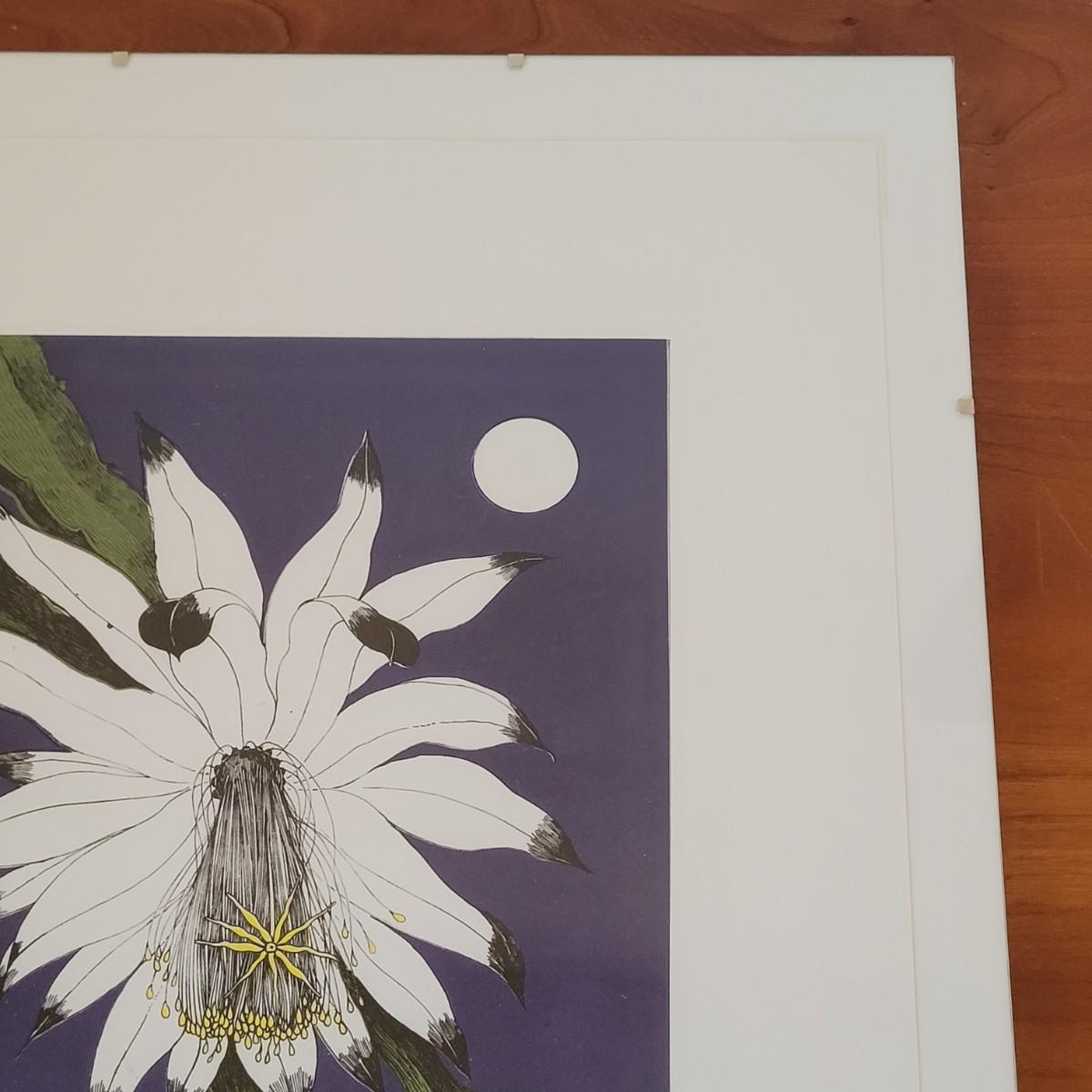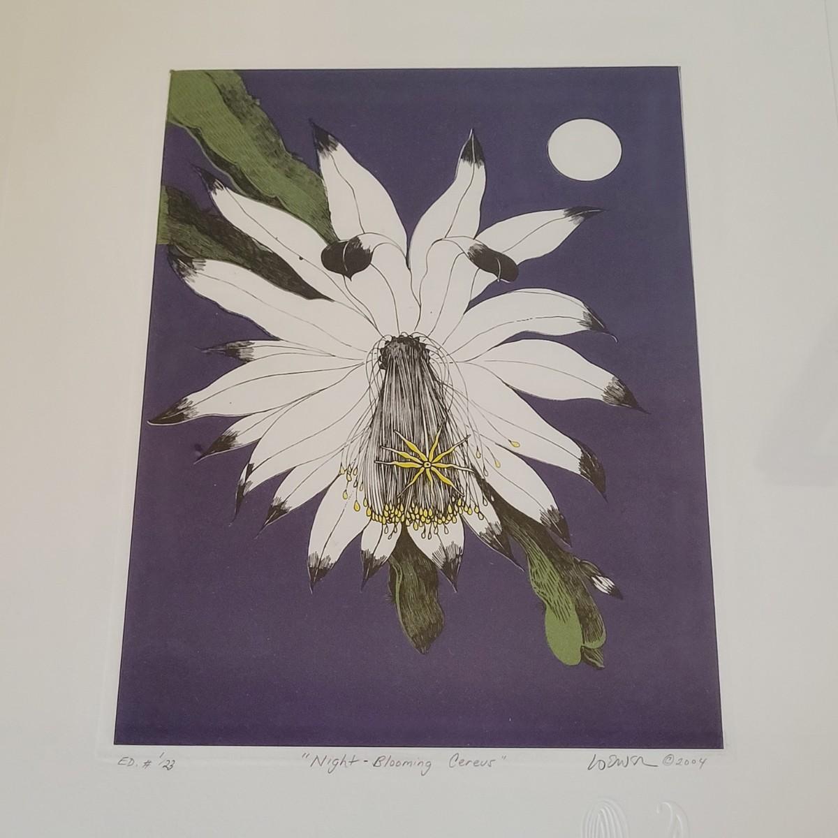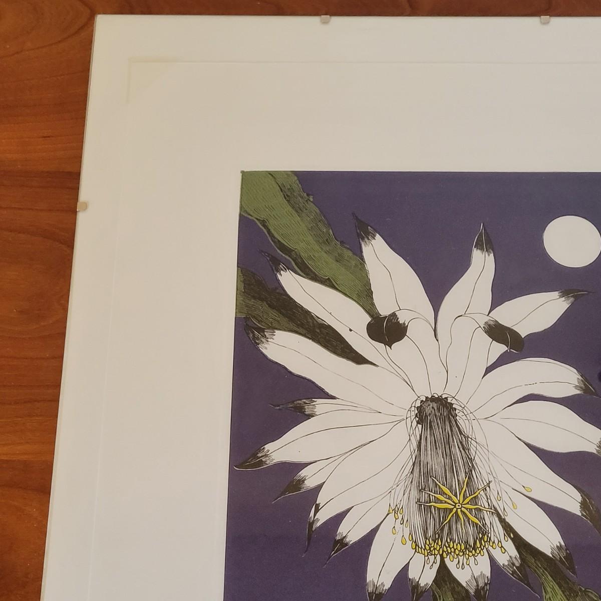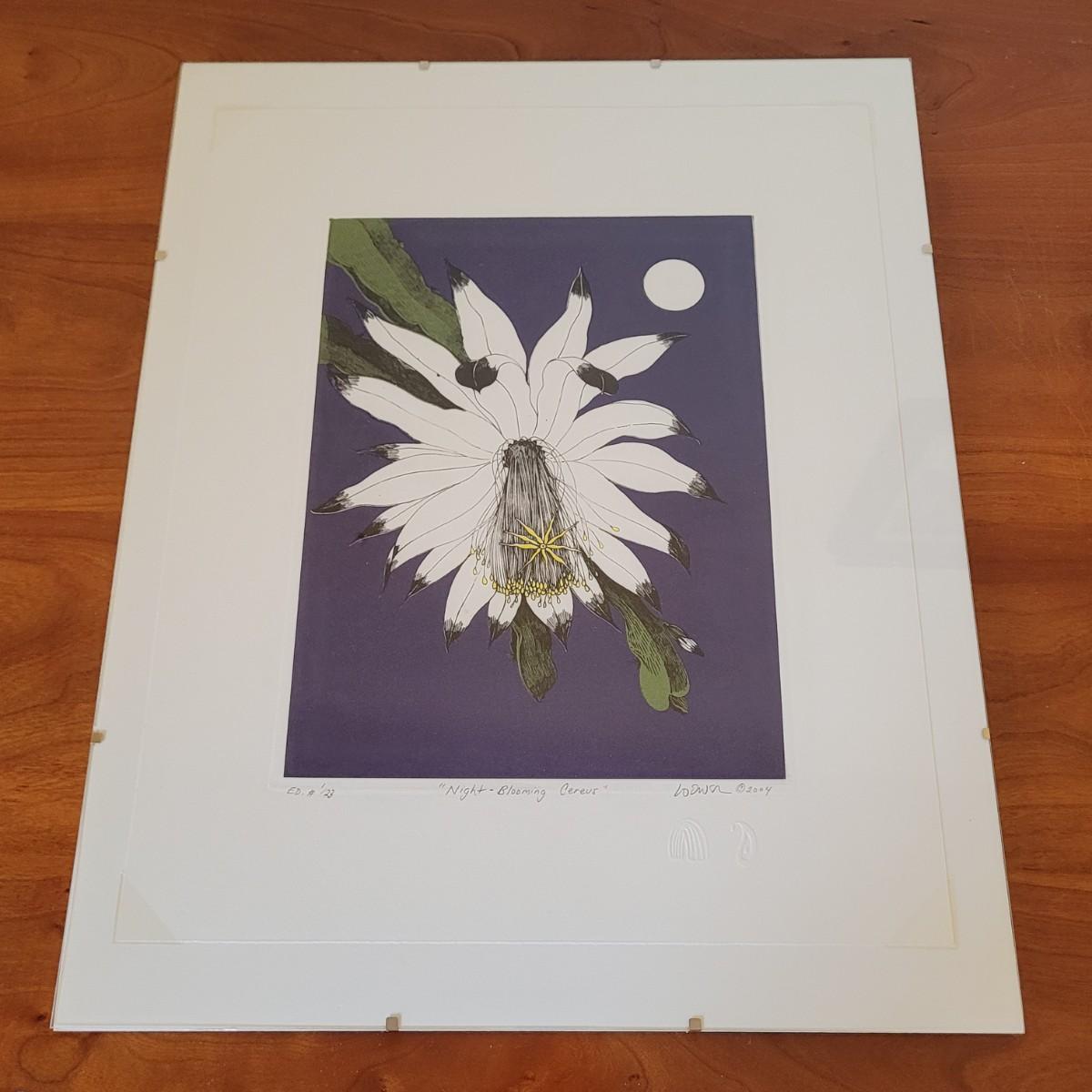 This lot includes a pencil signed print titled "Night-Blooming Cereus" by Asheville, NC artist Peter Loewer. The image depicts a blooming cereus flower in blue, white, yellow, and green. It is signed, titled and numbered (1/23) in pencil. The piece is under glass, mounted, and measures 16" x 20".