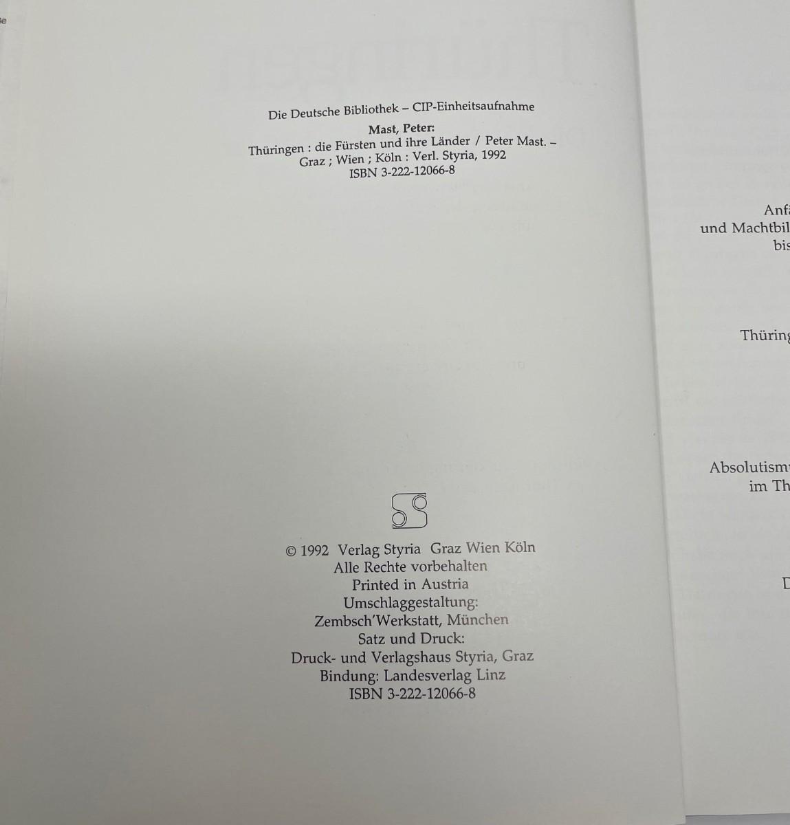 Peter Mast. THURINGEN Die Fursten und ihre Lander. Graz; Wein; Koln: Verlag Styria 1992