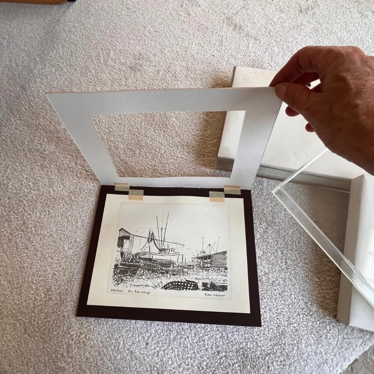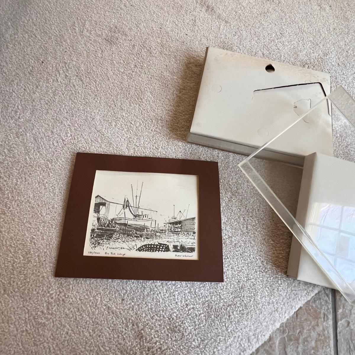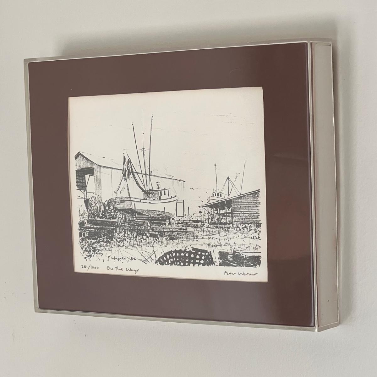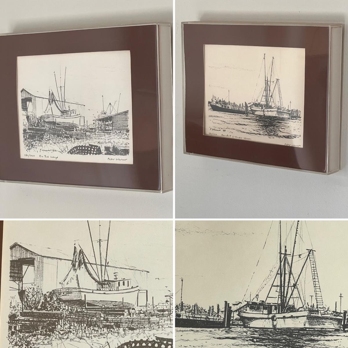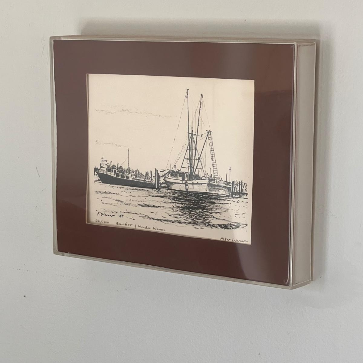 This pair of etchings are signed pencil signed Peter Warner, a local artist from Marshall, NC. Titles are “On the Ways” and “Beaufort and Wonder Woman”. They are mounted retro style in plexiglass box frames that measure 10” x 1.5” x 8”H.
