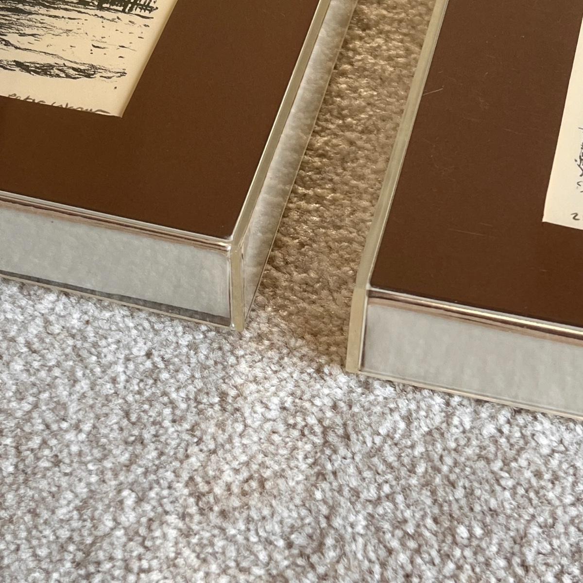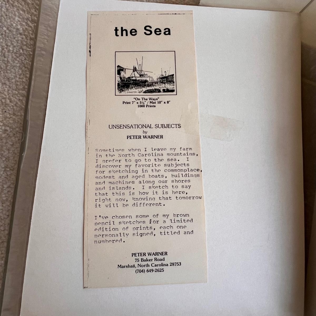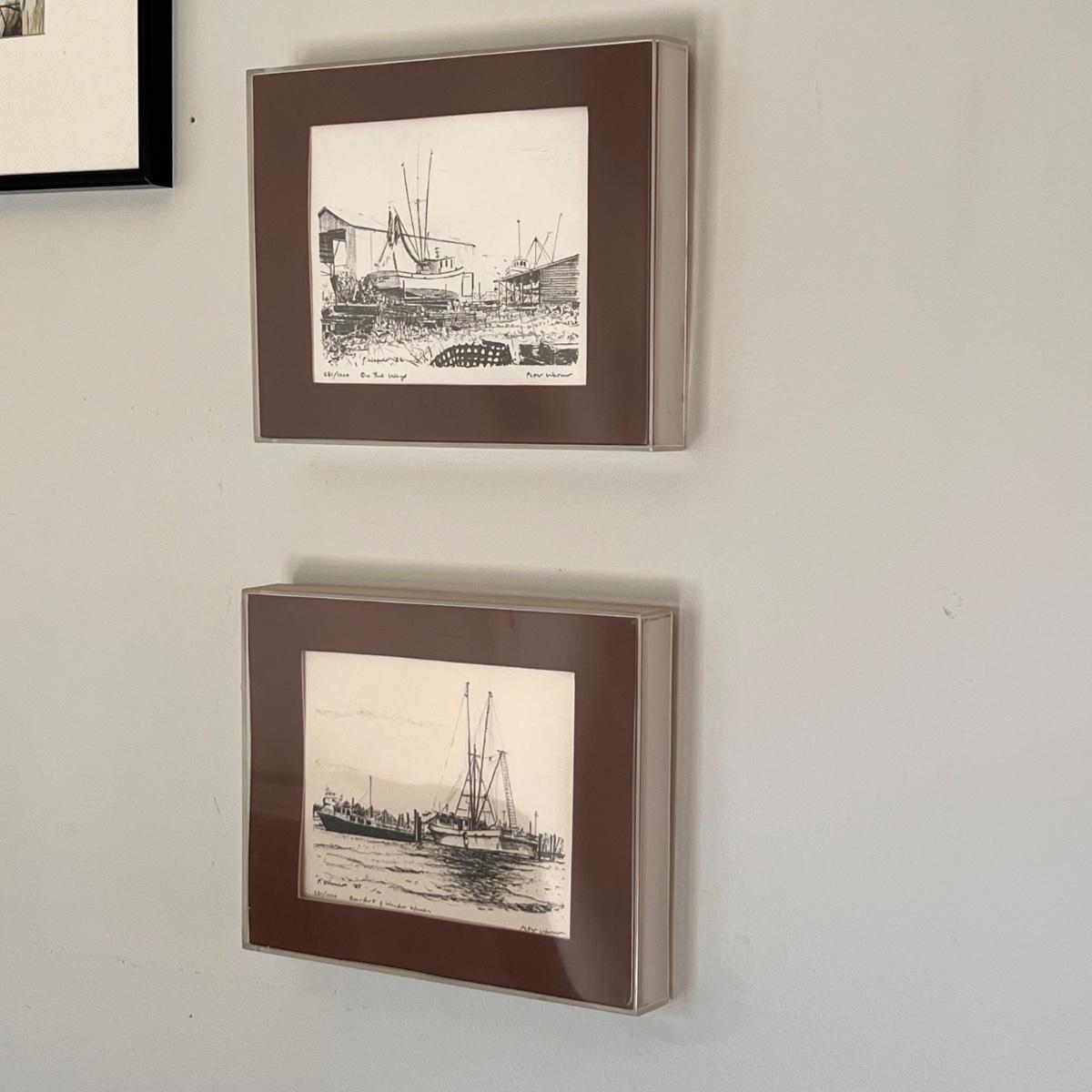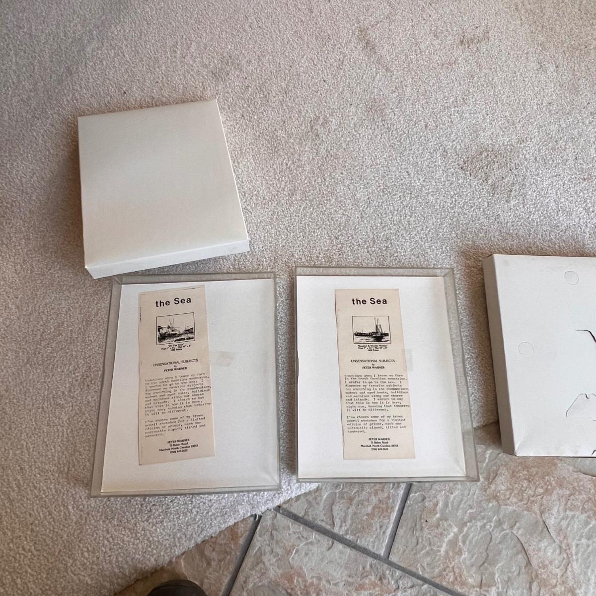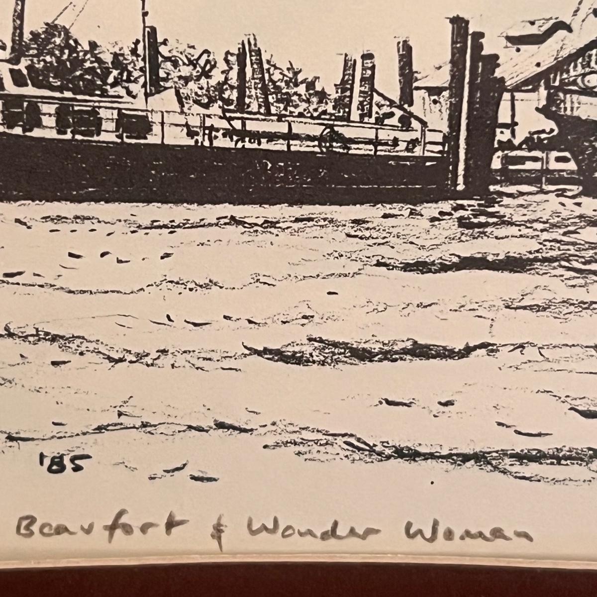 This pair of etchings are signed pencil signed Peter Warner, a local artist from Marshall, NC. Titles are “On the Ways” and “Beaufort and Wonder Woman”. They are mounted retro style in plexiglass box frames that measure 10” x 1.5” x 8”H.