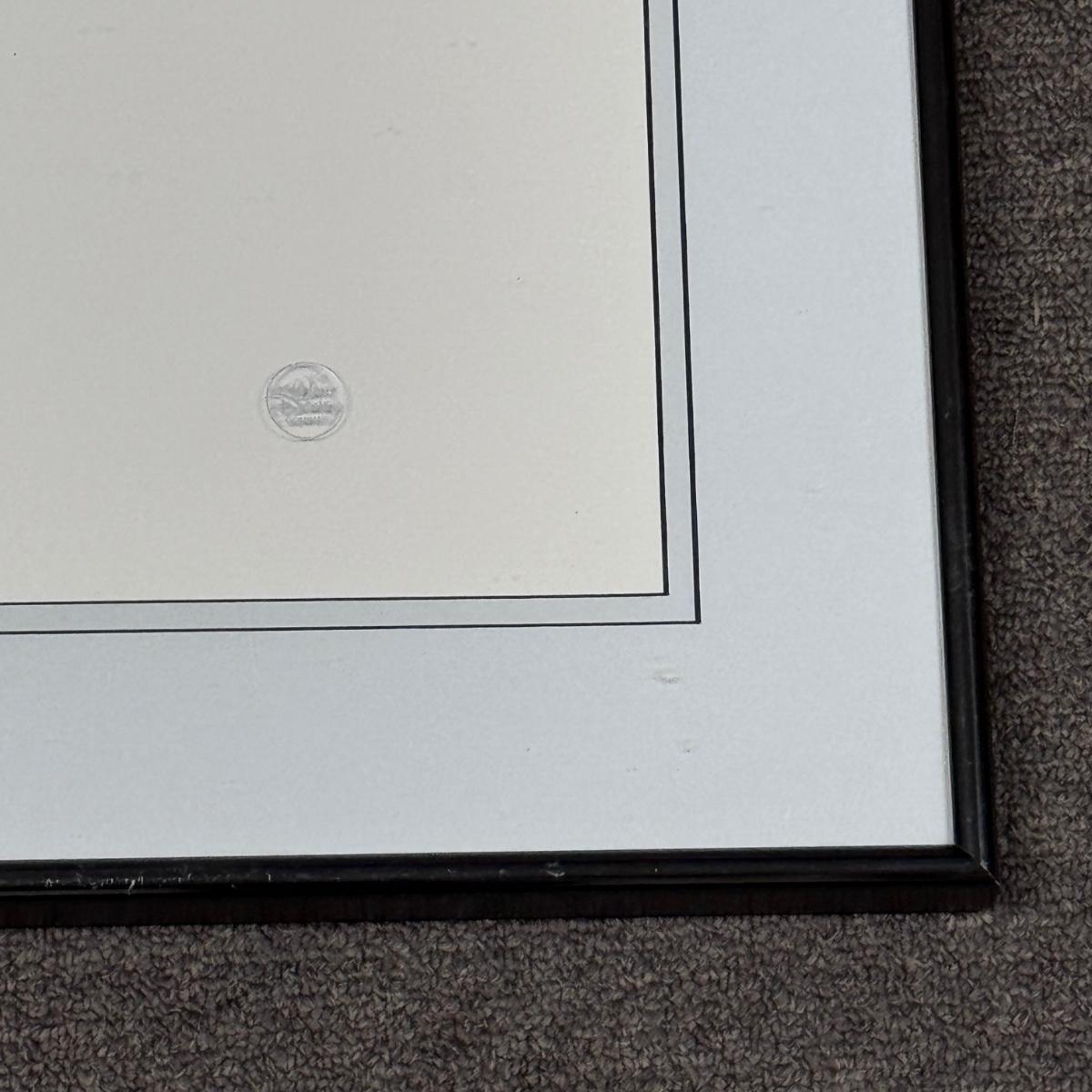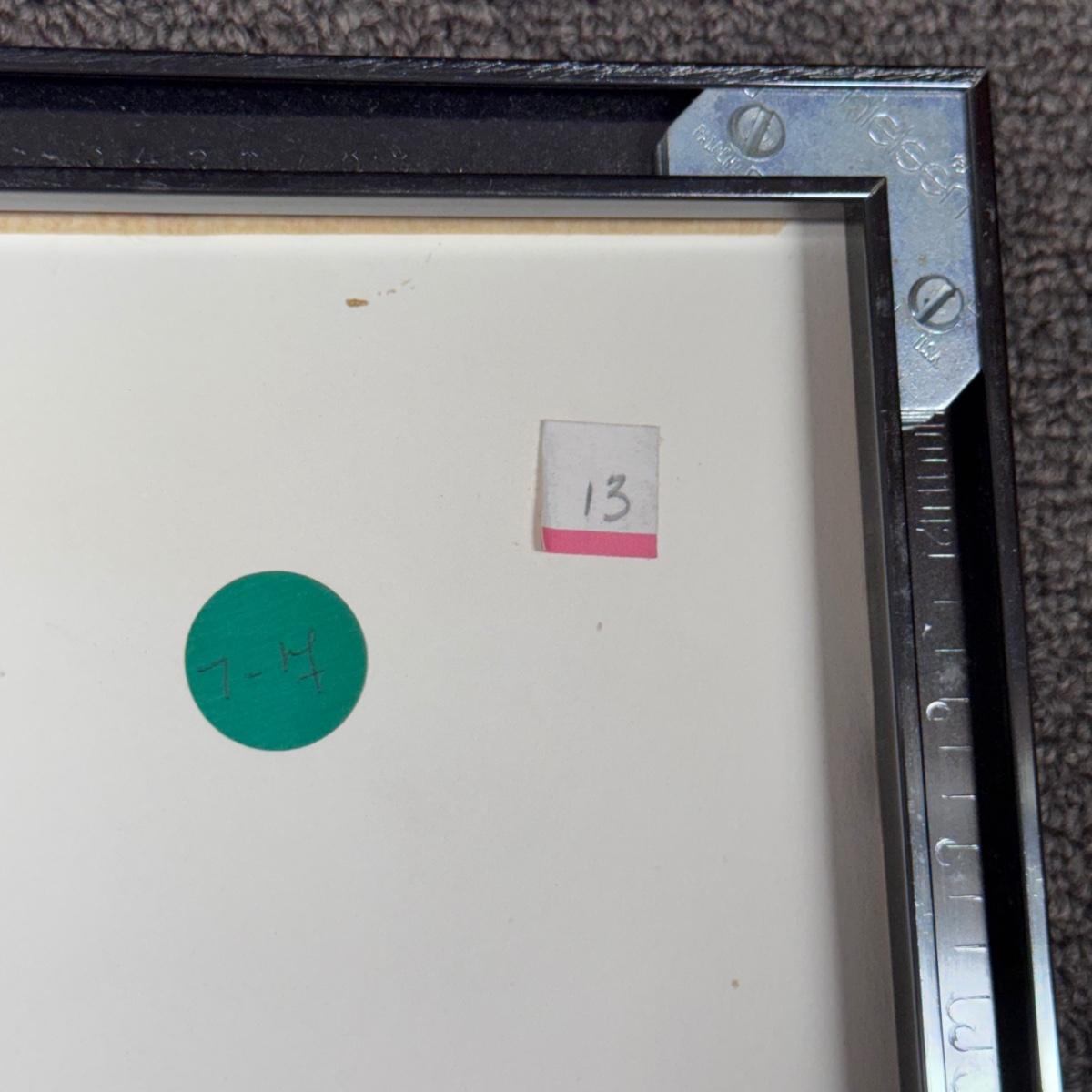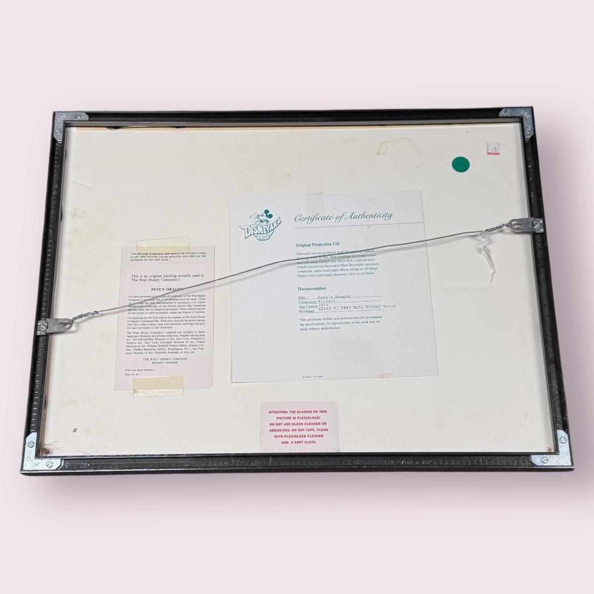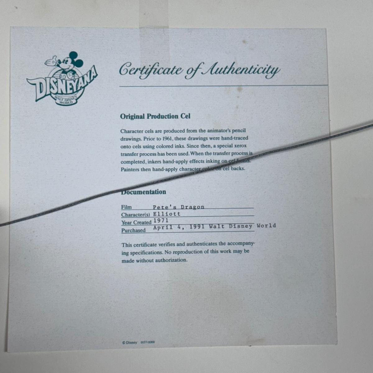 This lot includes one cel of the character Elliot from Walt Disney’s film “Pete’s Dragon.” The cell is protected with a sheet of glass, two mattings, and a metal frame. The frame measures 20” x 15”H. The certificate of authenticity and a blurb about this piece is taped to the back of the frame.