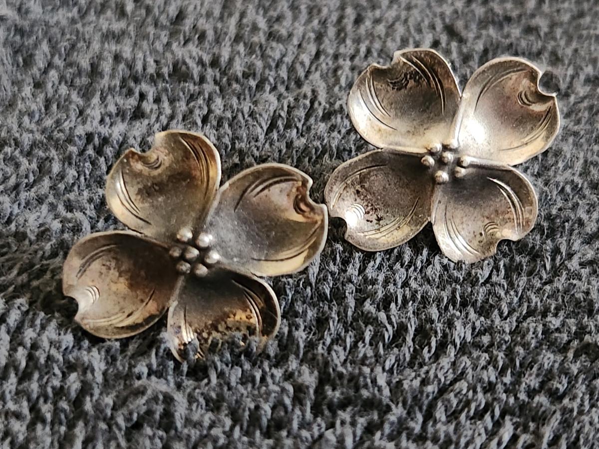 This auction lot is for a pair of Petite Sterling Dogwood Earrings. These earrings weigh about 3.2 grams. They are marked sterling and need a nice polish to brighten them up for a showy wear. See photo for size.