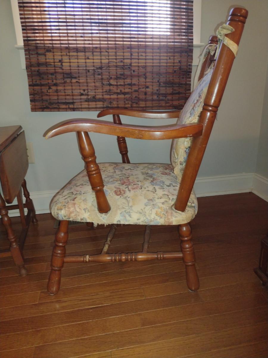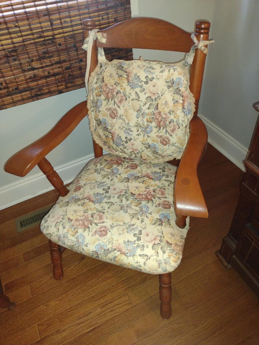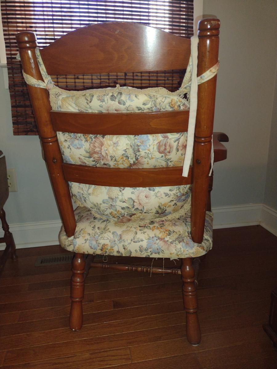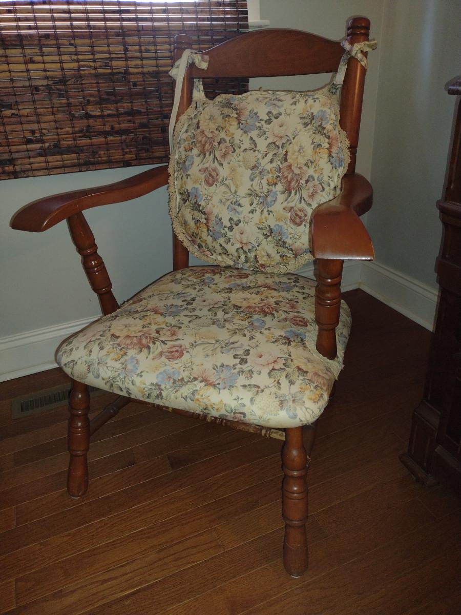 Petite Wooden Chair with Cushioned Seat and Back. Please see all pictures- item has damage to leg supports (pet teeth marks).