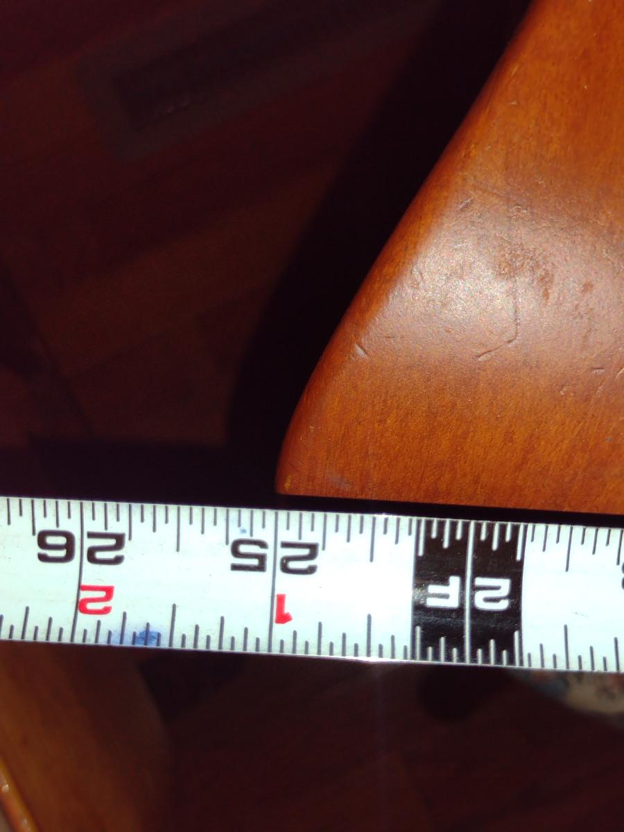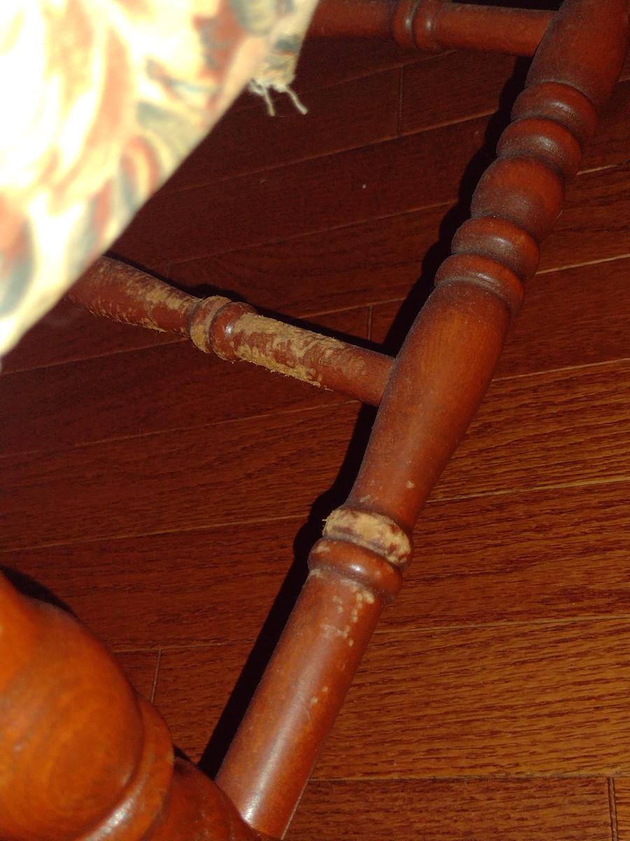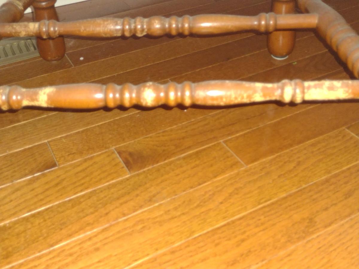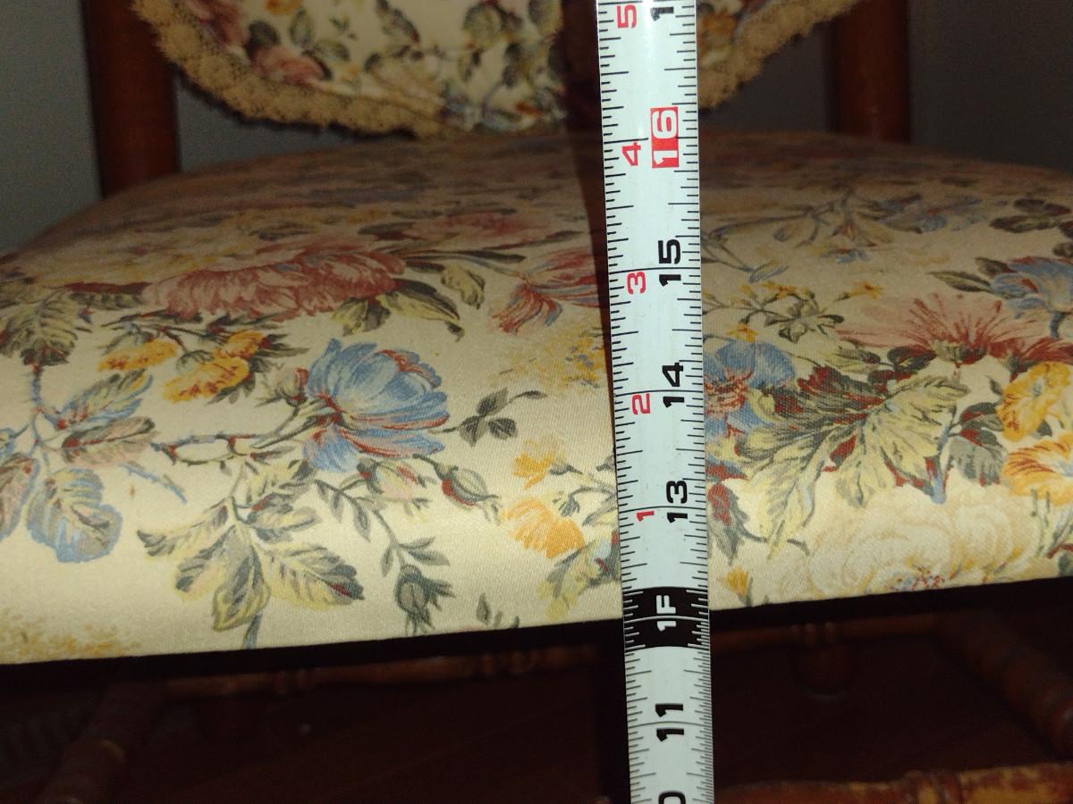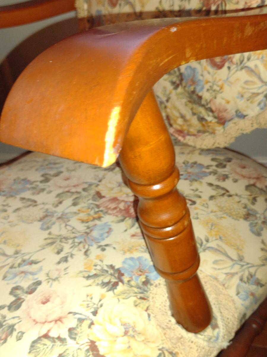 Petite Wooden Chair with Cushioned Seat and Back. Please see all pictures- item has damage to leg supports (pet teeth marks).