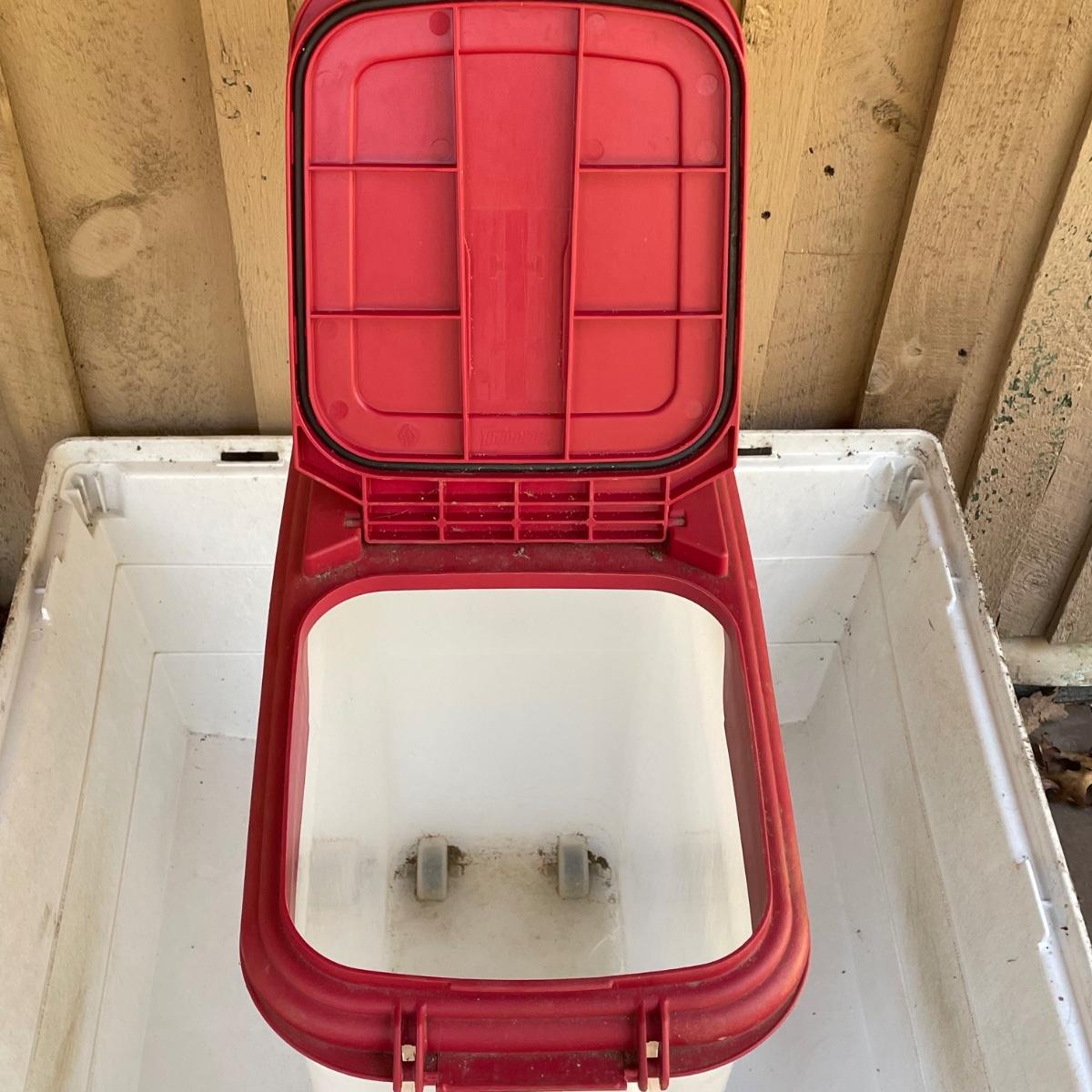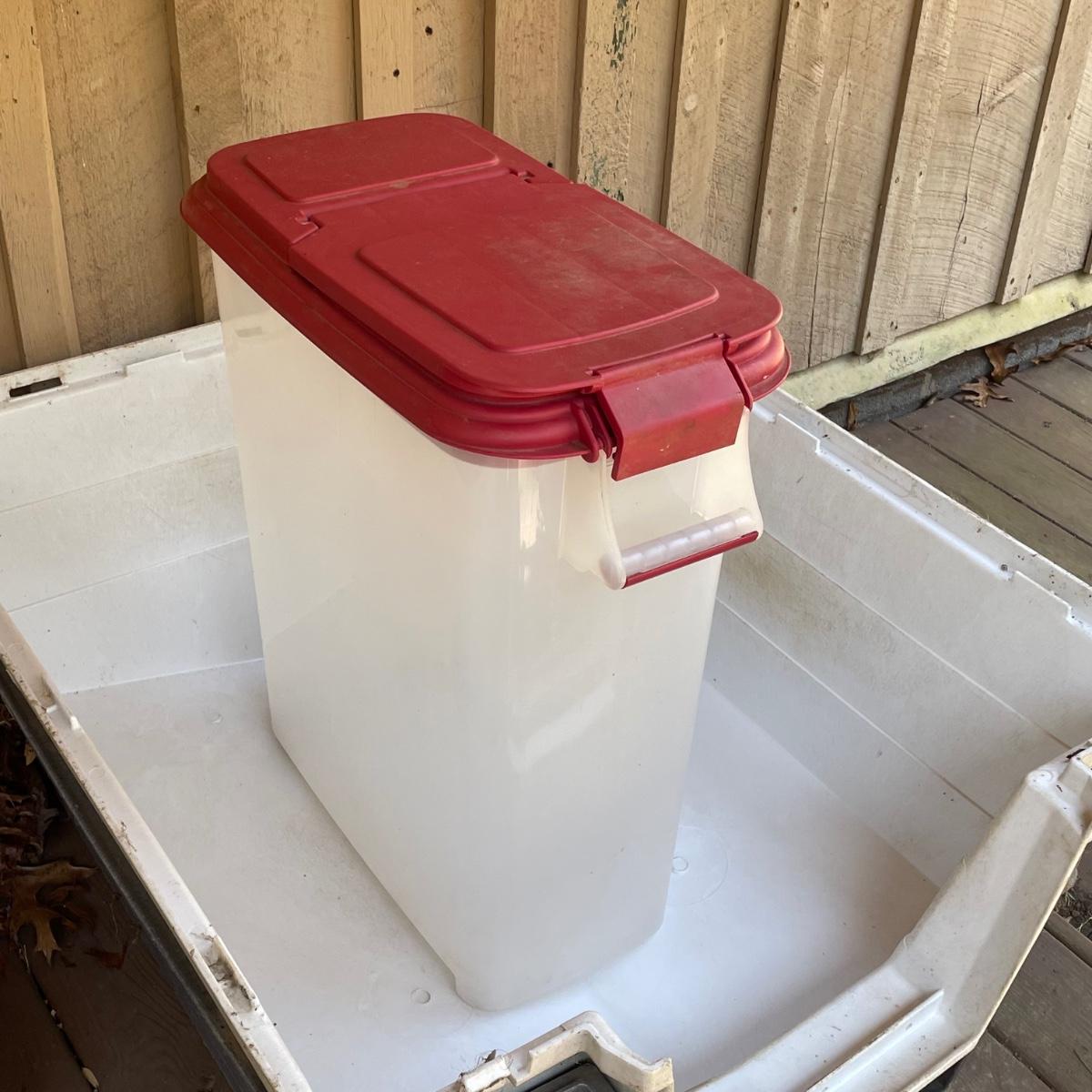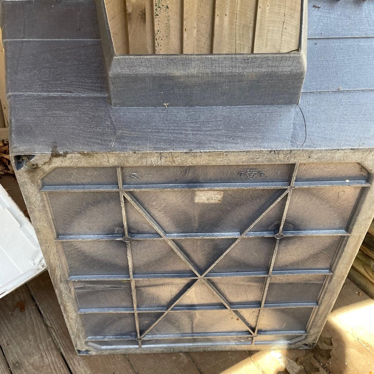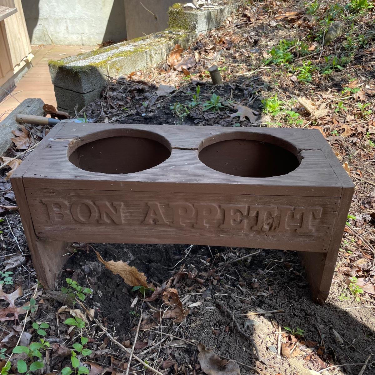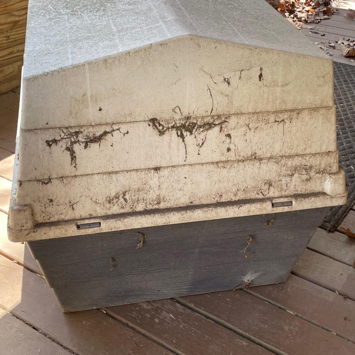 This large dog house measures approximately 38” x 32” x 30”. Lot also includes a large rolling food storage tub that measures 18” x 10” x 25”, a wood food/water bowl stand (a few areas where the wood has split, see images) and a Gentle Paws tool that appears to be lightly used if at all.