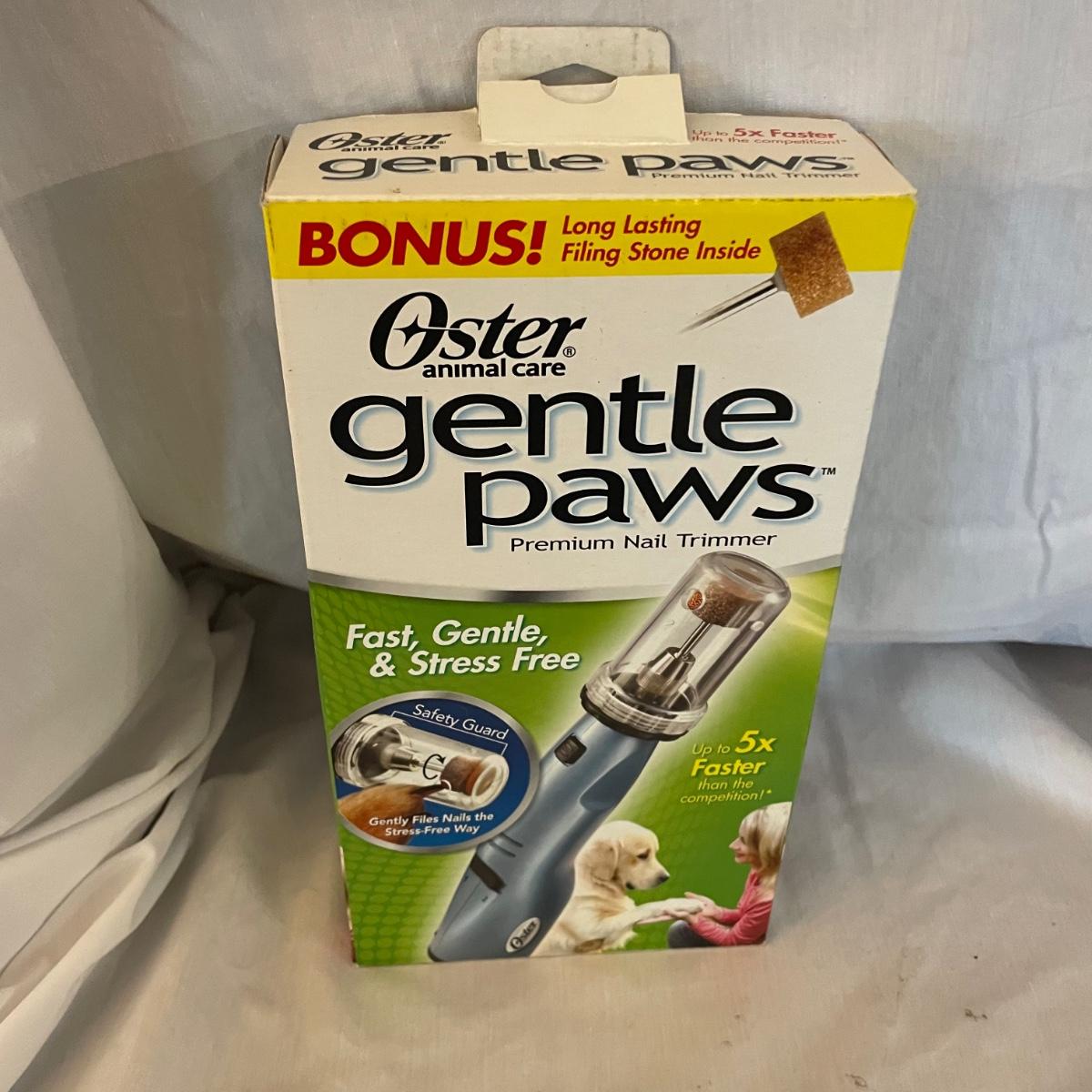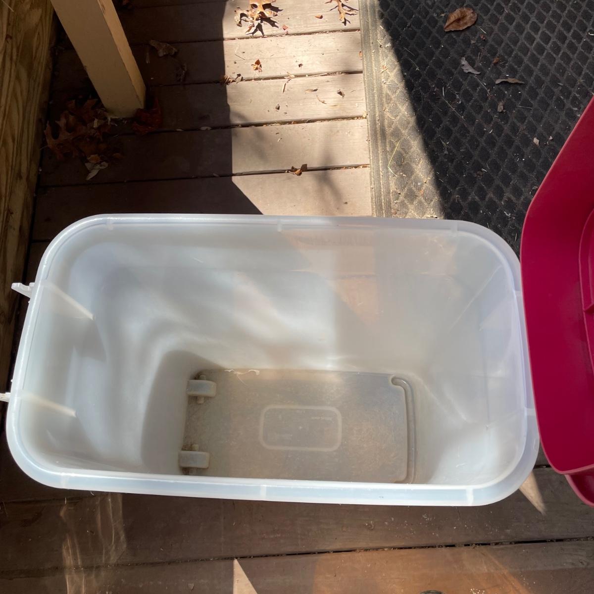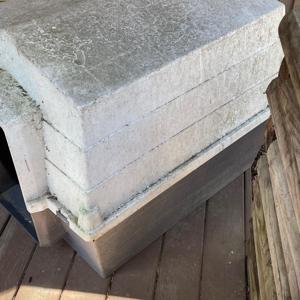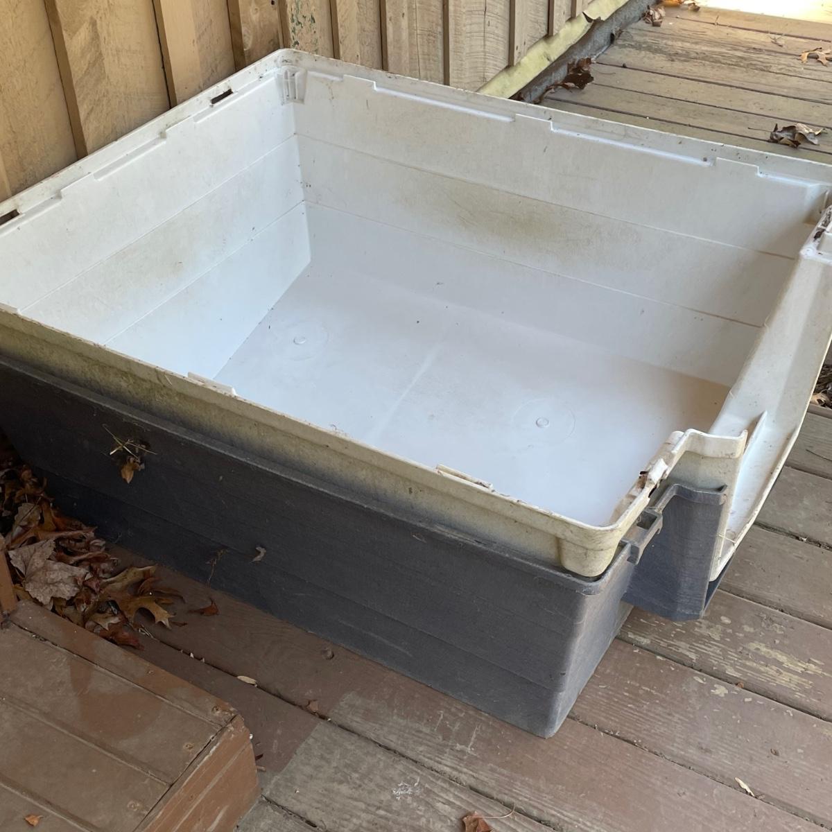 This large dog house measures approximately 38” x 32” x 30”. Lot also includes a large rolling food storage tub that measures 18” x 10” x 25”, a wood food/water bowl stand (a few areas where the wood has split, see images) and a Gentle Paws tool that appears to be lightly used if at all.
