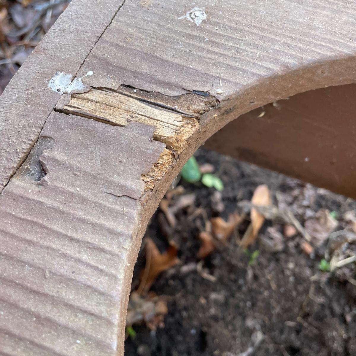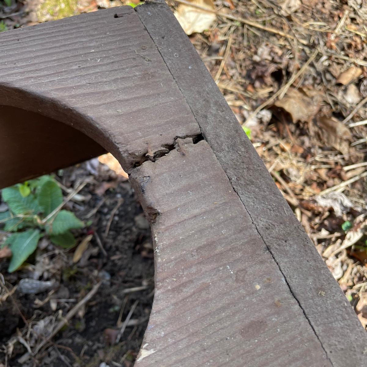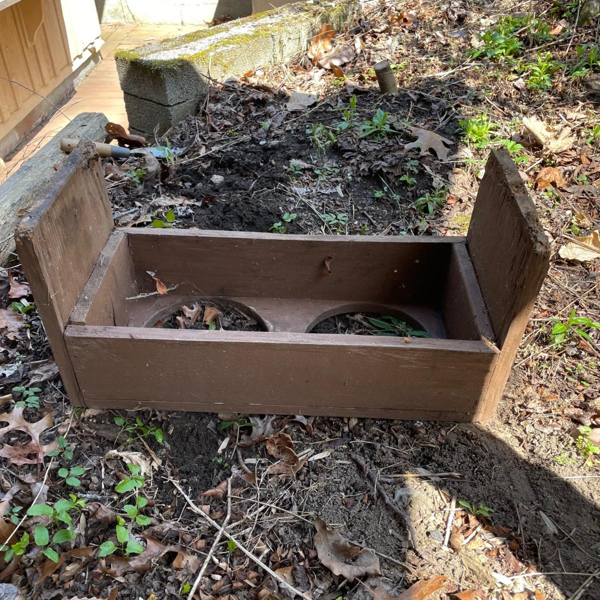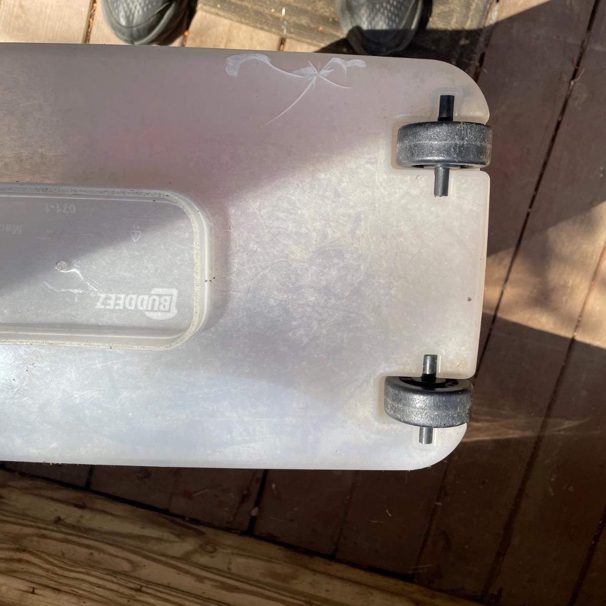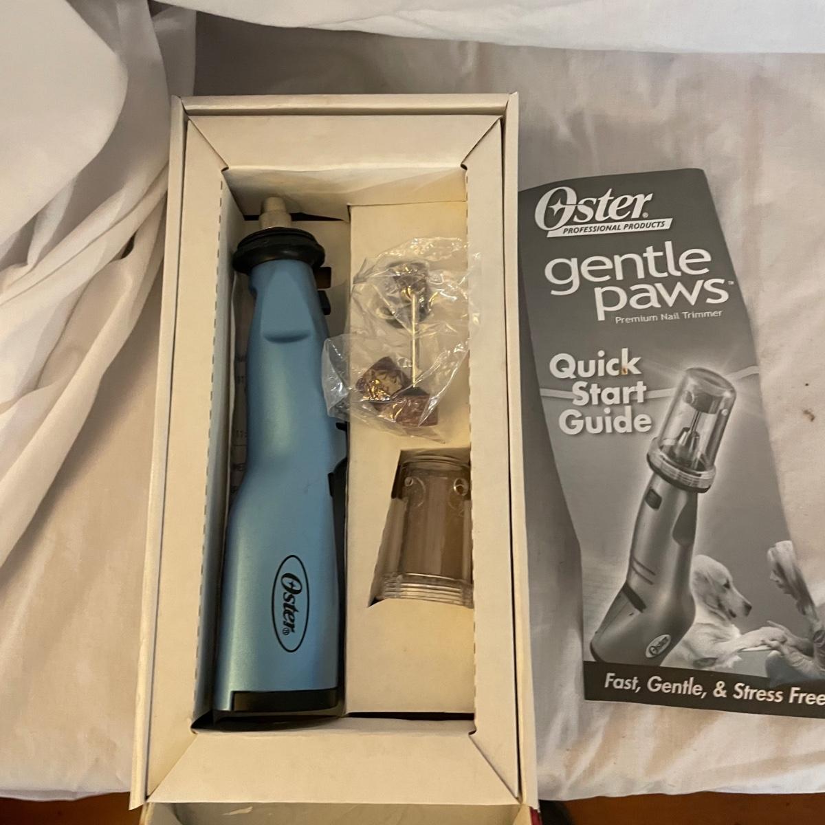 This large dog house measures approximately 38” x 32” x 30”. Lot also includes a large rolling food storage tub that measures 18” x 10” x 25”, a wood food/water bowl stand (a few areas where the wood has split, see images) and a Gentle Paws tool that appears to be lightly used if at all.
