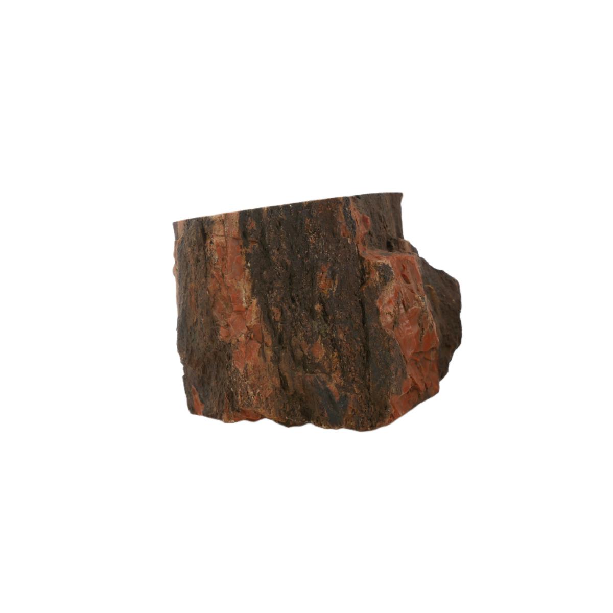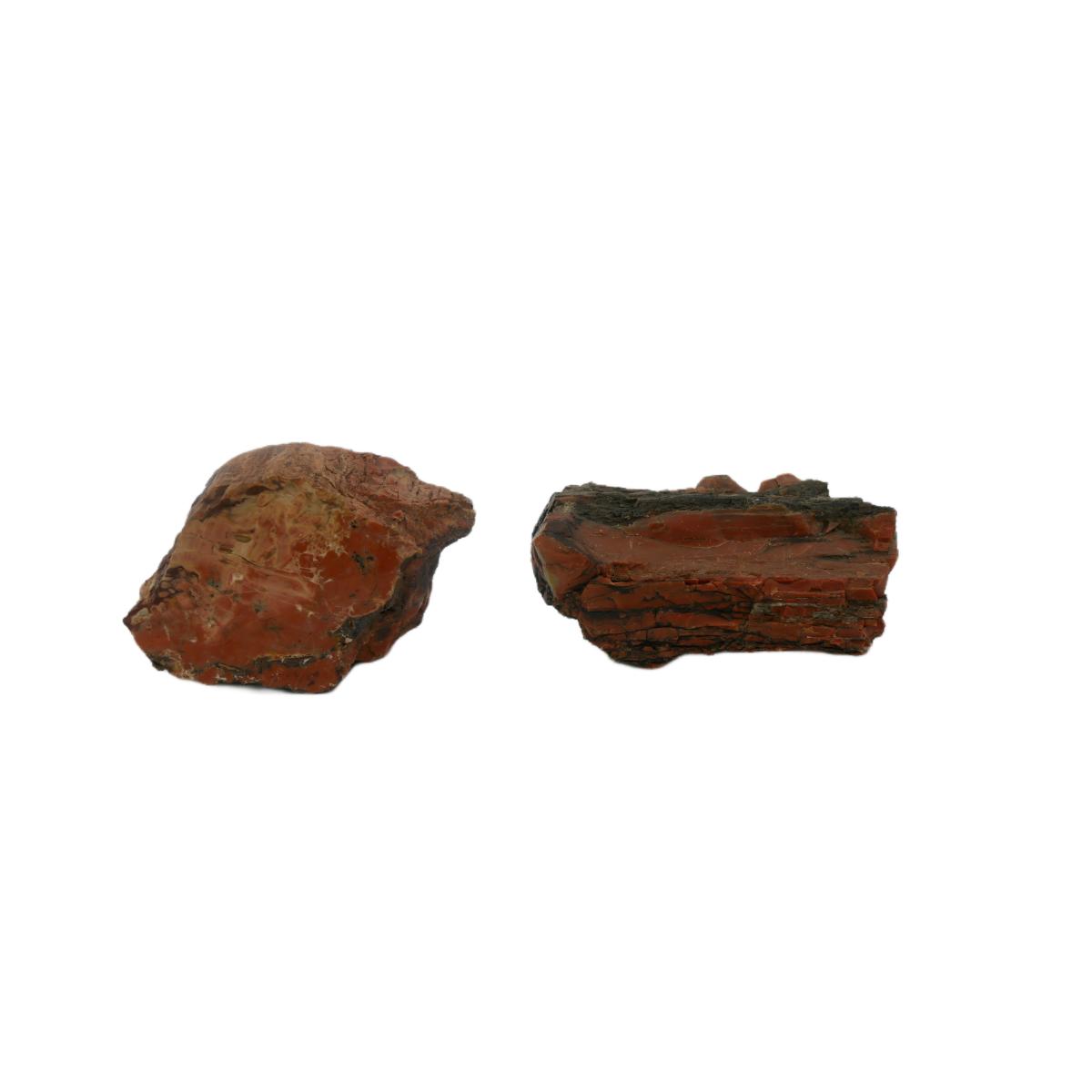 Two petrified wood fossils. Japserized wood with pockets of agate. One has one polished face. The other is fully raw. Gorgeous red color with black striations. Excellent condition. Largest measures L 5" x H 3" x W 3". Lot weighs 2 lb 11 oz. (R5)