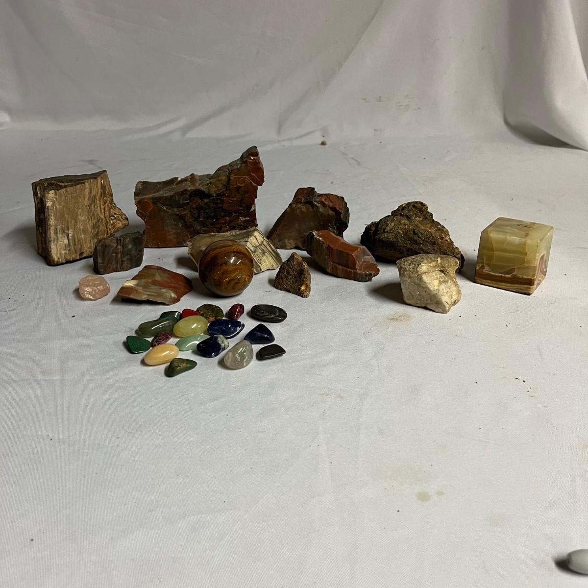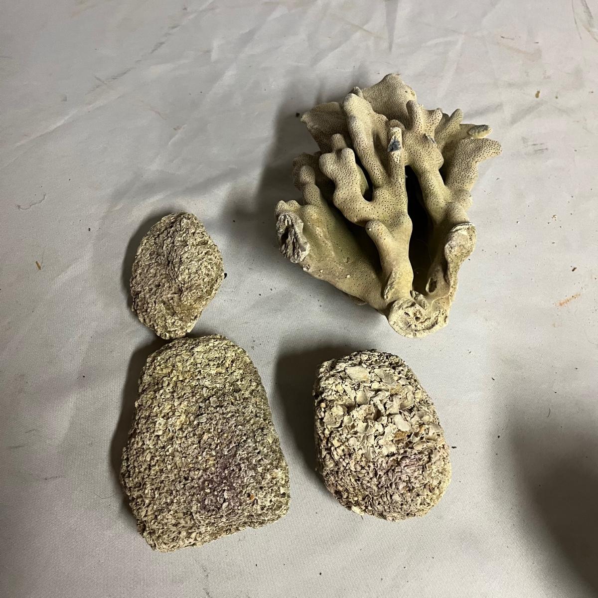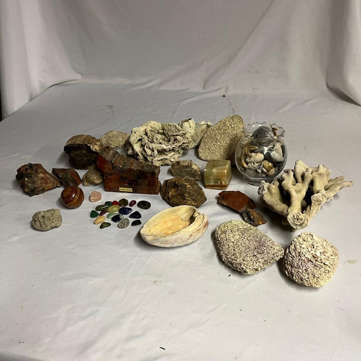 Lot includes assortment of sea shells, petrified wood, polished stones, coral and more. Coral measures 4” x 7” x 10”.