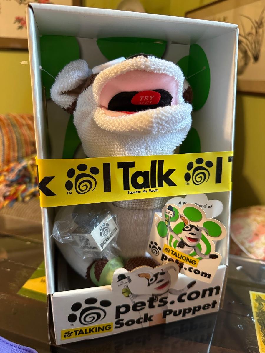 PETS.COM TALKING SOCK PUPPET, PURSE LOT