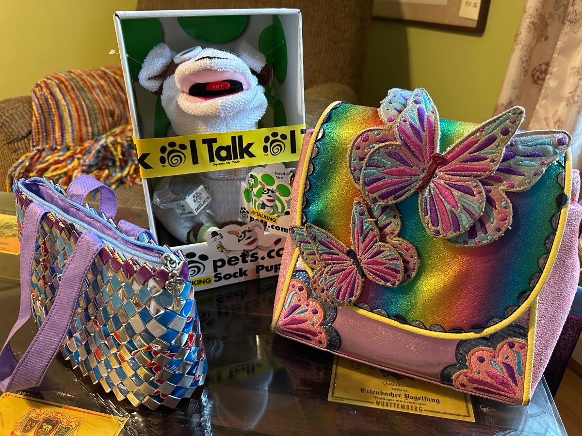 PETS.COM TALKING SOCK PUPPET, BUTTERFLY PURSE, CANDY WRAPPER BAG