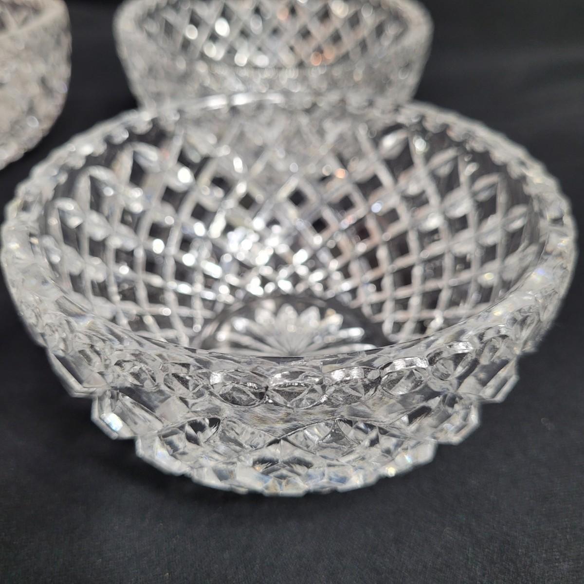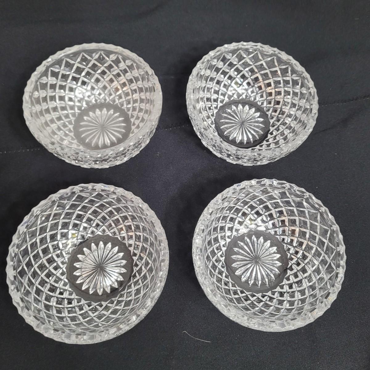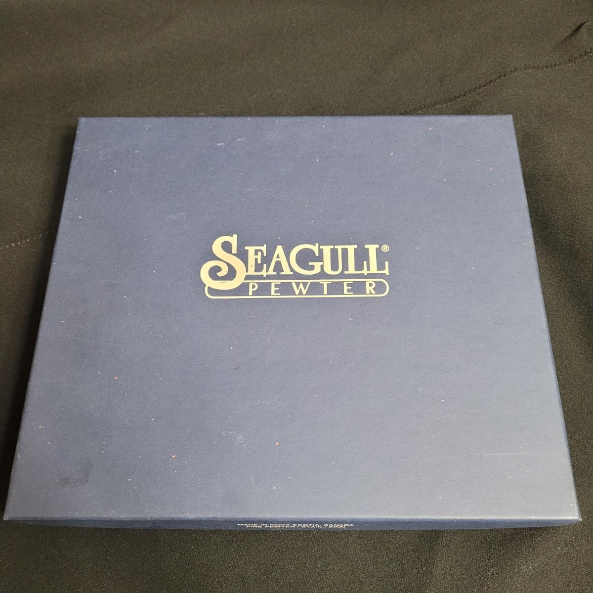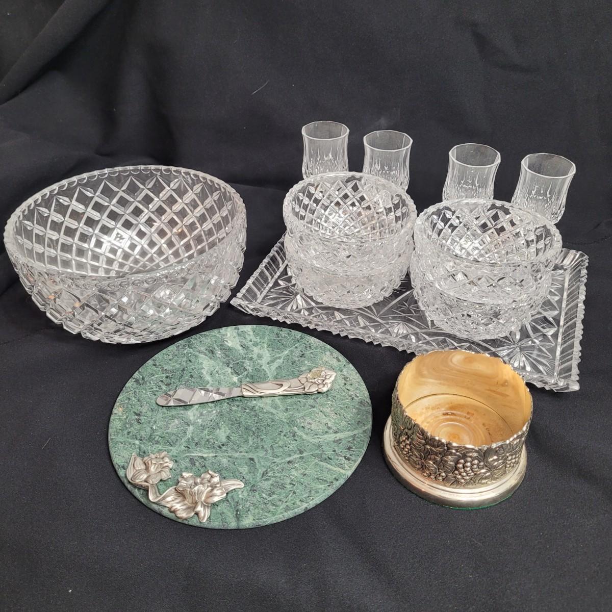 This lot includes one Seagull Pewter brand cheese tray made from marble and pewter, ten piece crystal glass serving set, and a silver plate bottle holder. The cheese board measures 8" x 8" x 1"H and includes a pewter knife and its original packaging. The crystal glass set includes a large bowl with an 8" diameter, four smaller bowls, four sherry glasses, and a rectangular serving tray. The silver plated item appears to be a candle or coaster holder. See photos for more detail on individual items.