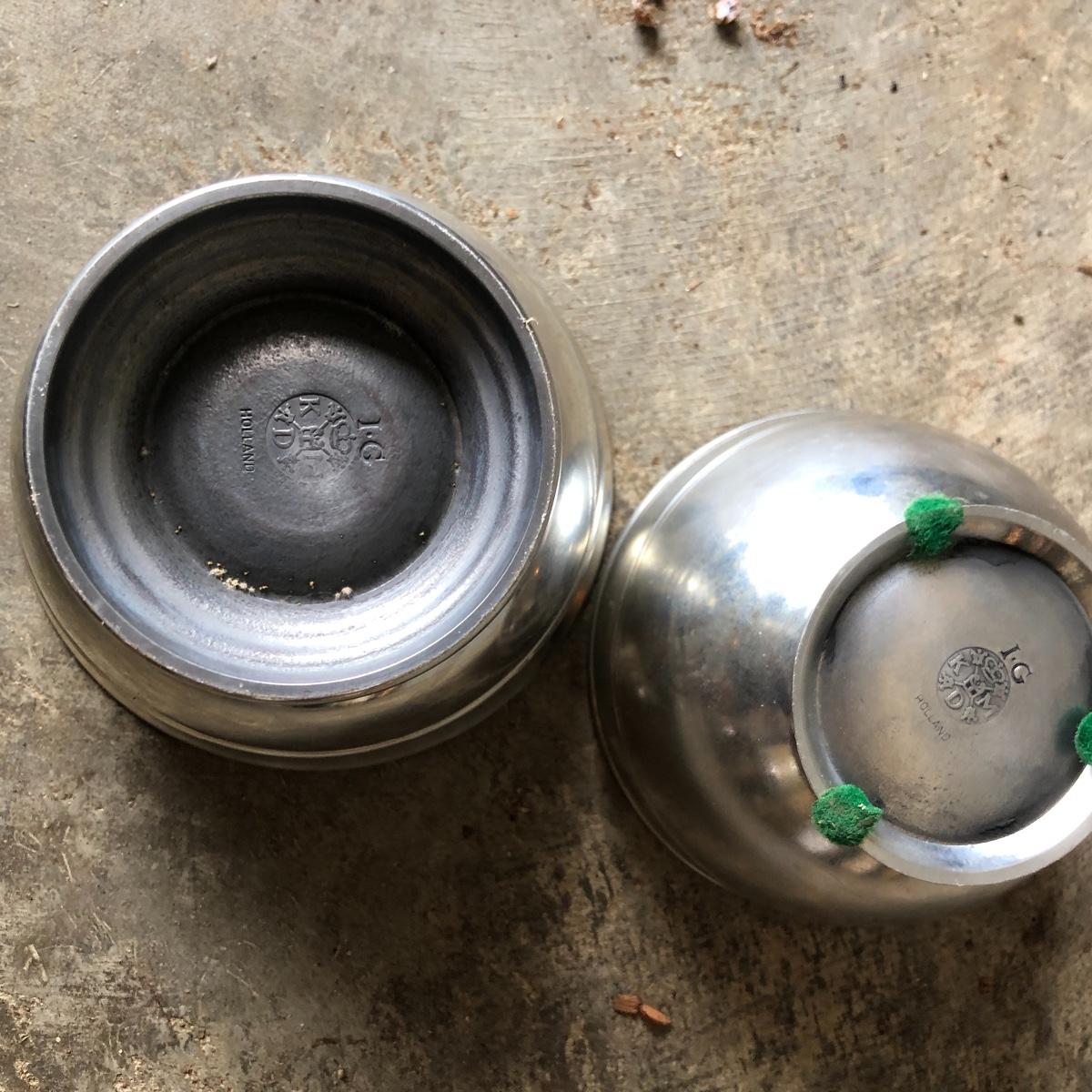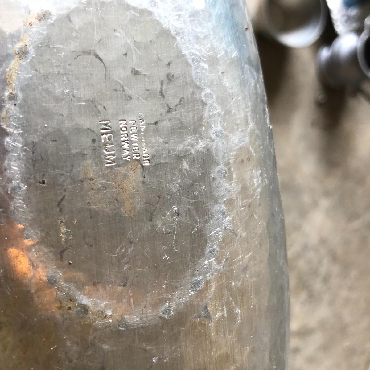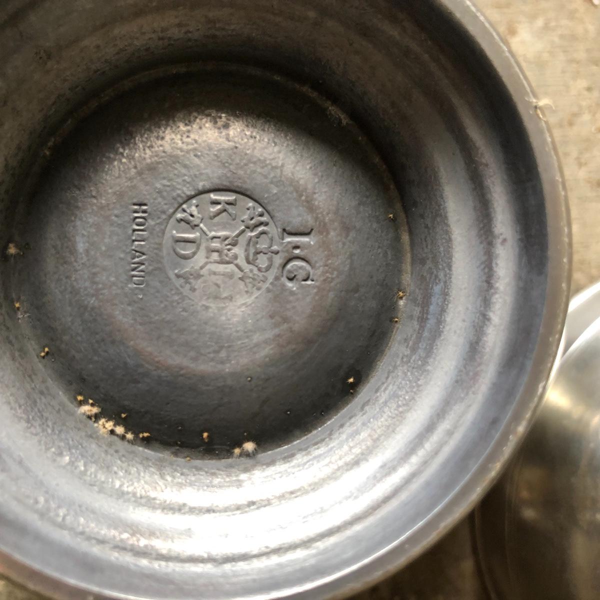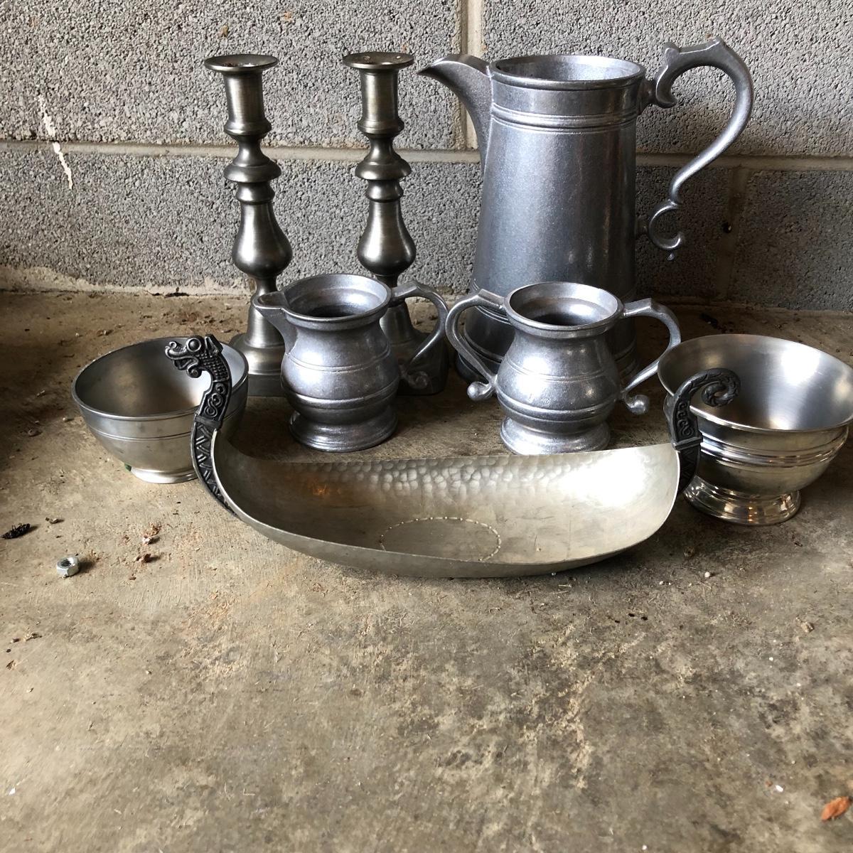 Lot includes pewter pitcher, Norwegian boat dish,,pair of candlesticks, cream and sugar dishes and two small bowls marked KDM Holland that are heavier than they look.