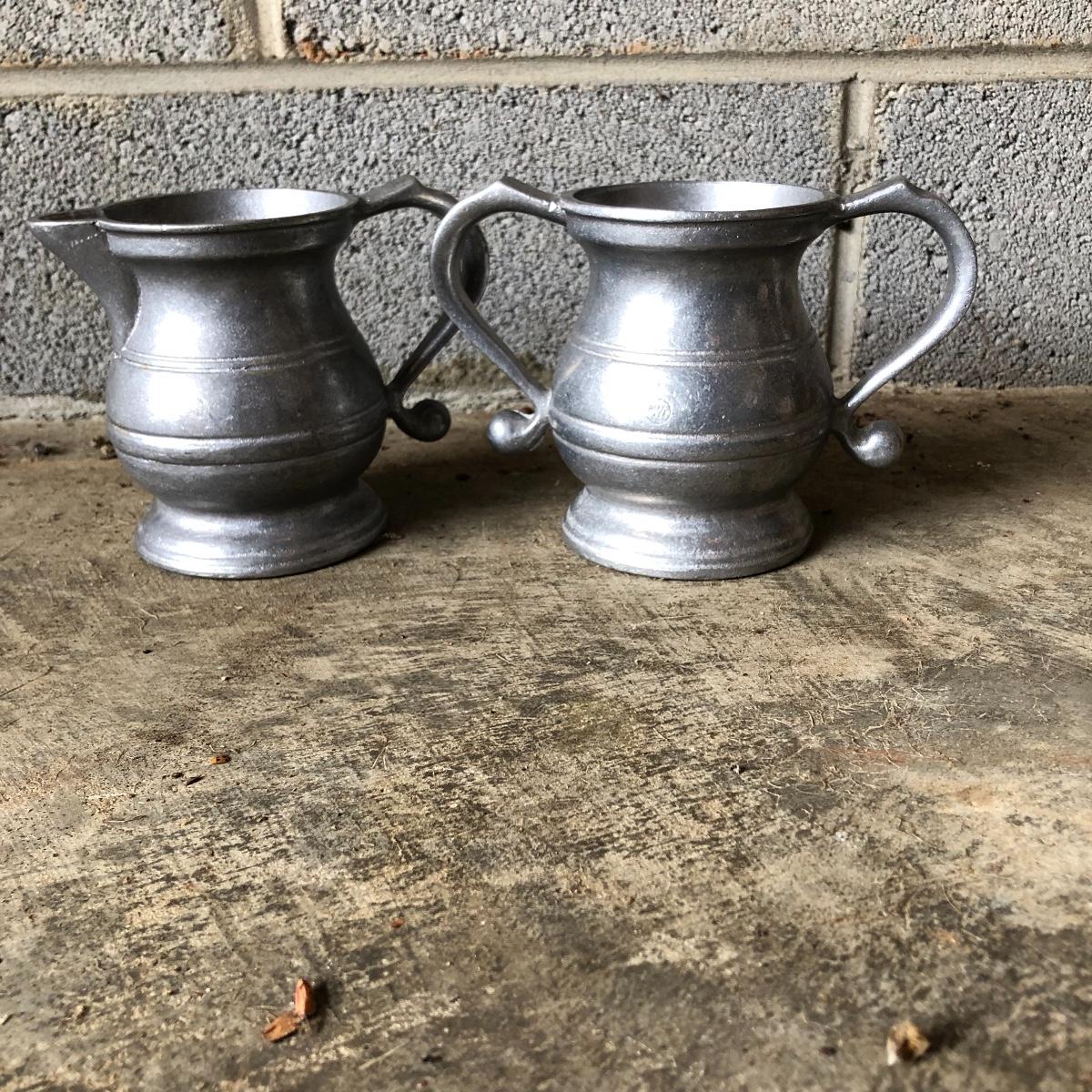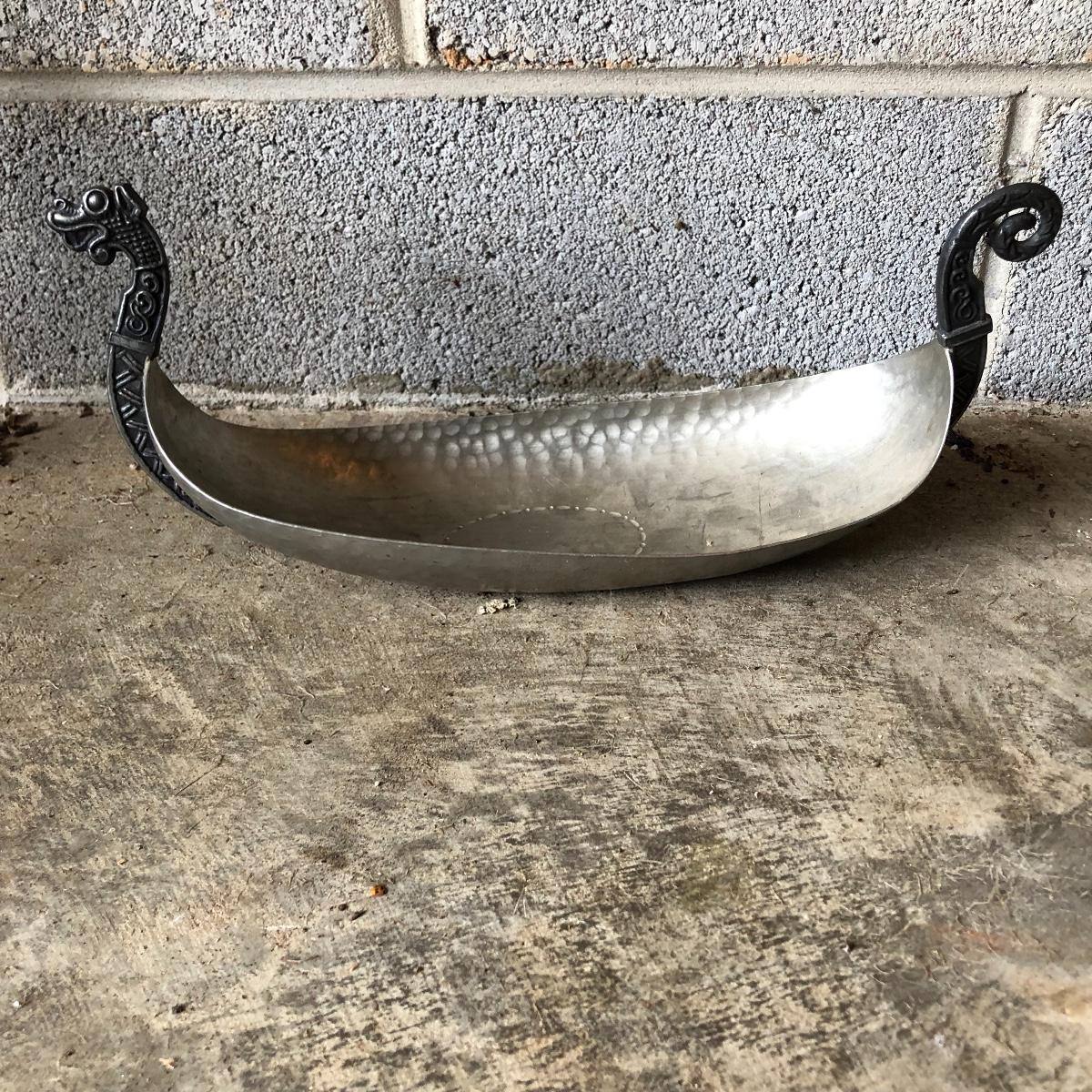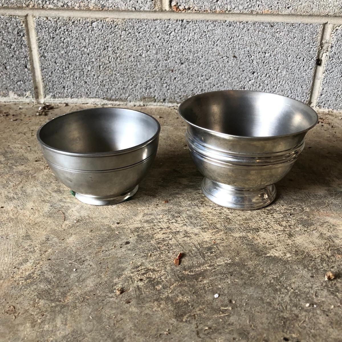 Lot includes pewter pitcher, Norwegian boat dish,,pair of candlesticks, cream and sugar dishes and two small bowls marked KDM Holland that are heavier than they look.