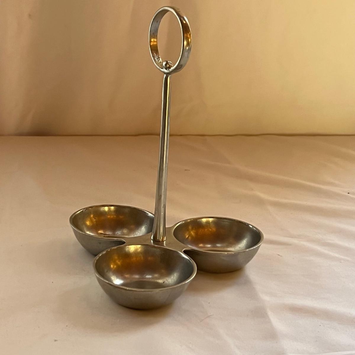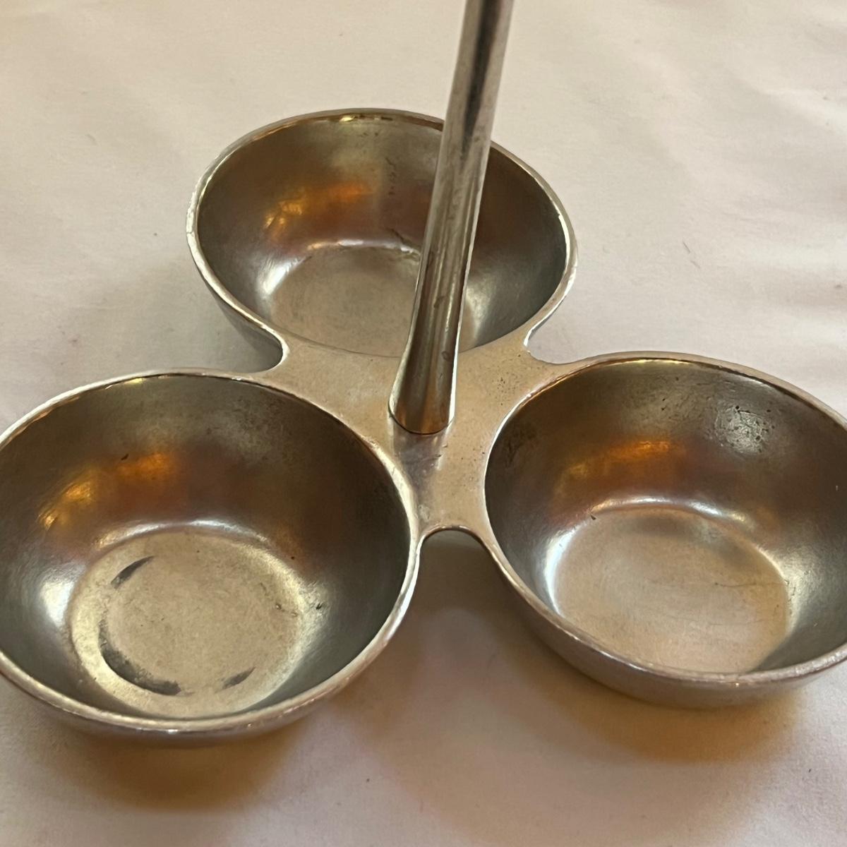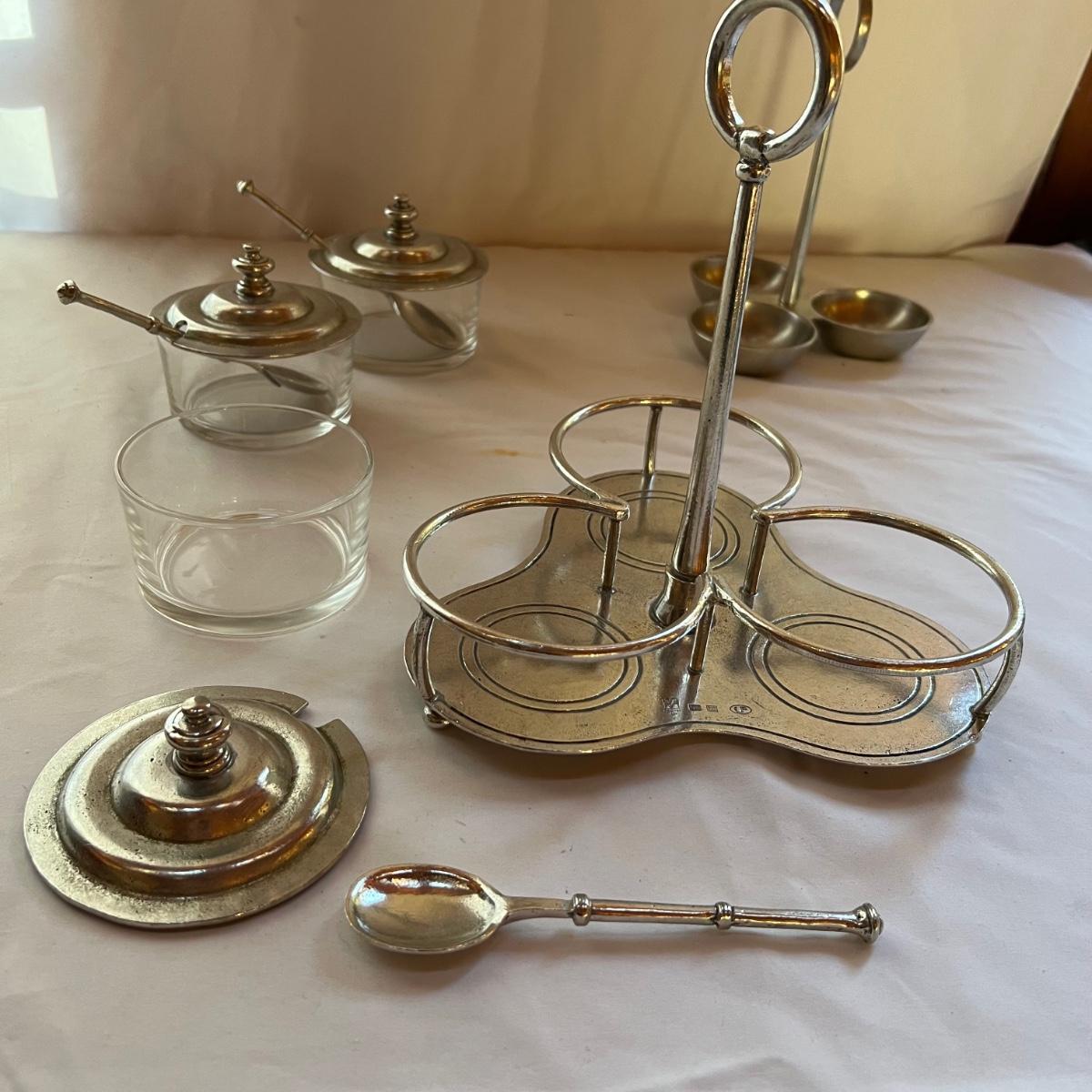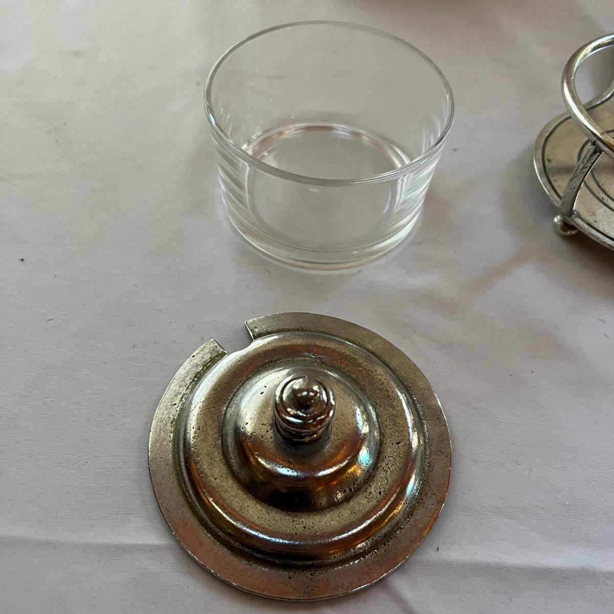 Two pewter servers that each have three compartments. The larger of the two is stamped Made in Italy and has pewter lids and spoons with glass bowls that measure 3.5” x 2.5”. The smaller piece has a dark, possibly permanent dark ring in one cup.
