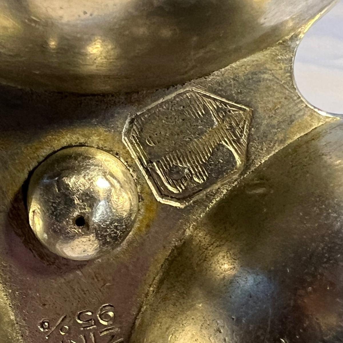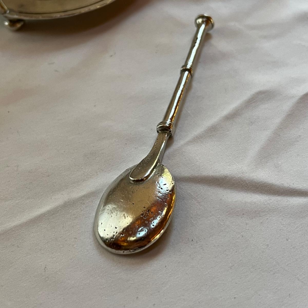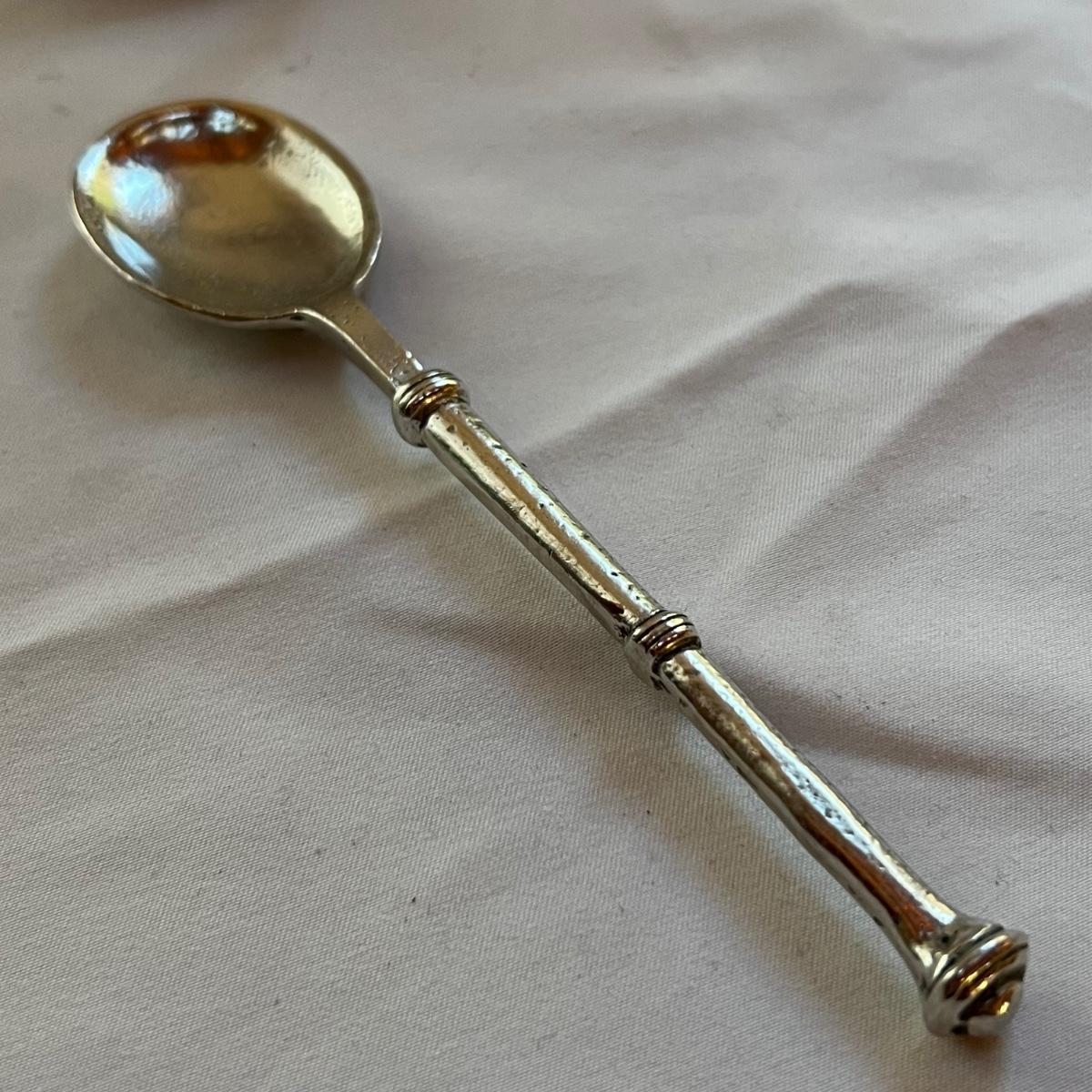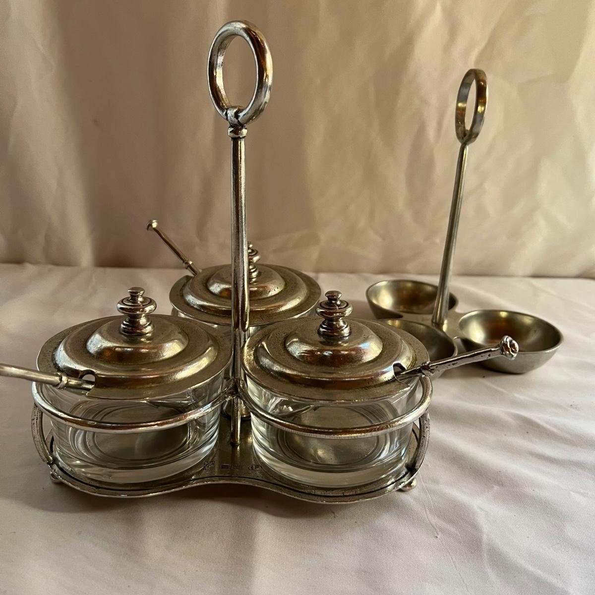 Two pewter servers that each have three compartments. The larger of the two is stamped Made in Italy and has pewter lids and spoons with glass bowls that measure 3.5” x 2.5”. The smaller piece has a dark, possibly permanent dark ring in one cup.