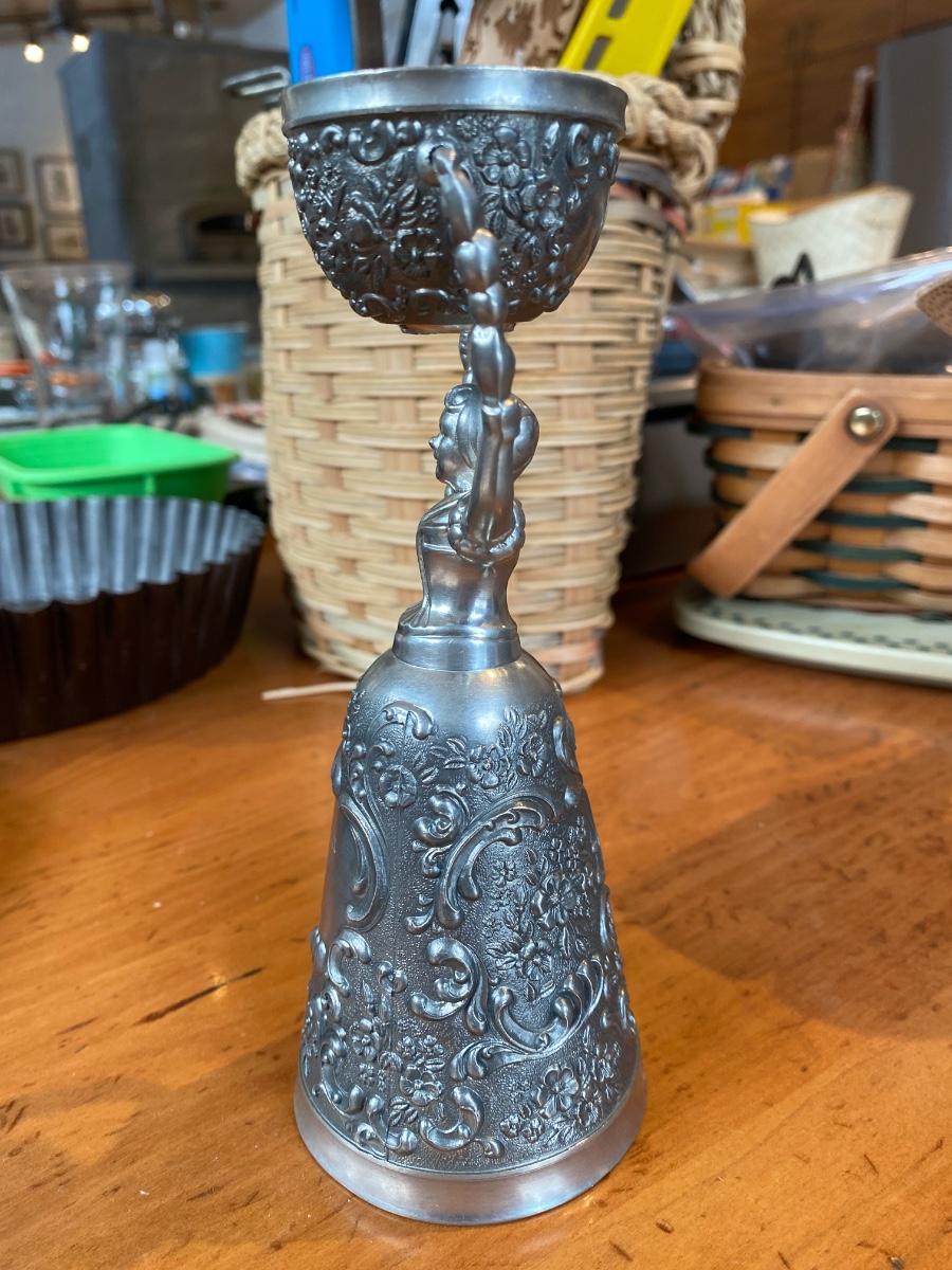 This unique pewter goblet is a German traditional gift. It is for the bride and groom to take a drink from at the same time. It was never used. It has my name engraved into the front of the women's dress, but that could be buffed out my a metal worker. Would make a great gift to newly weds.