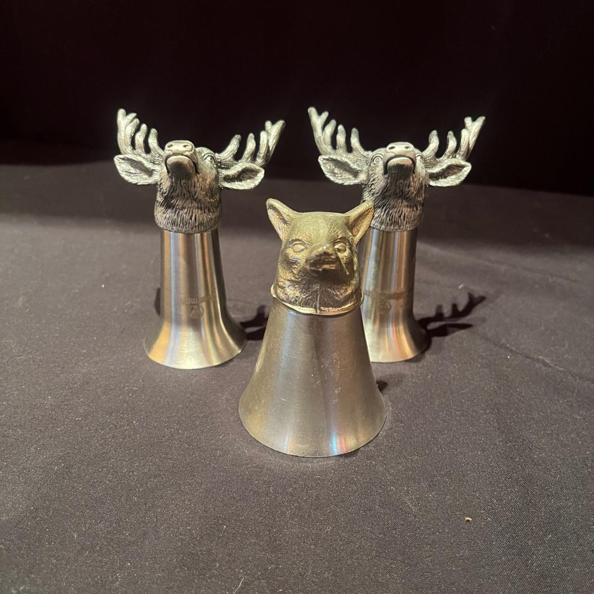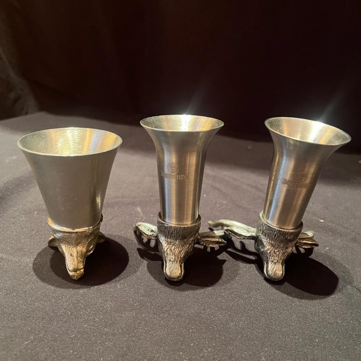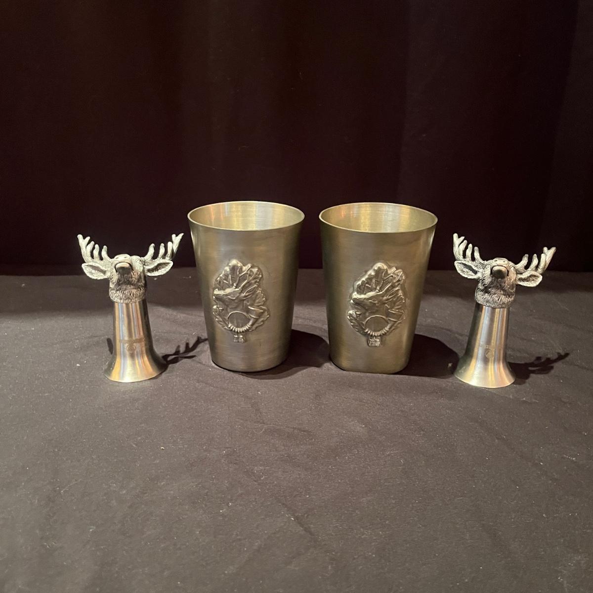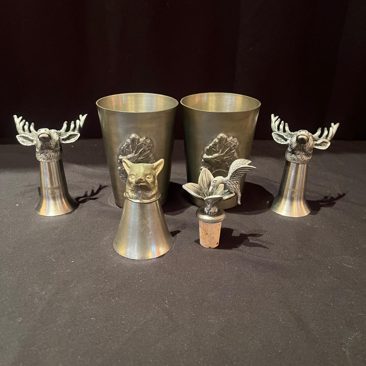 Lot includes two pewter cups, two deer head Jagermeister pewter shot glasses, pewter fox head shot glass and a pewter Hummingbird bottle stopper. Cups are marked 'Gilde Zinn 92%' and measure 3”D x 4.25”H.