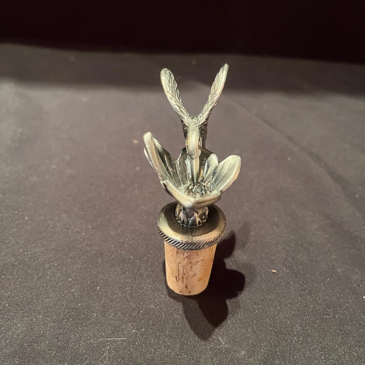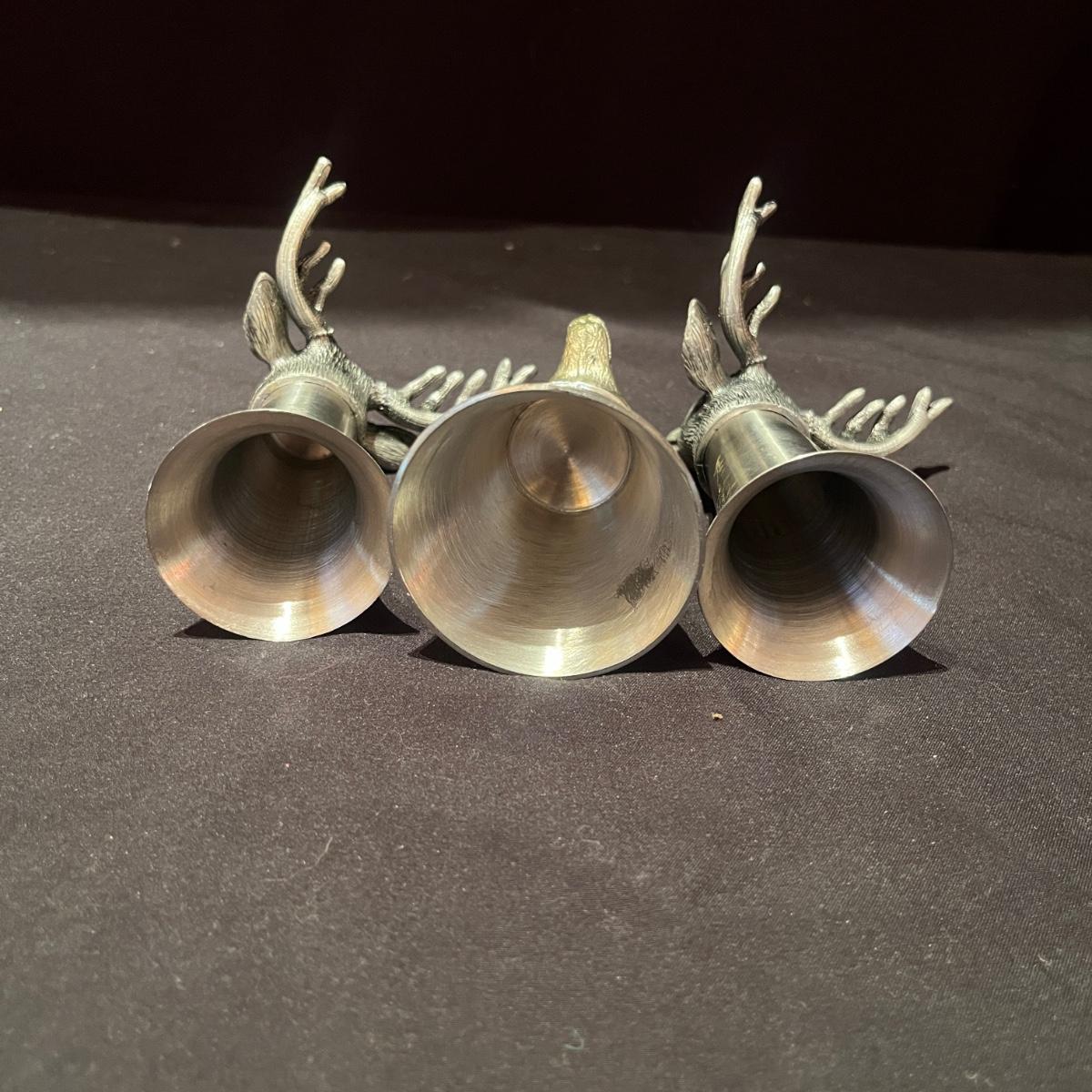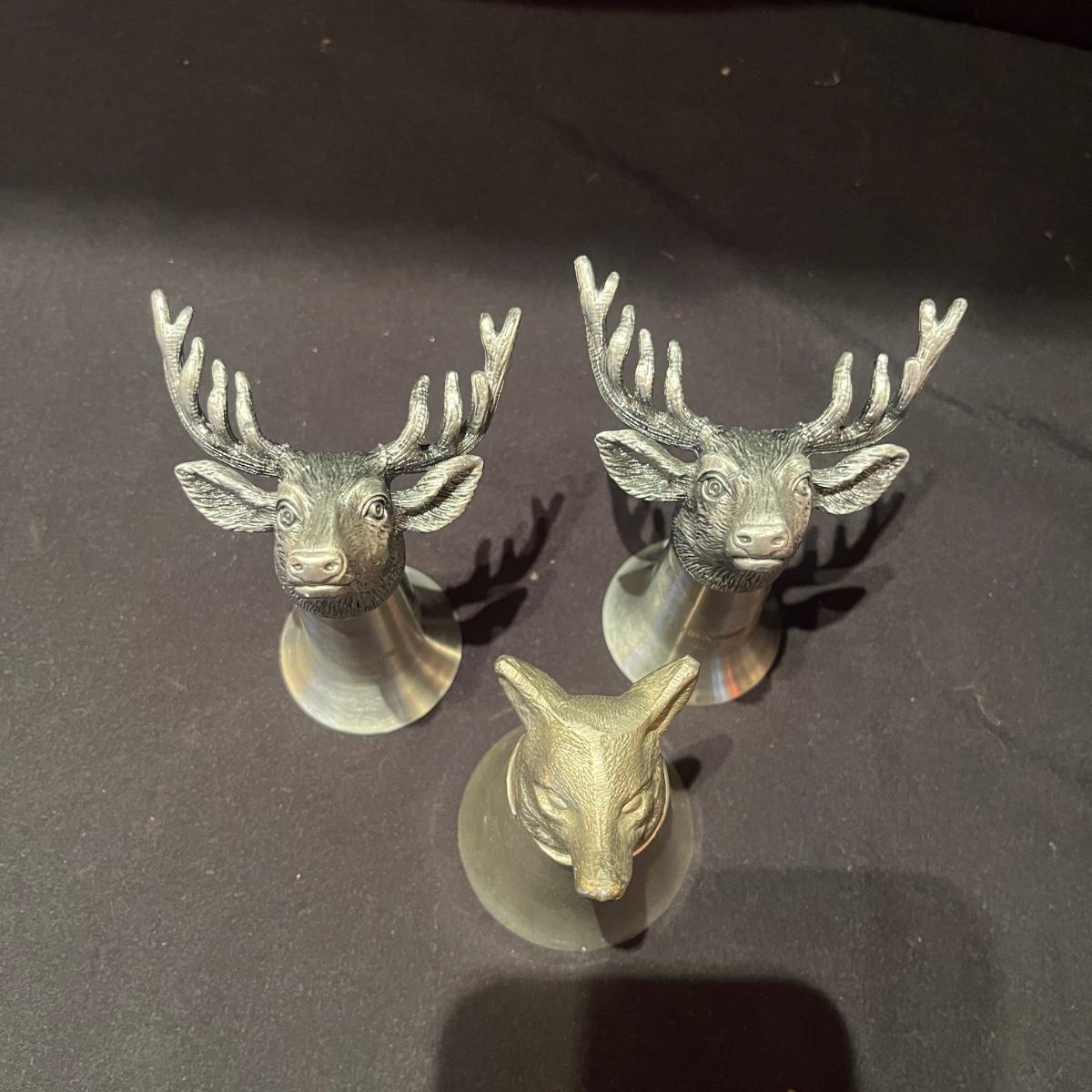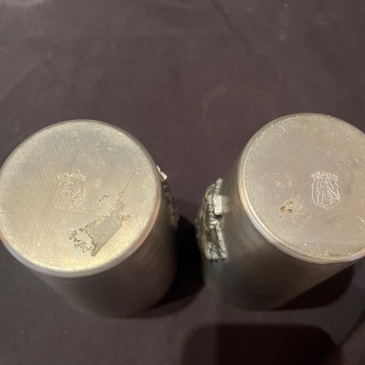 Lot includes two pewter cups, two deer head Jagermeister pewter shot glasses, pewter fox head shot glass and a pewter Hummingbird bottle stopper. Cups are marked 'Gilde Zinn 92%' and measure 3”D x 4.25”H.