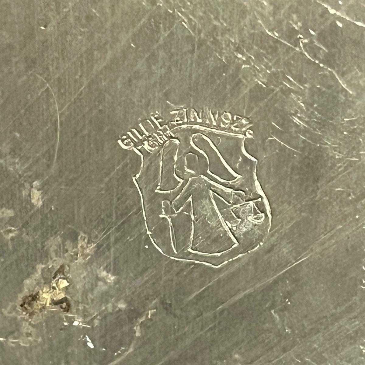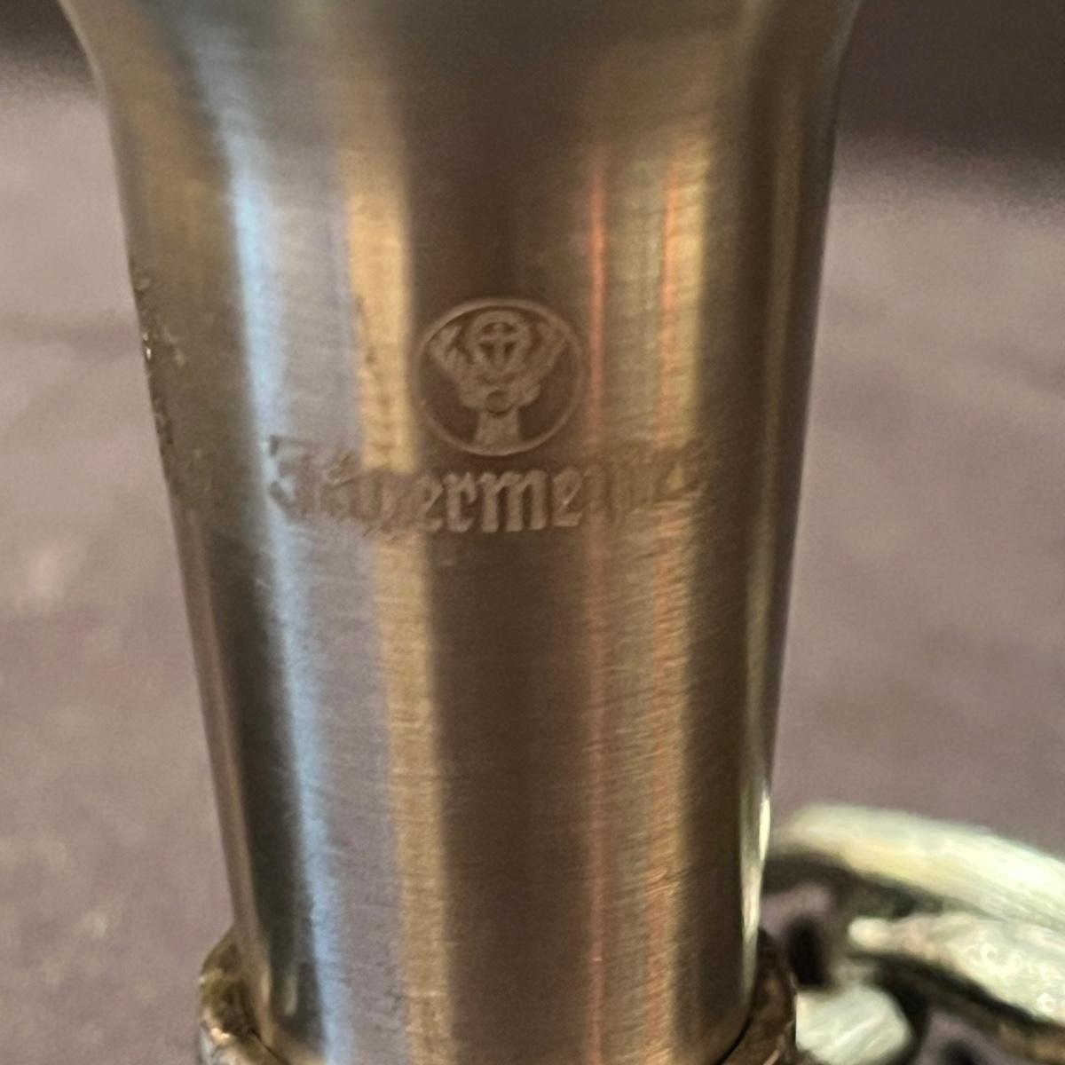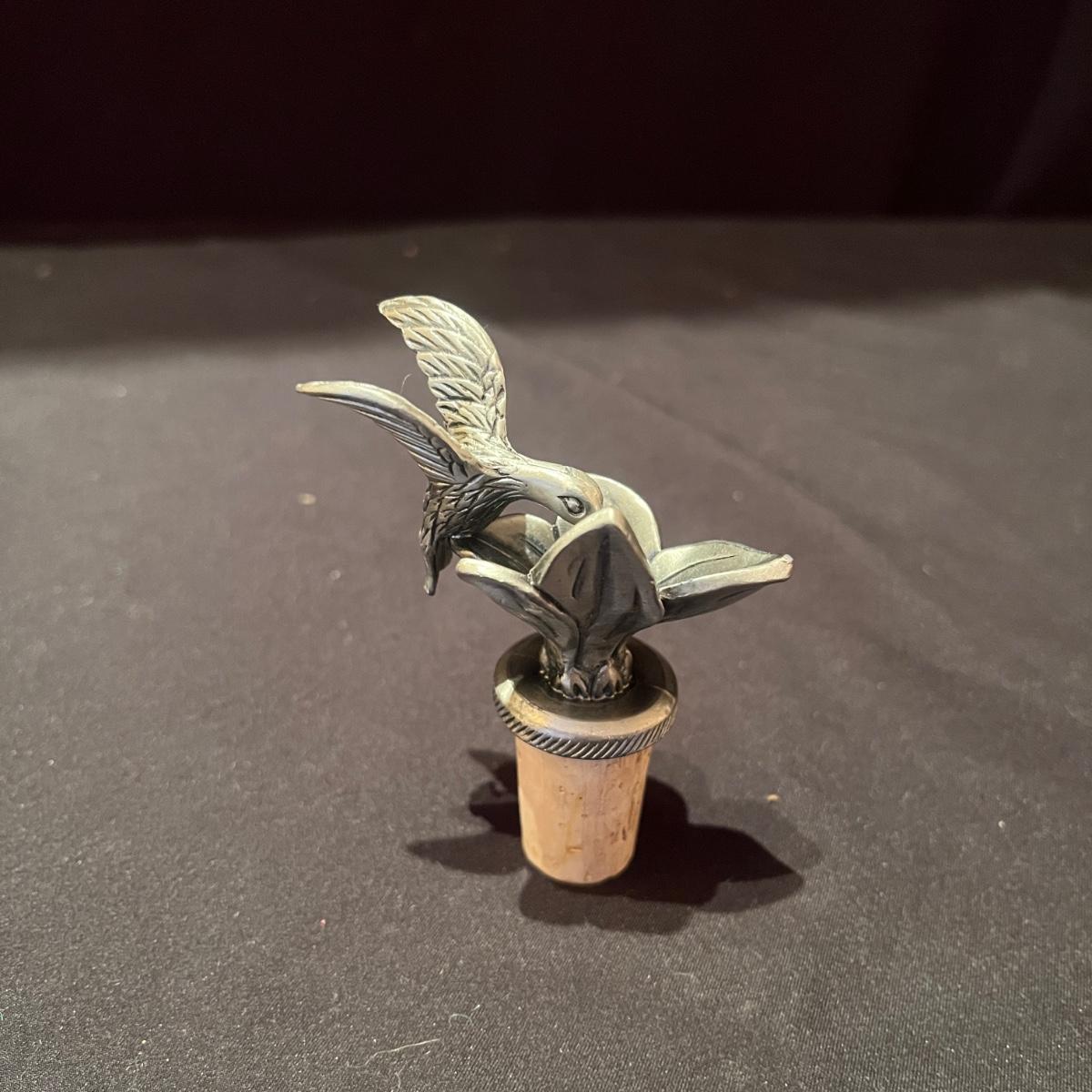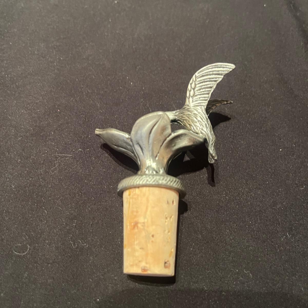 Lot includes two pewter cups, two deer head Jagermeister pewter shot glasses, pewter fox head shot glass and a pewter Hummingbird bottle stopper. Cups are marked 'Gilde Zinn 92%' and measure 3”D x 4.25”H.
