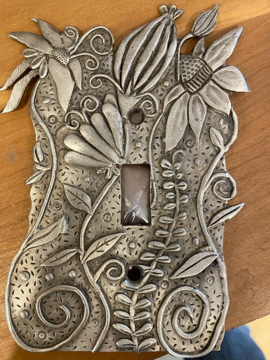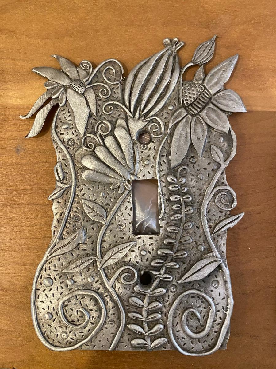 Handmade switch plate made of pewter metal. Pretty floral design. Includes hardware. Never used.