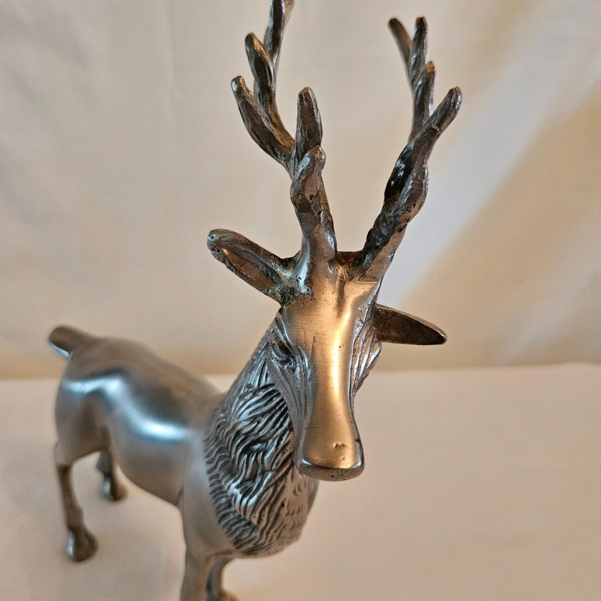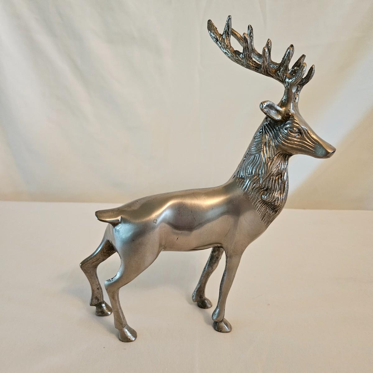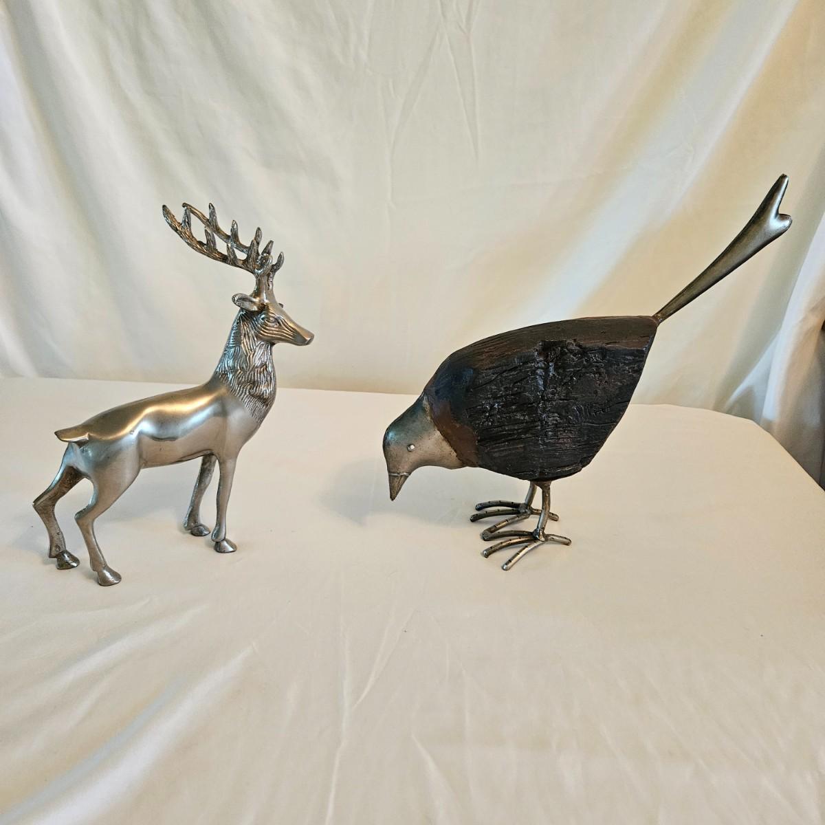 A pair animal statues that includes a deer and a bird. The deer is made if pewter and measures approximately 7" x 4" x 10"H. The bird is constructed of a rustic wood body with a metal tail, feet and head. Shipping available