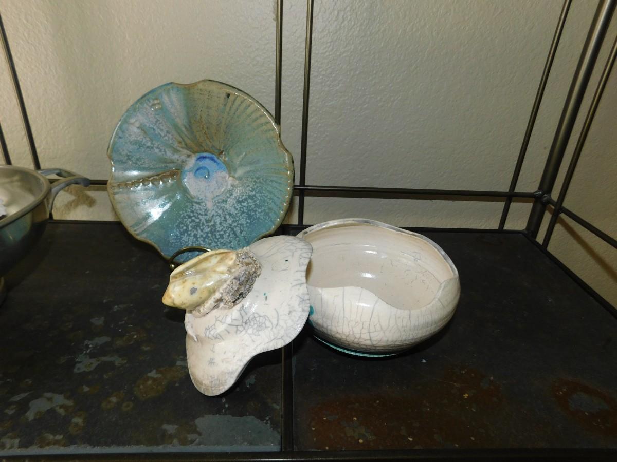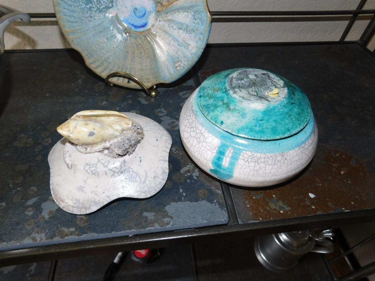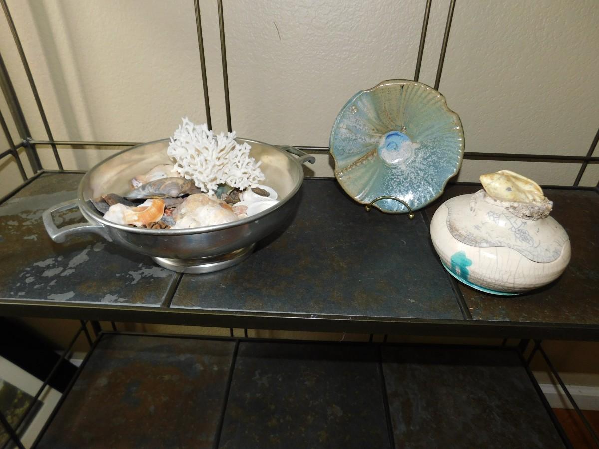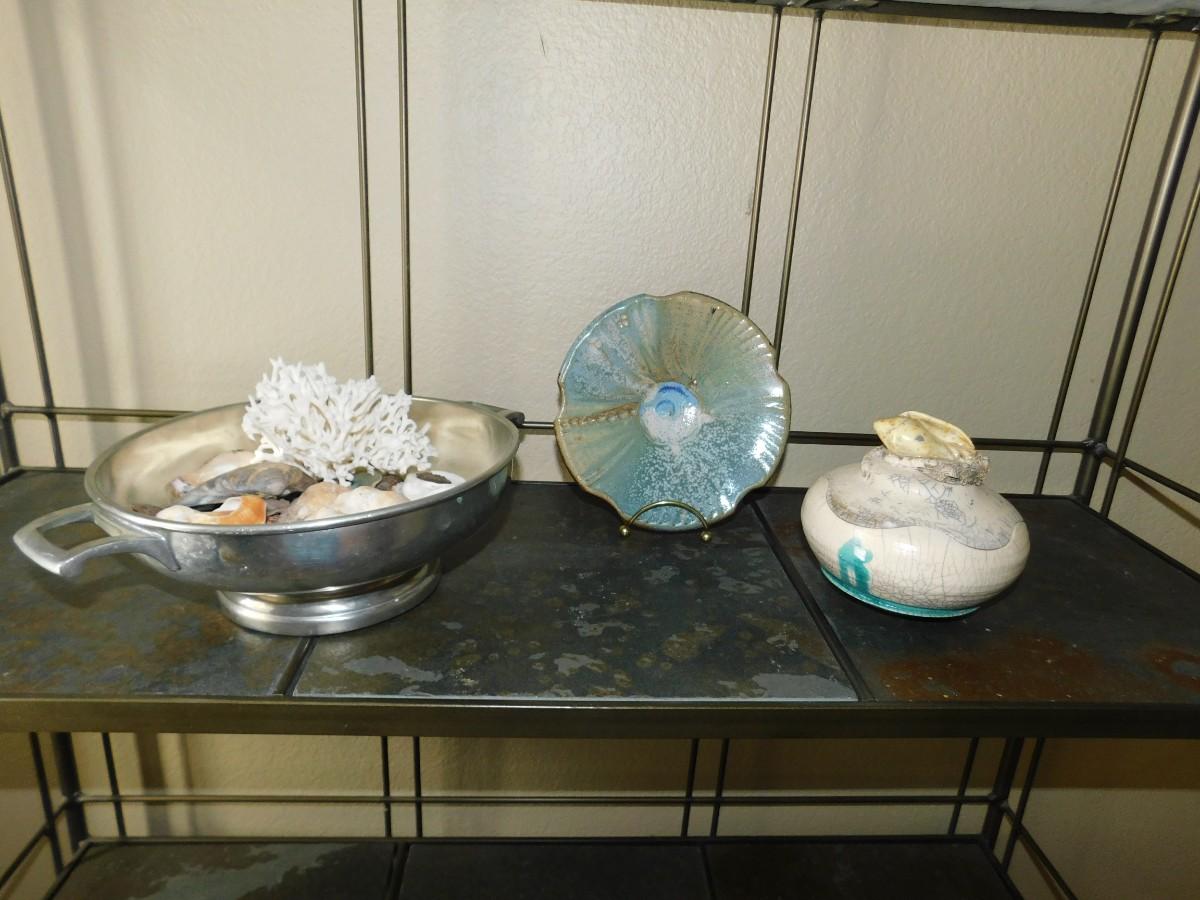 PEWTER DISH FULL OF SEA SHELLS AND SIMILAR SIGNED POTTERY