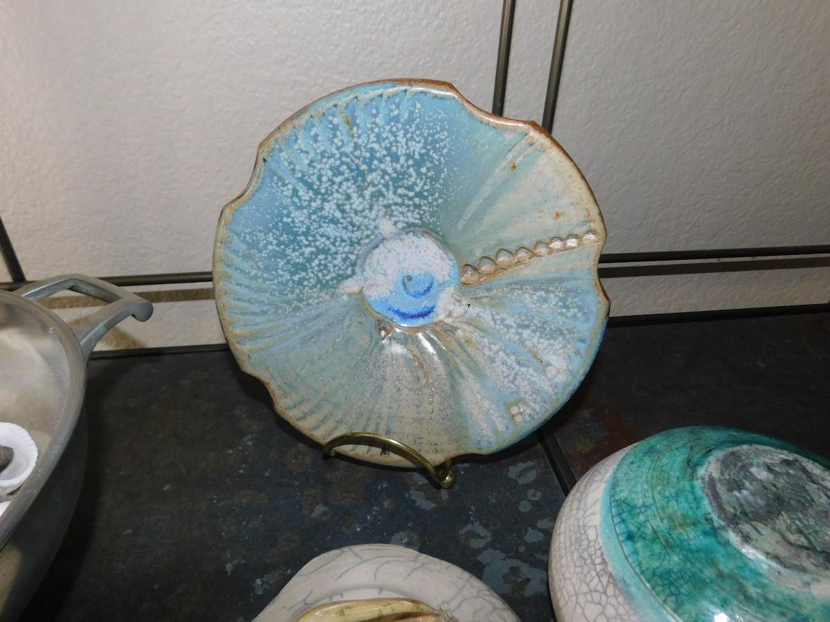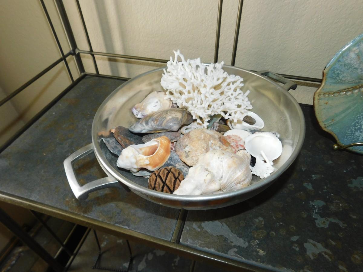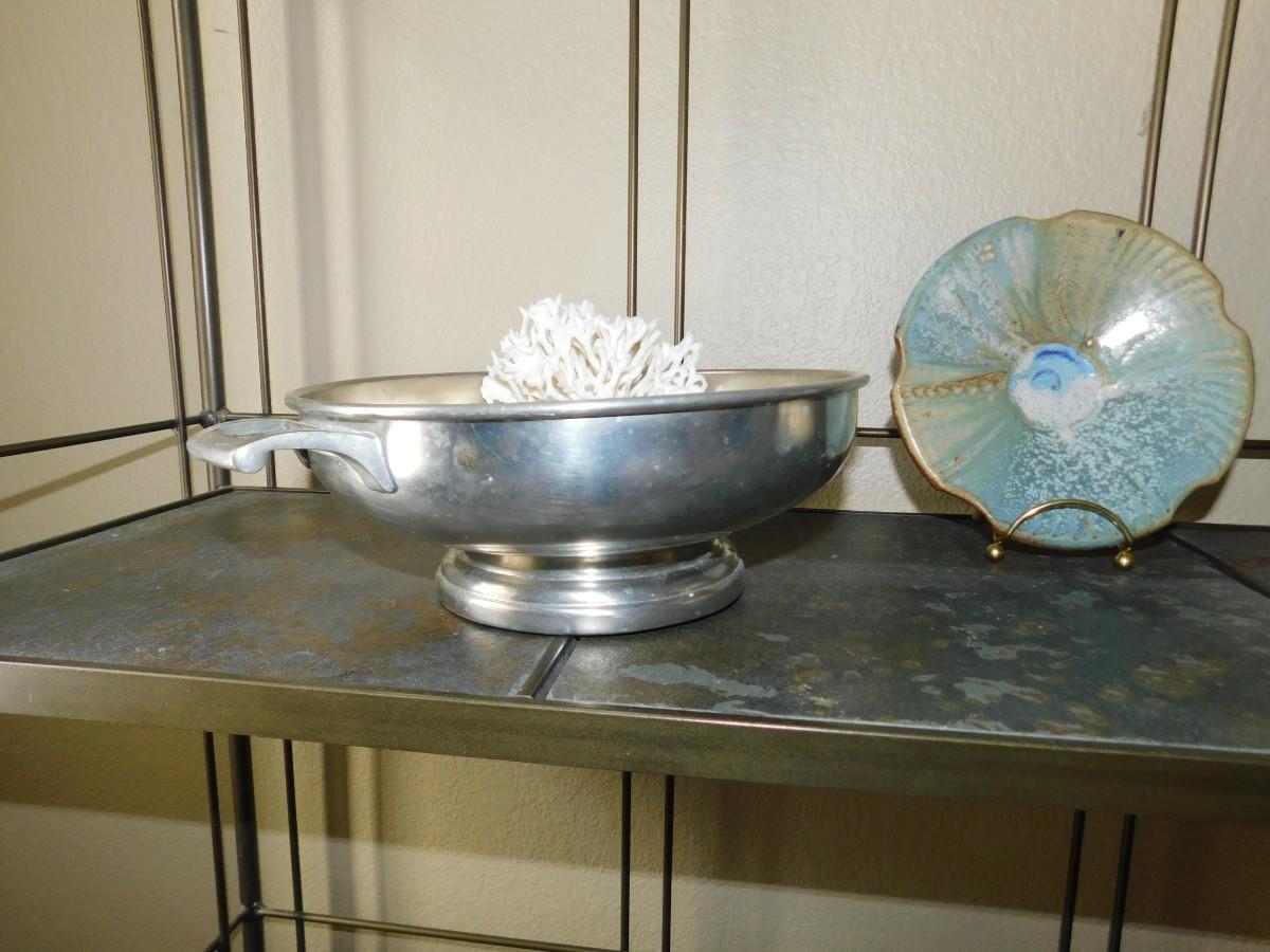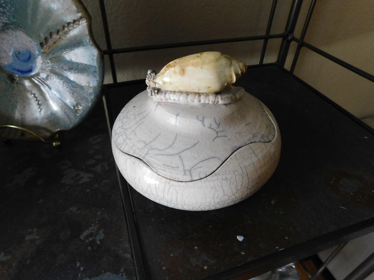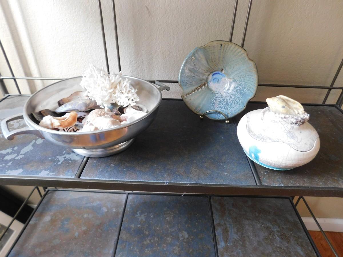 PEWTER DISH FULL OF SEA SHELLS AND SIMILAR SIGNED POTTERY