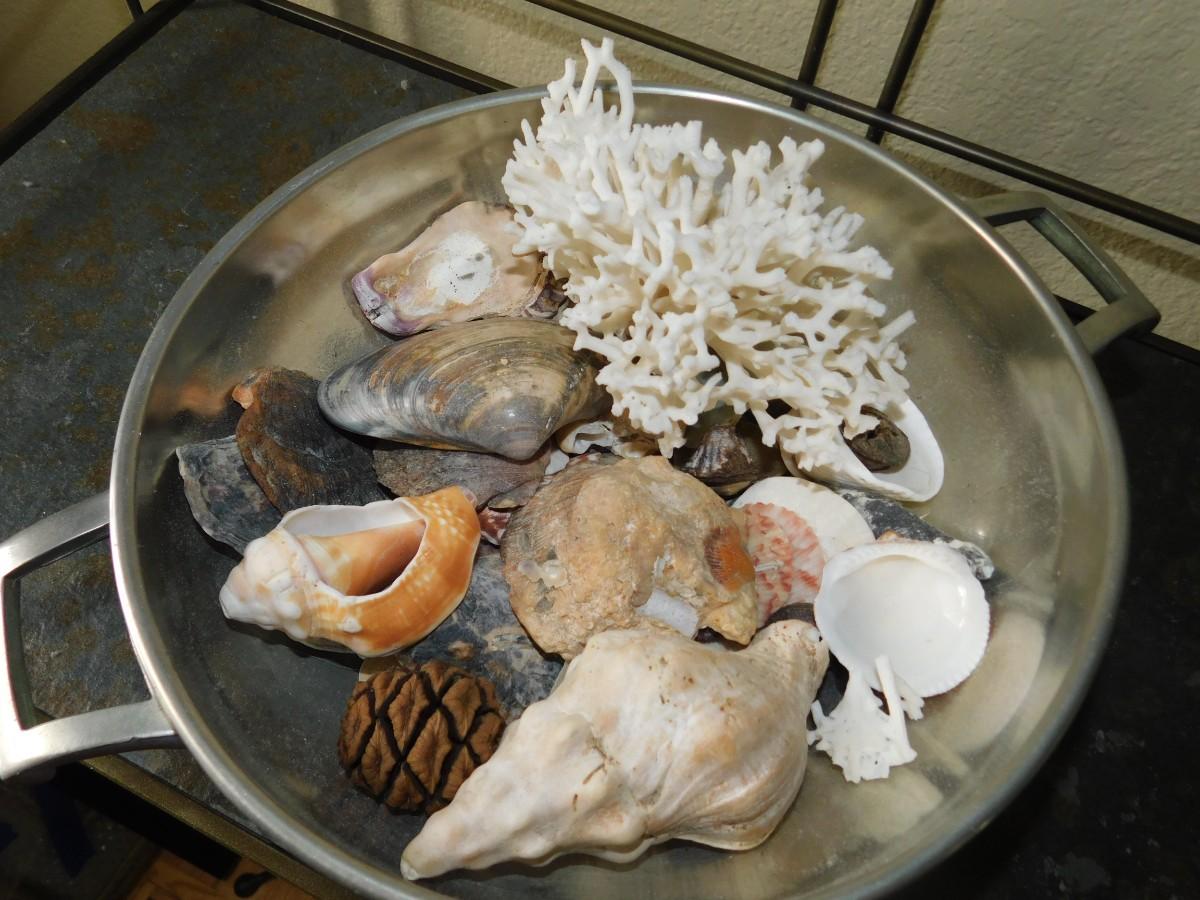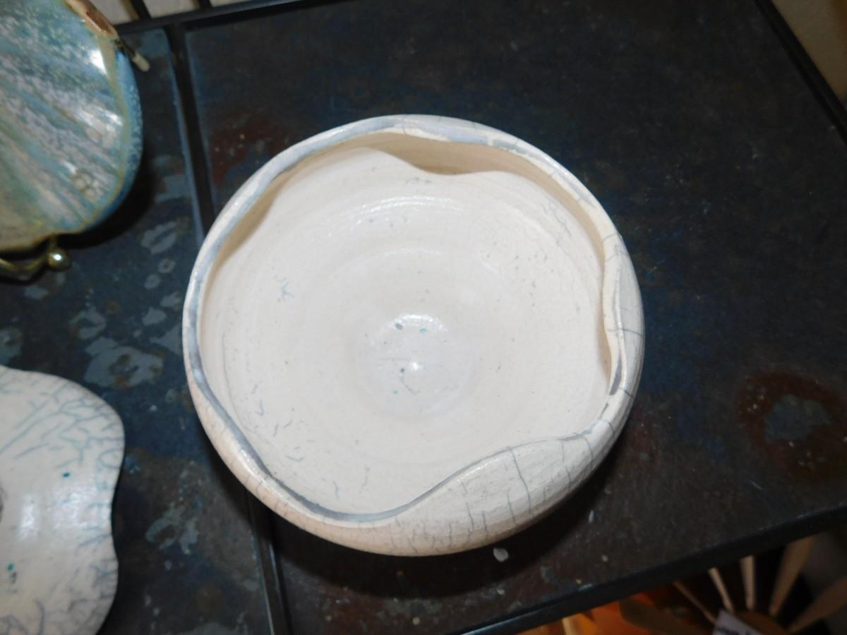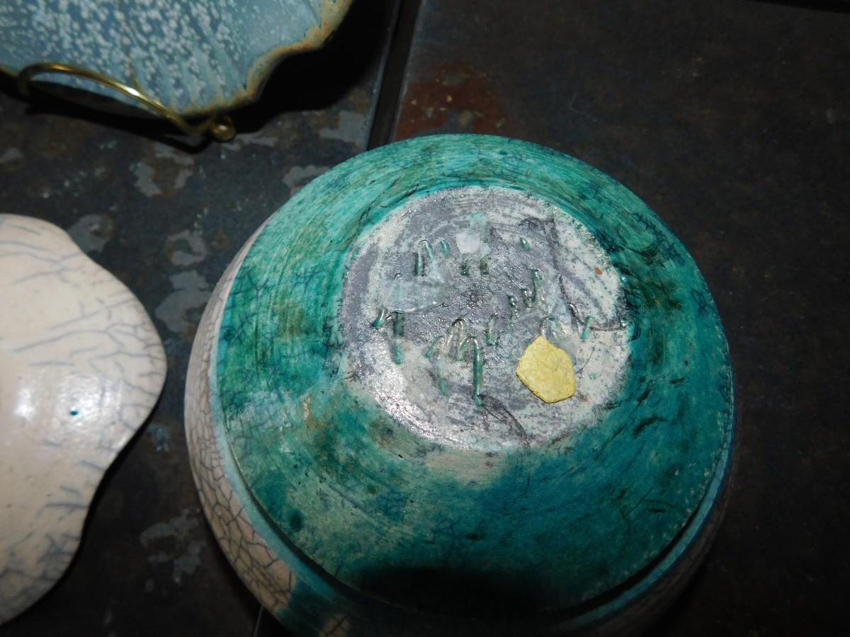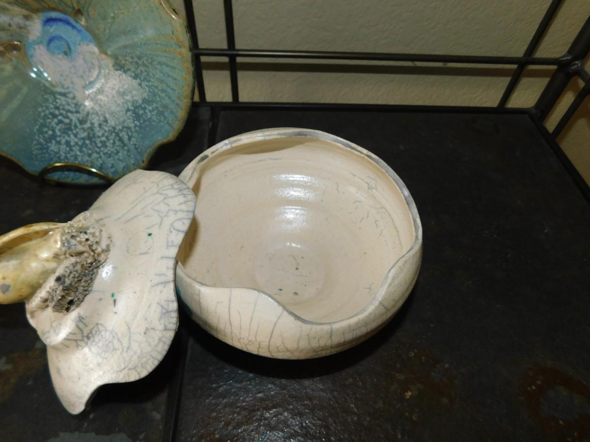 PEWTER DISH FULL OF SEA SHELLS AND SIMILAR SIGNED POTTERY