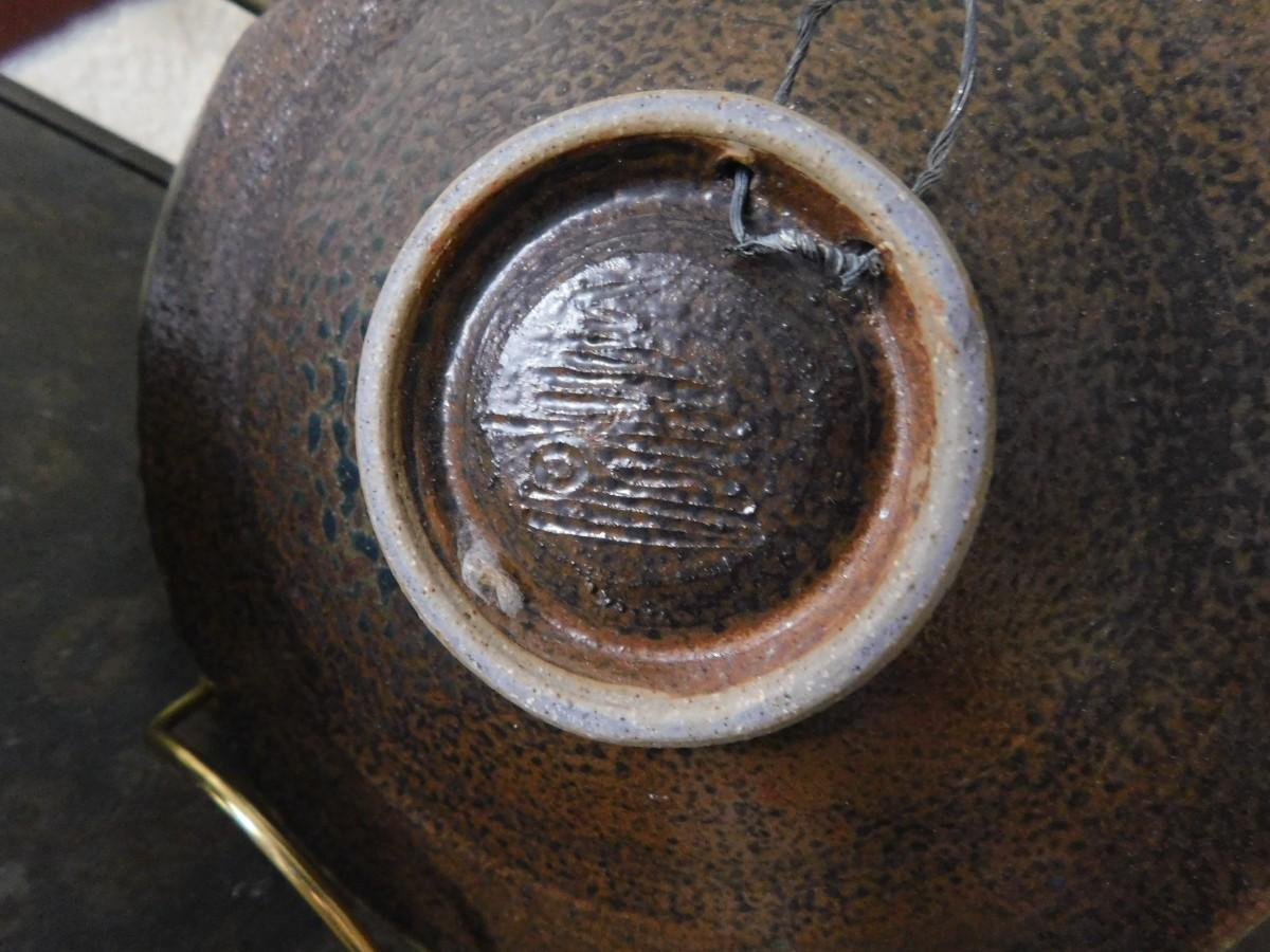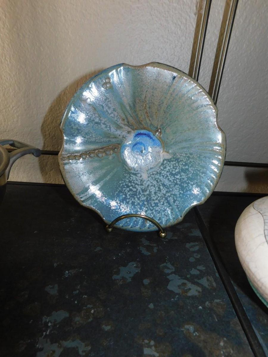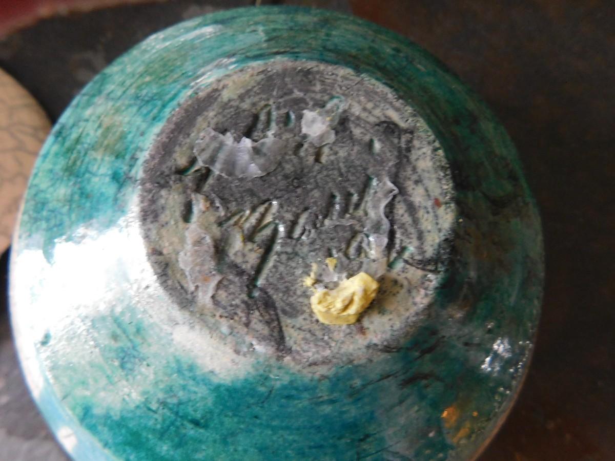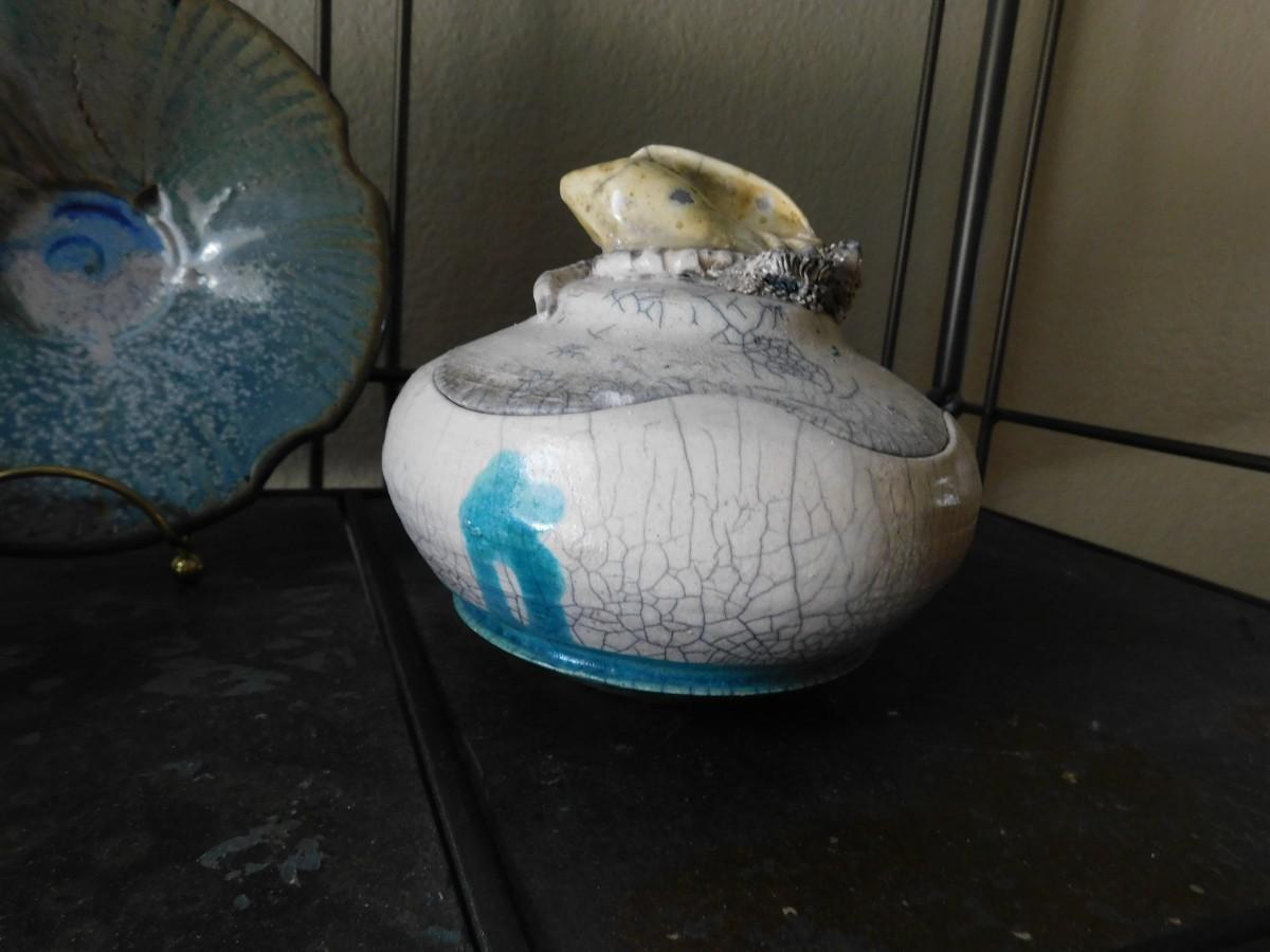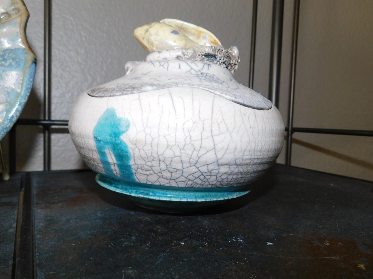 PEWTER DISH FULL OF SEA SHELLS AND SIMILAR SIGNED POTTERY