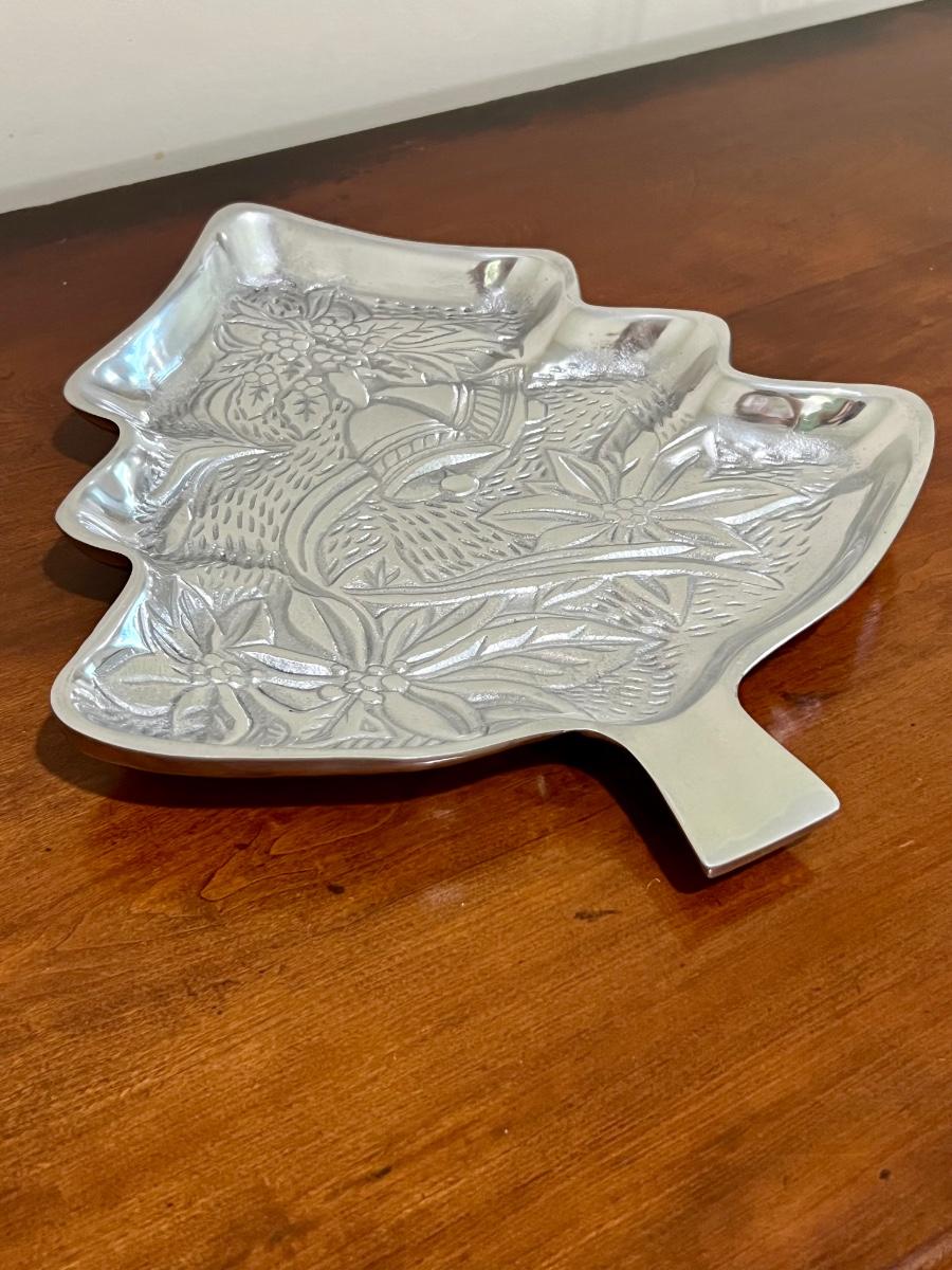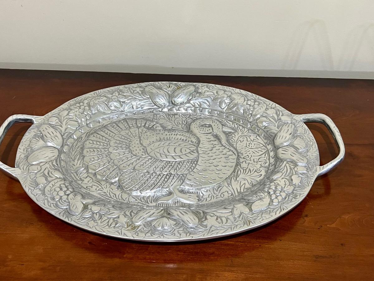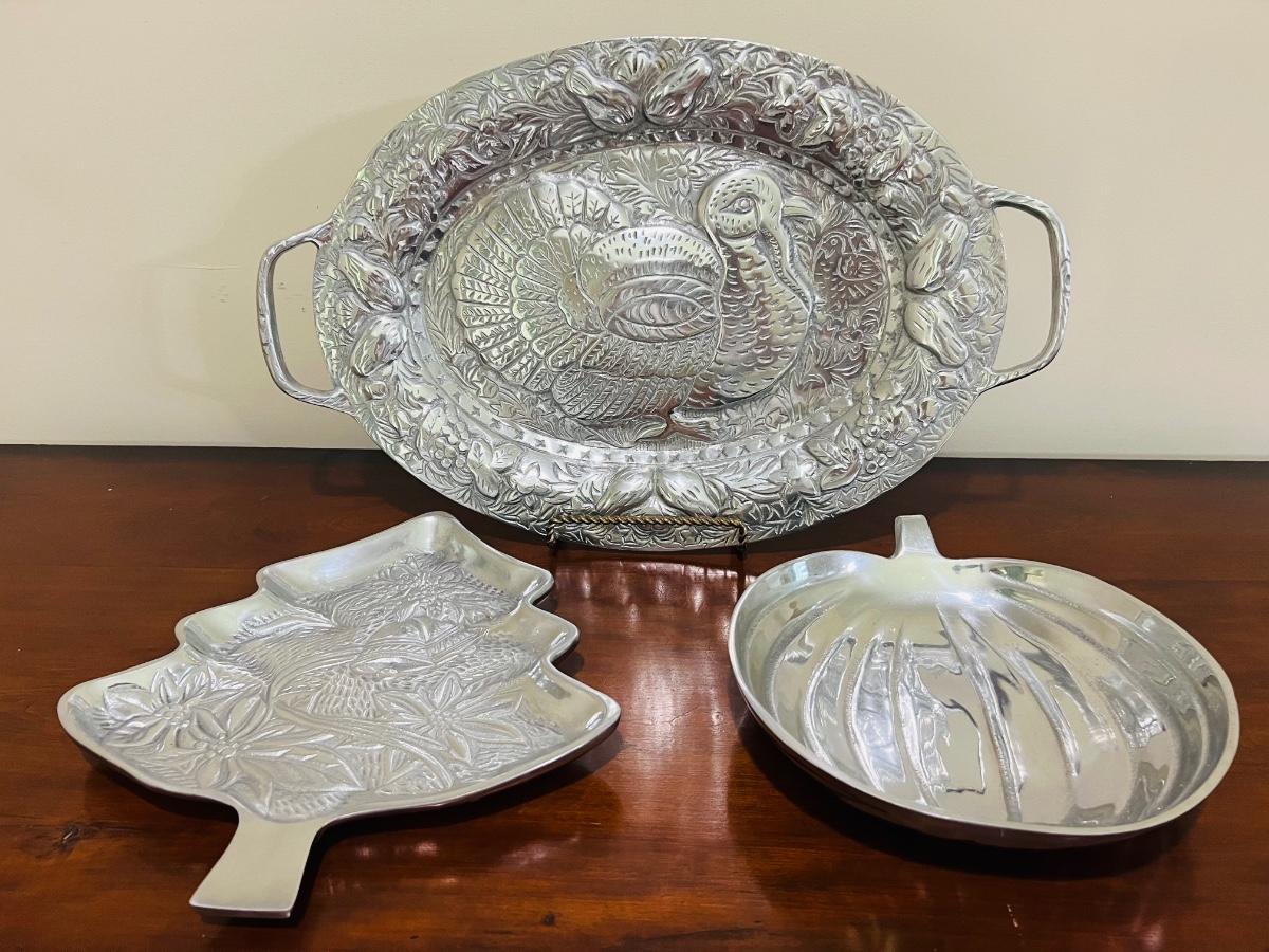 PEWTER Embossed Turkey Plater with handles. Measures 21 inches tall and 13 inches wide. Christmas tree measures 13 inches tall and 11 1/2 inches wide. Pumpkin Measures 10 1/2 inches tall and 9 1/2 inches wide. Tree and pumpkin marked made in India.